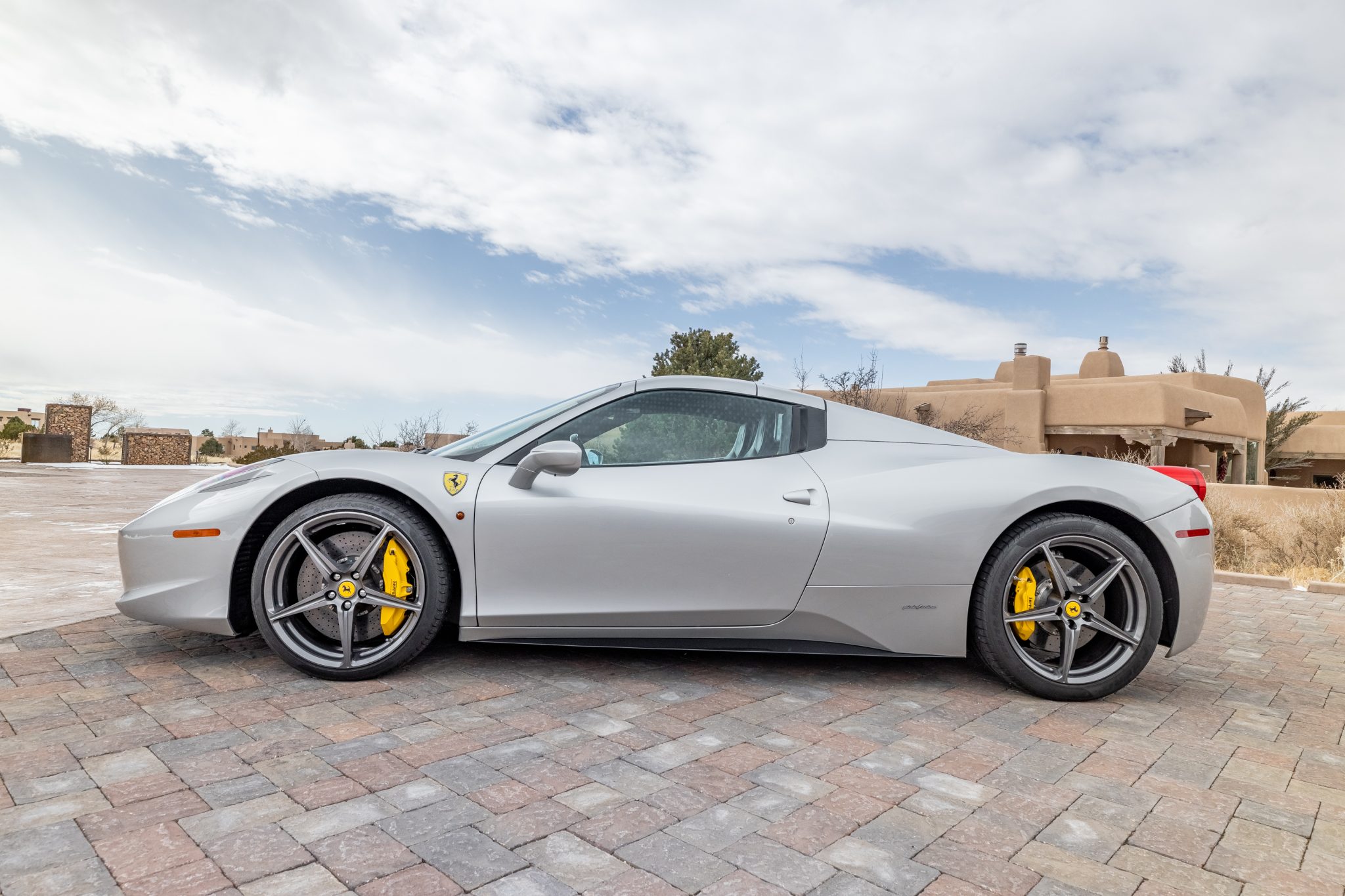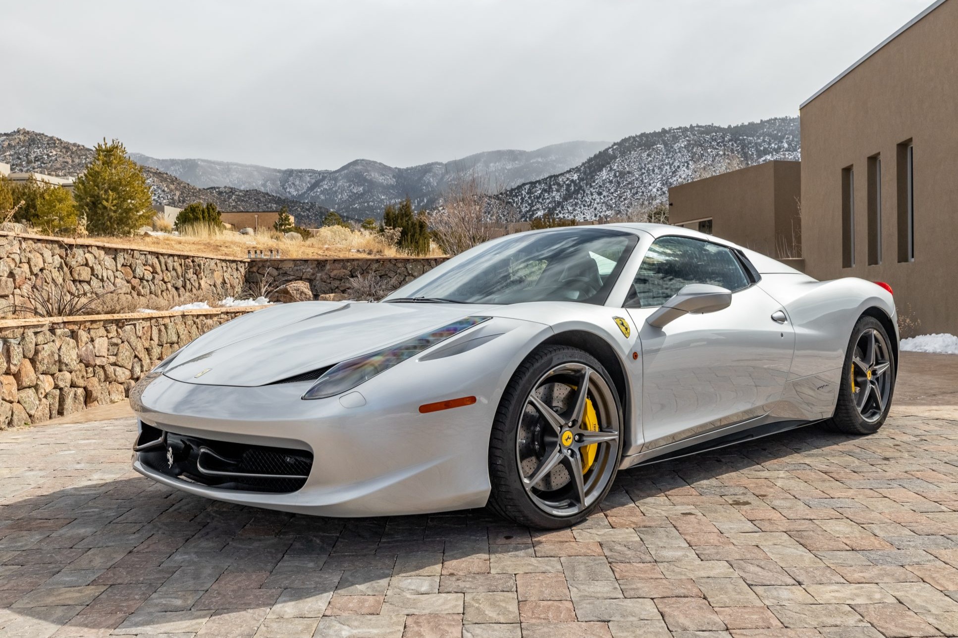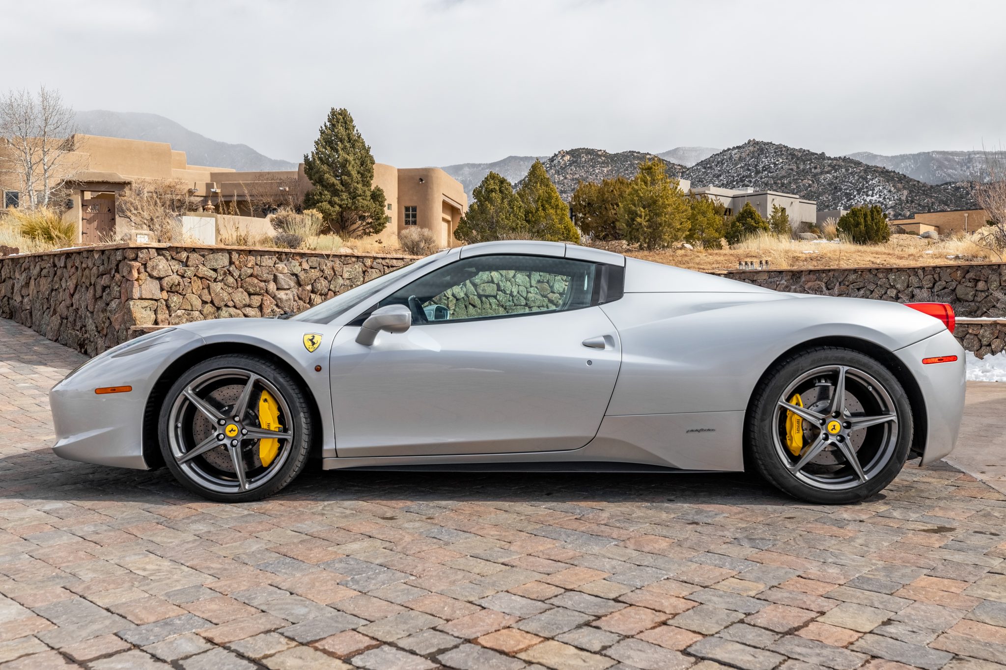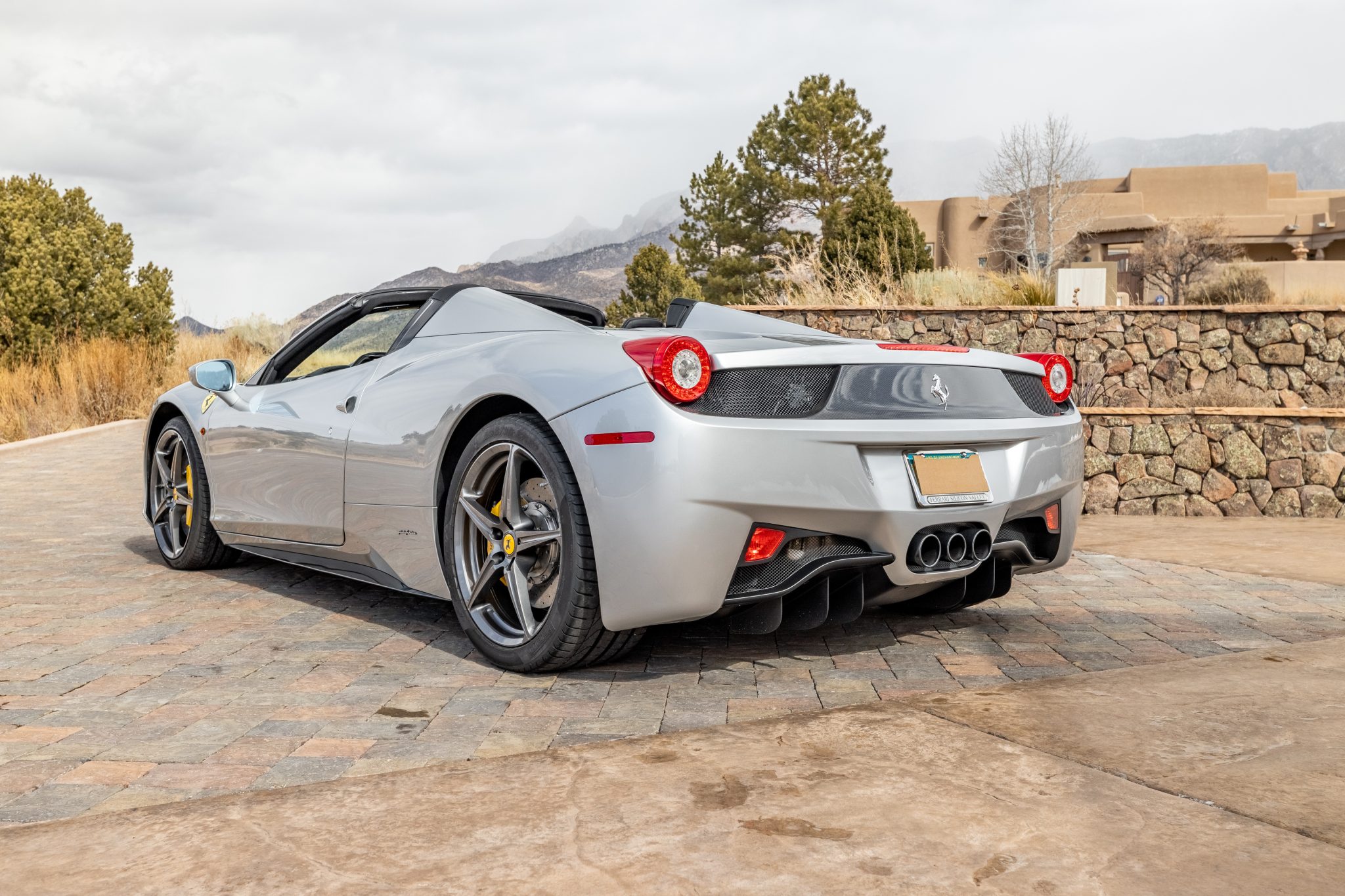 Gray-painted 20″ forged alloy wheels are wrapped in 235/35 front and 295/35 rear Pirelli P Zero tires mounted in 2018. The car is equipped with magnetorheological dampers, and braking is handled by yellow-finished Ferrari calipers over cross-drilled carbon-ceramic rotors at all four corners.