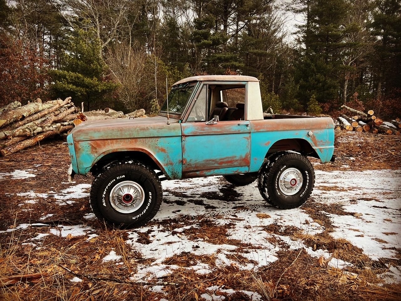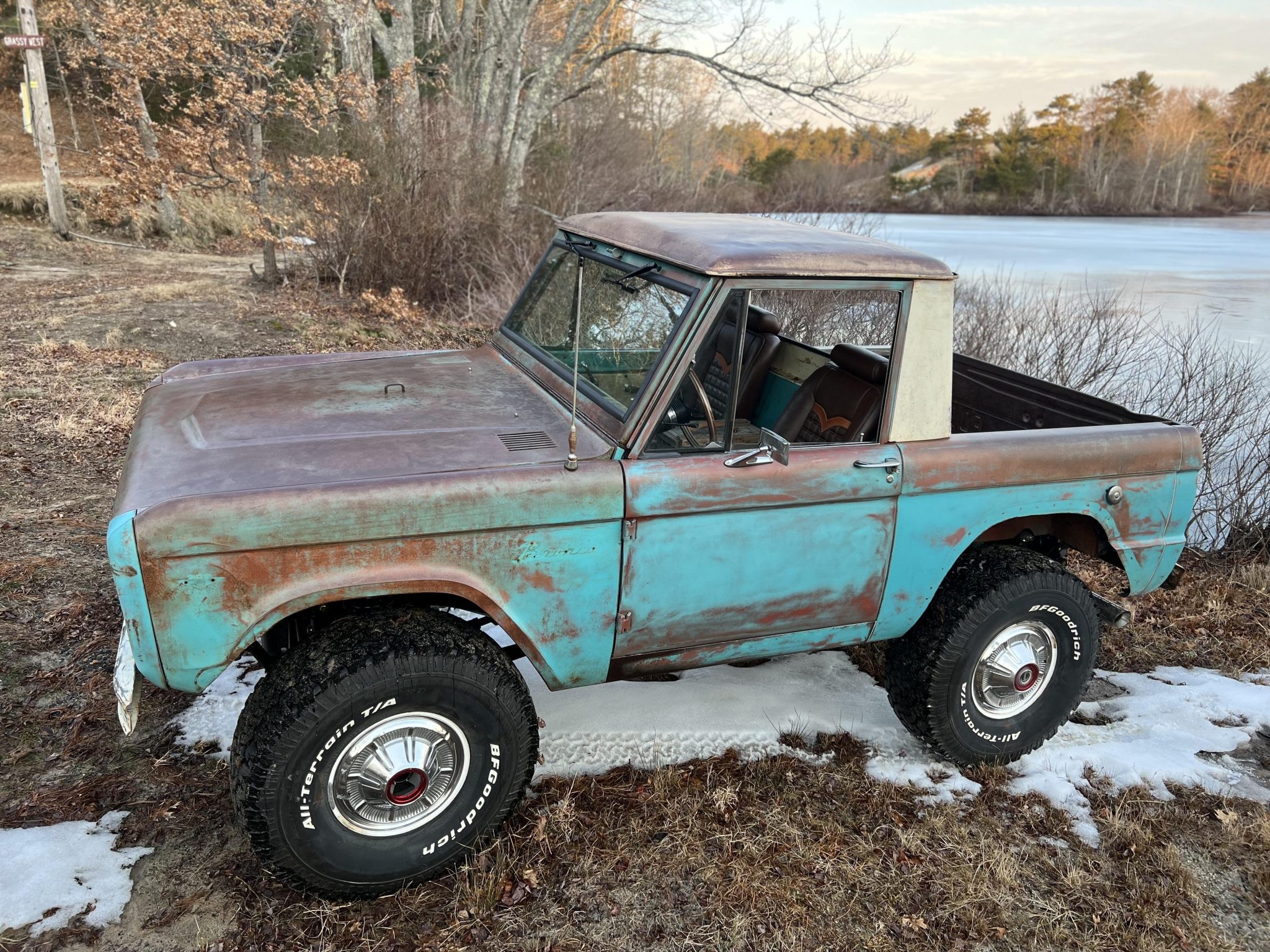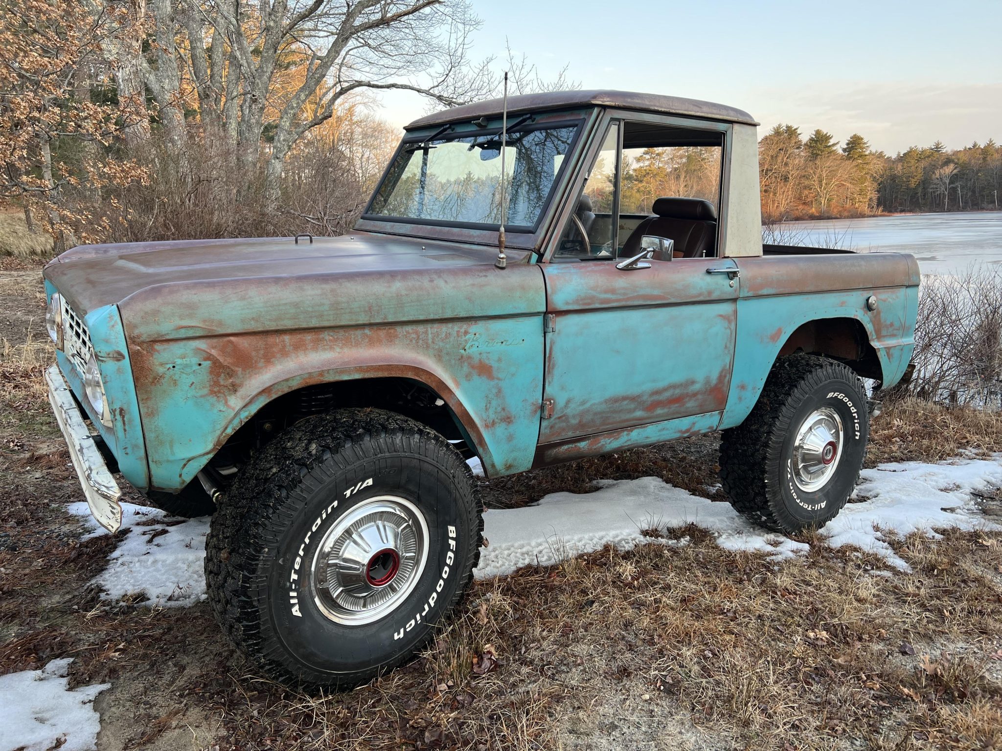 Replacement white 15″ steel wheels wear stock hubcaps and are mounted with 35×12.5″ BFGoodrich All-Terrain T/A KO tires. The rear fenders have been cut and the suspension lifted approximately 2.5″ to clear the larger rubber. Additional modifications include Bilstein shocks, a Borgeson power steering kit, and a power-assisted braking system with front discs. New bushings, bearings, and seals have been fitted according to the selling dealer.