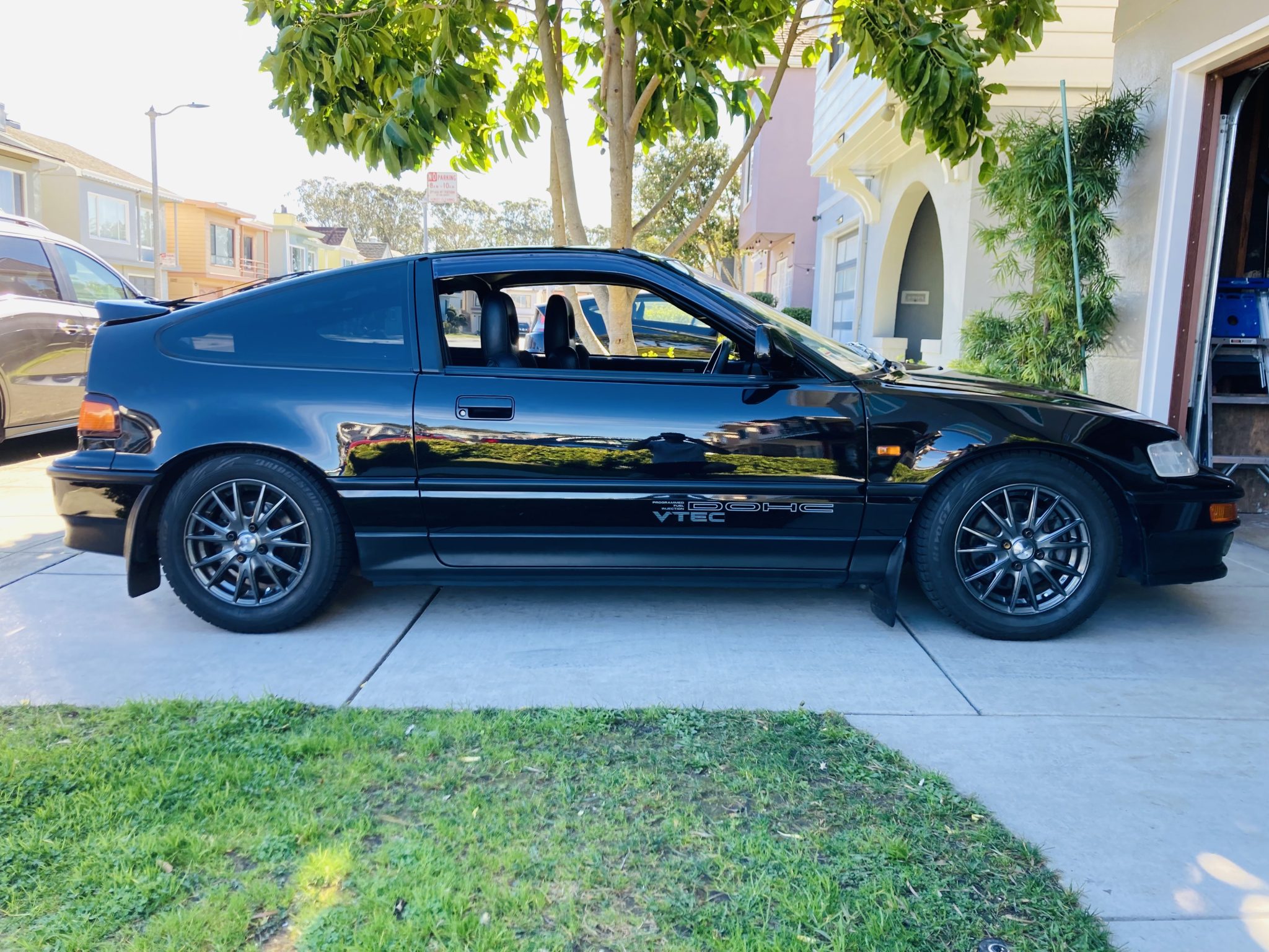 Four-lug 14″ aftermarket alloy wheels wear 175/65 Bridgestone Blizzak Revo GZ tires with date codes from 2015. Stopping is provided by four-wheel disc brakes and slotted rotors, and Osaka adjustable coilovers are installed.