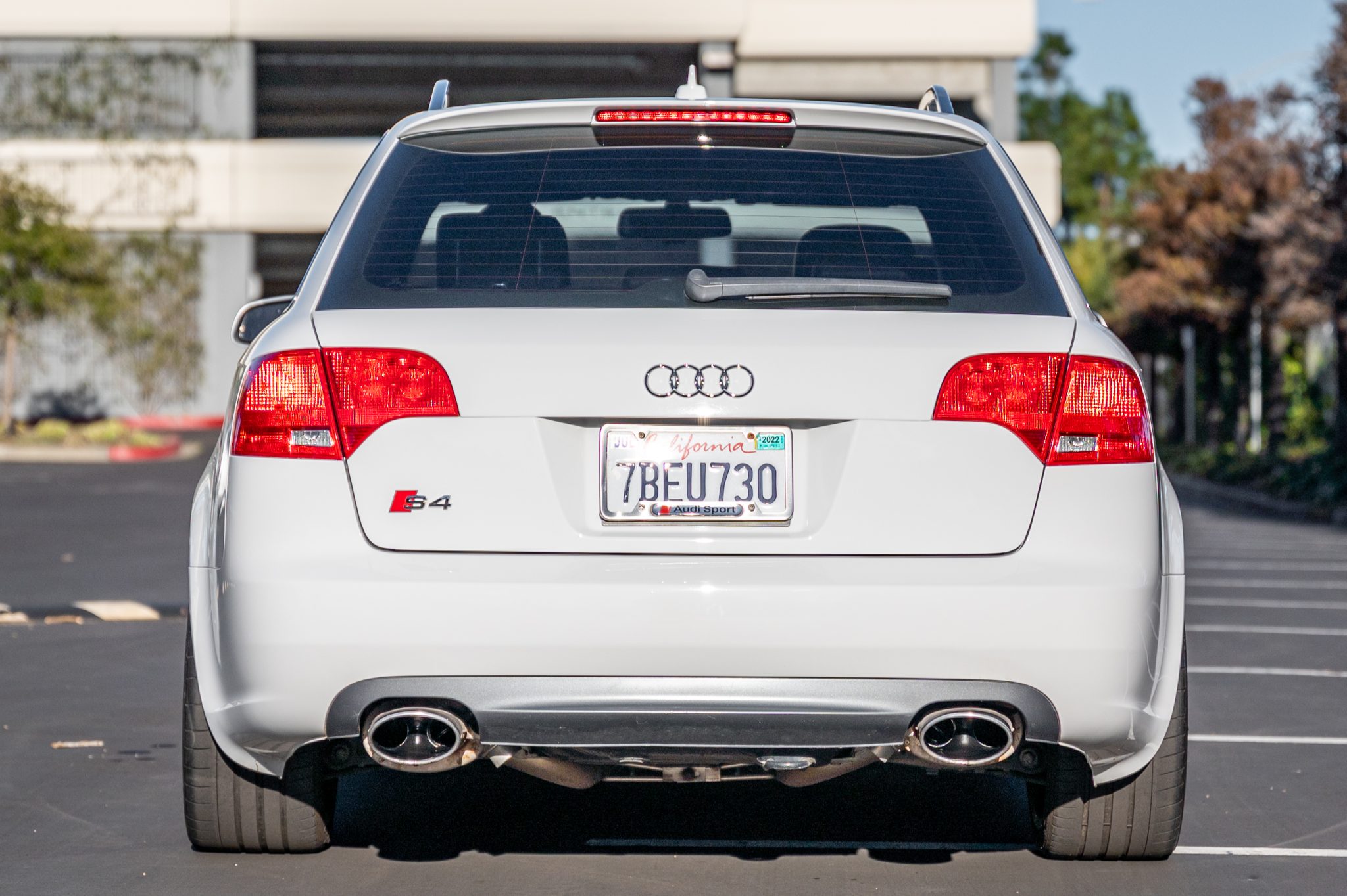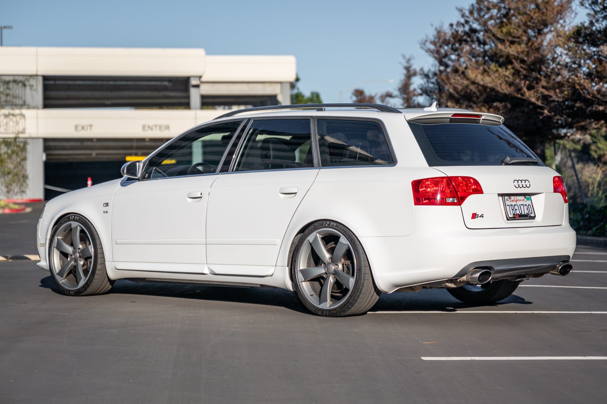 Five-spoke 19″ wheels from an RS5 are wrapped in 245/35 Michelin Pilot Super Sport tires. A Stasis-Ohlins adjustable coilover suspension system is fitted along with a Neuspeed rear sway bar.