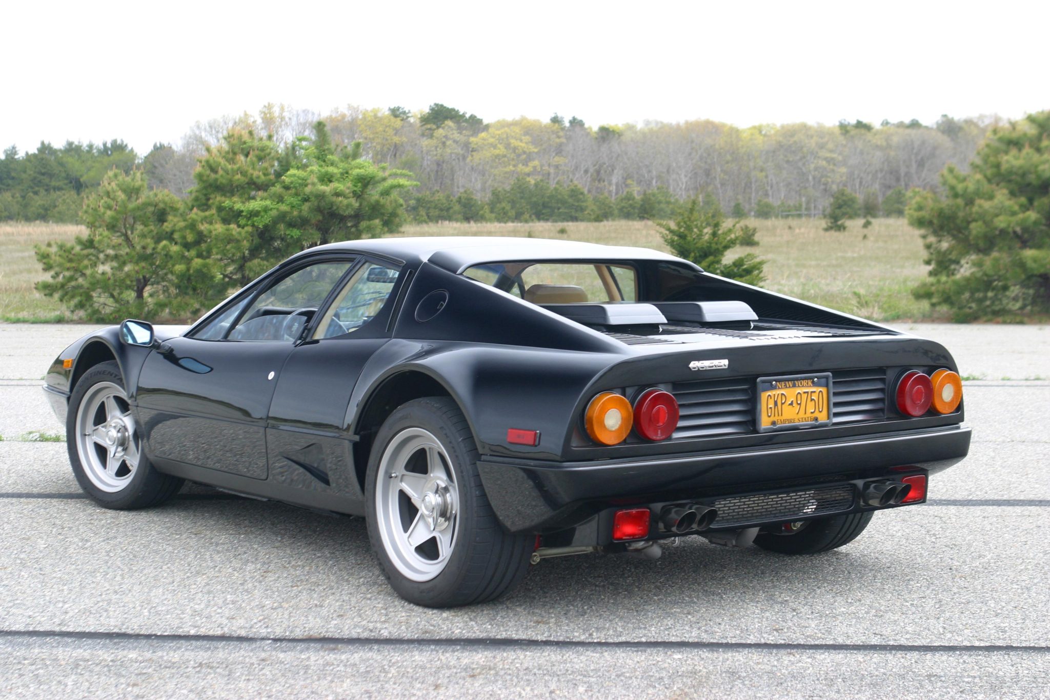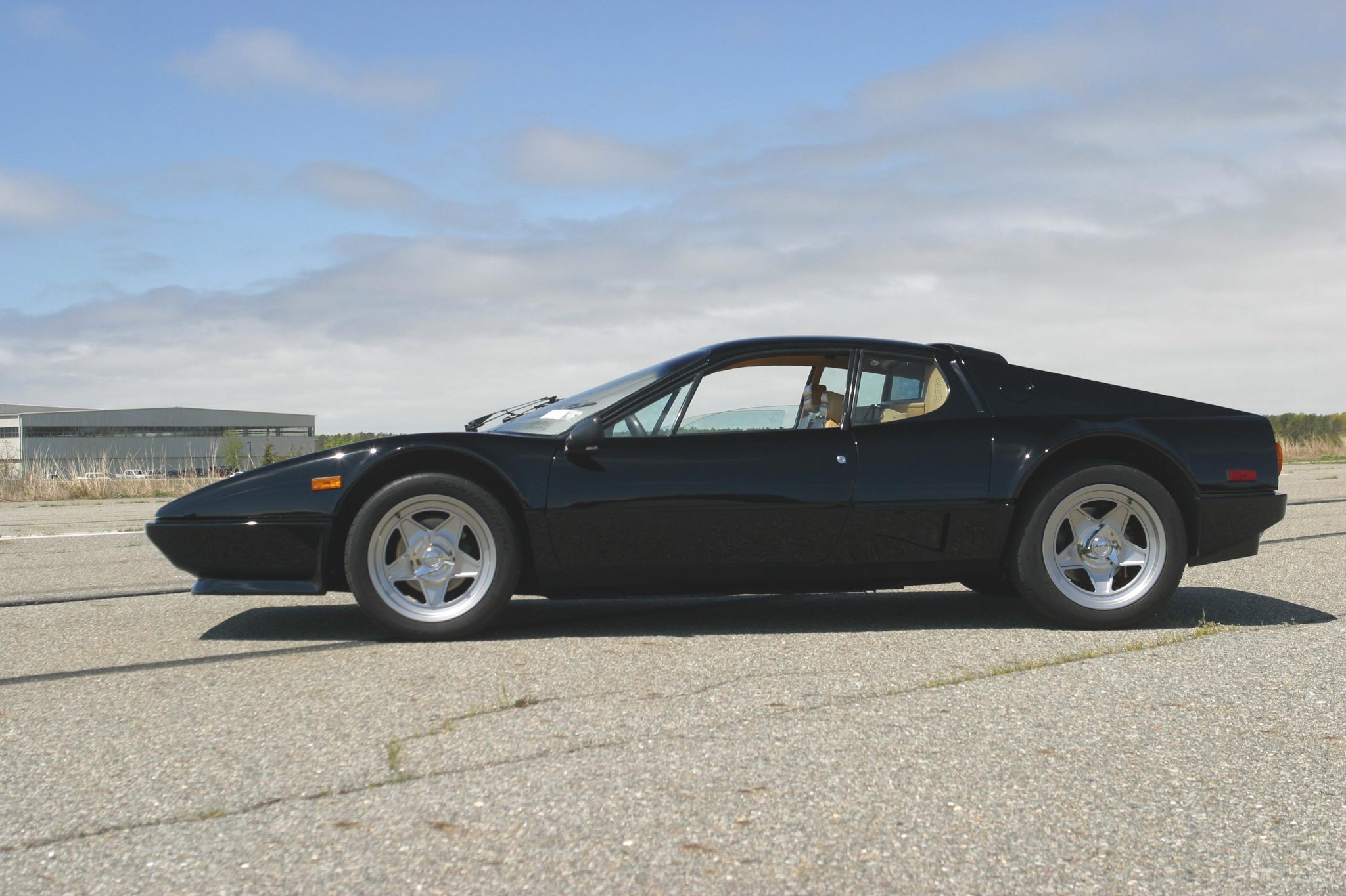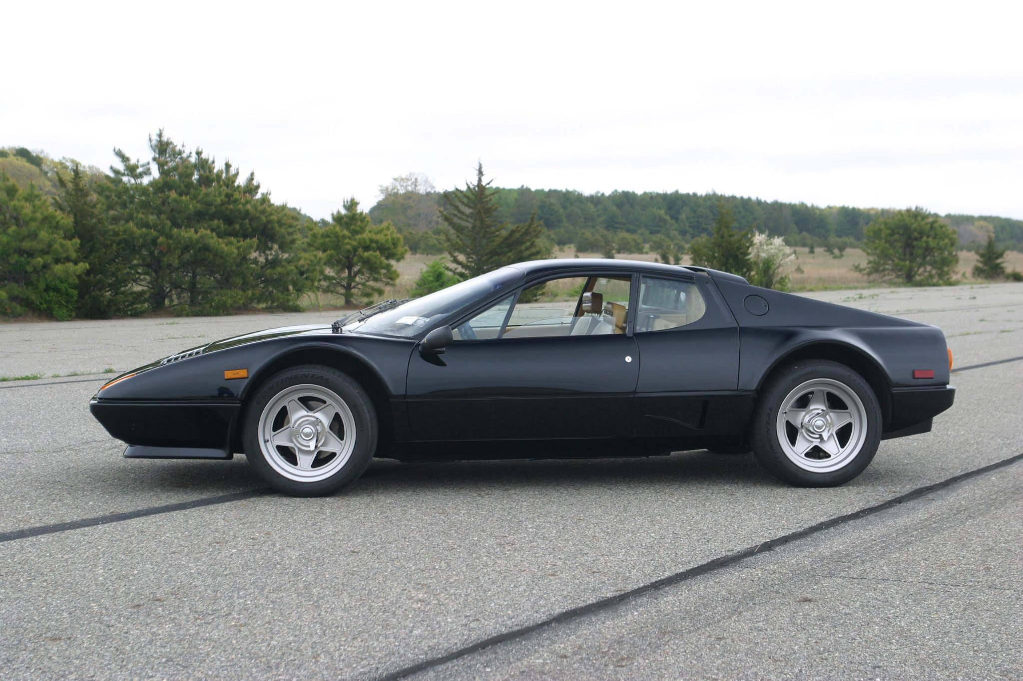 This example is finished in black with a silver front clamshell grille and features a front spoiler, front and rear fog lights, side markers, adjustable mirrors, a rear high-mount spoiler, and NACA ducts aft of the doors. The front valance is said to have been repainted under the seller’s ownership. The pop-up headlights can be seen raised in the gallery along with a collection of Saint Gobain and Sigla glass etchings. Paint blemishes and a chip on one of the rear flying buttresses can also be seen in the gallery.