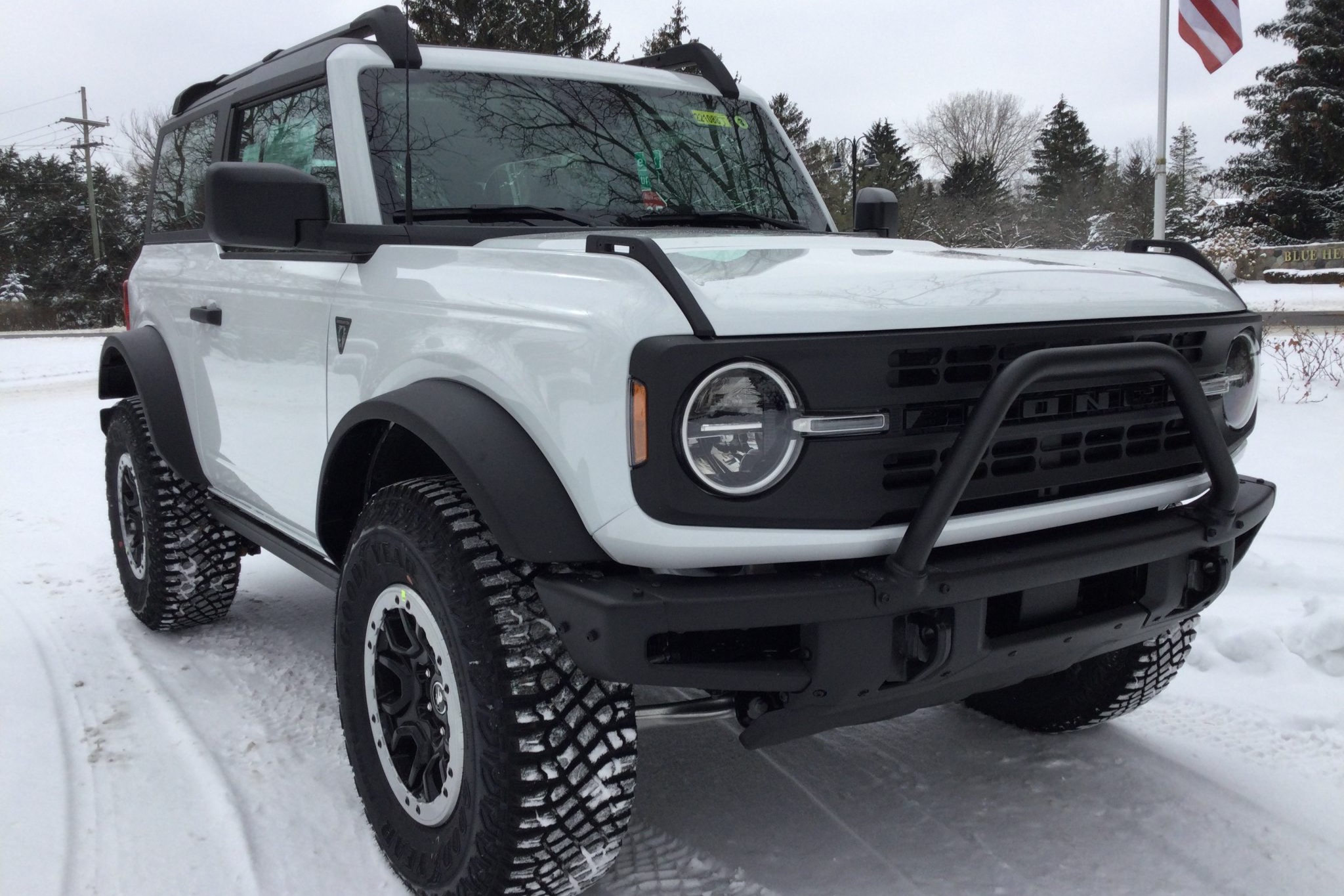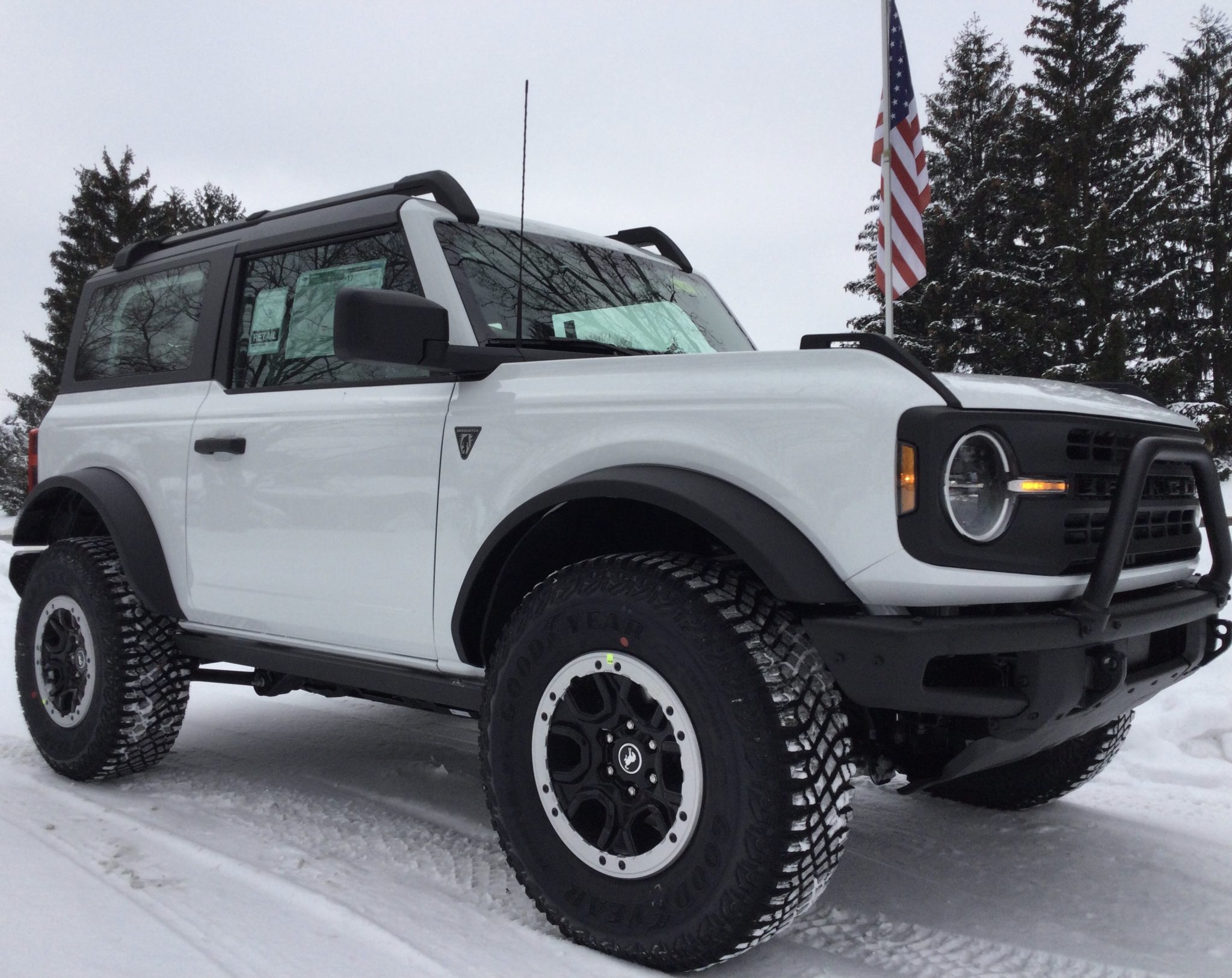 Factory 17″ wheels are beadlock-capable and are wrapped in 315/70 Goodyear Territory MT tires, and a matching spare wheel and tire are mounted to the tailgate. The truck is equipped with the Sasquatch package which added front and rear locking differentials as well as Bilstein dampers. Additional equipment includes a Terrain Management System (TMS) with selectable “Goes Over Any Type of Terrain” (G.O.A.T) drive modes.