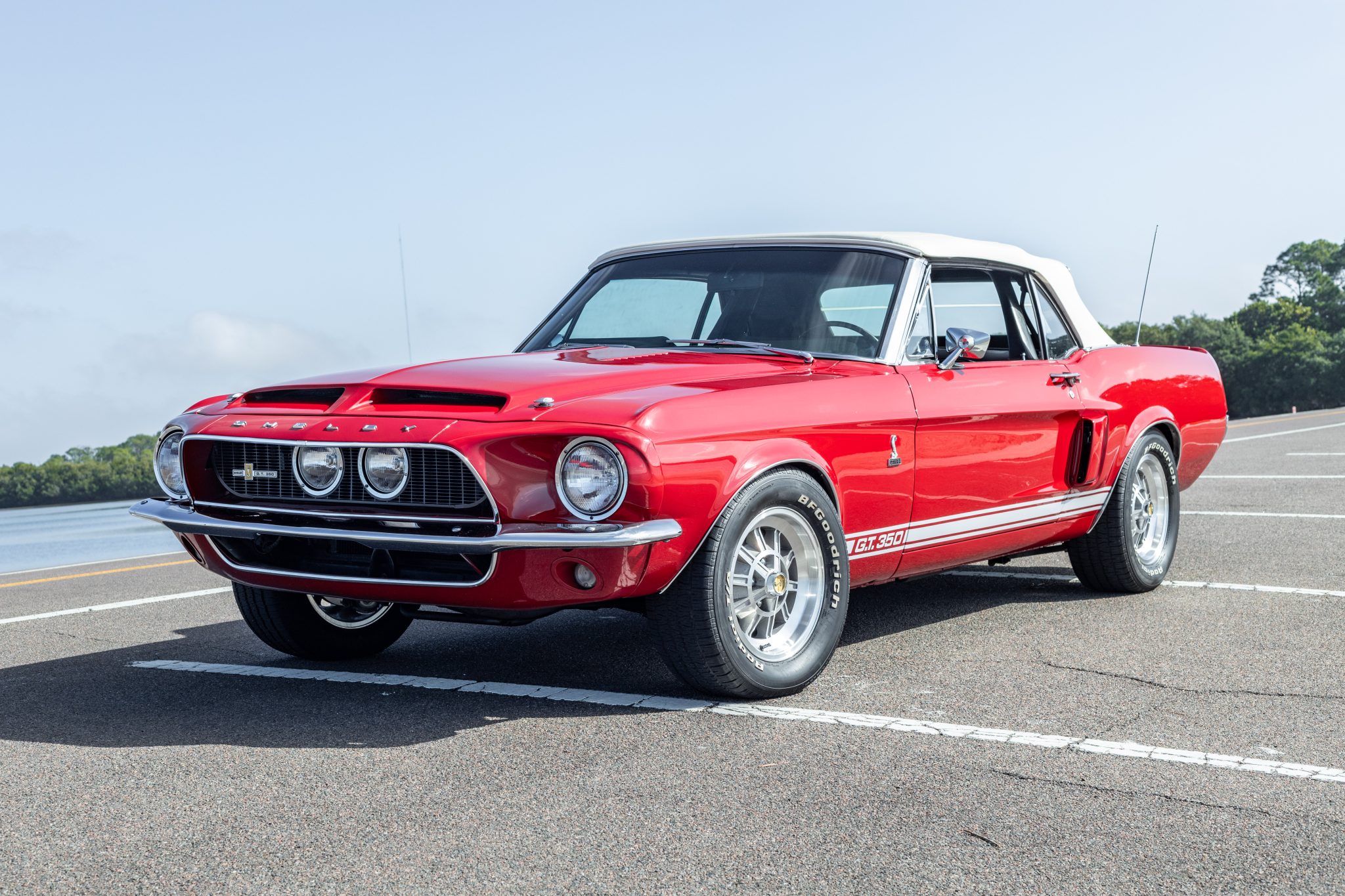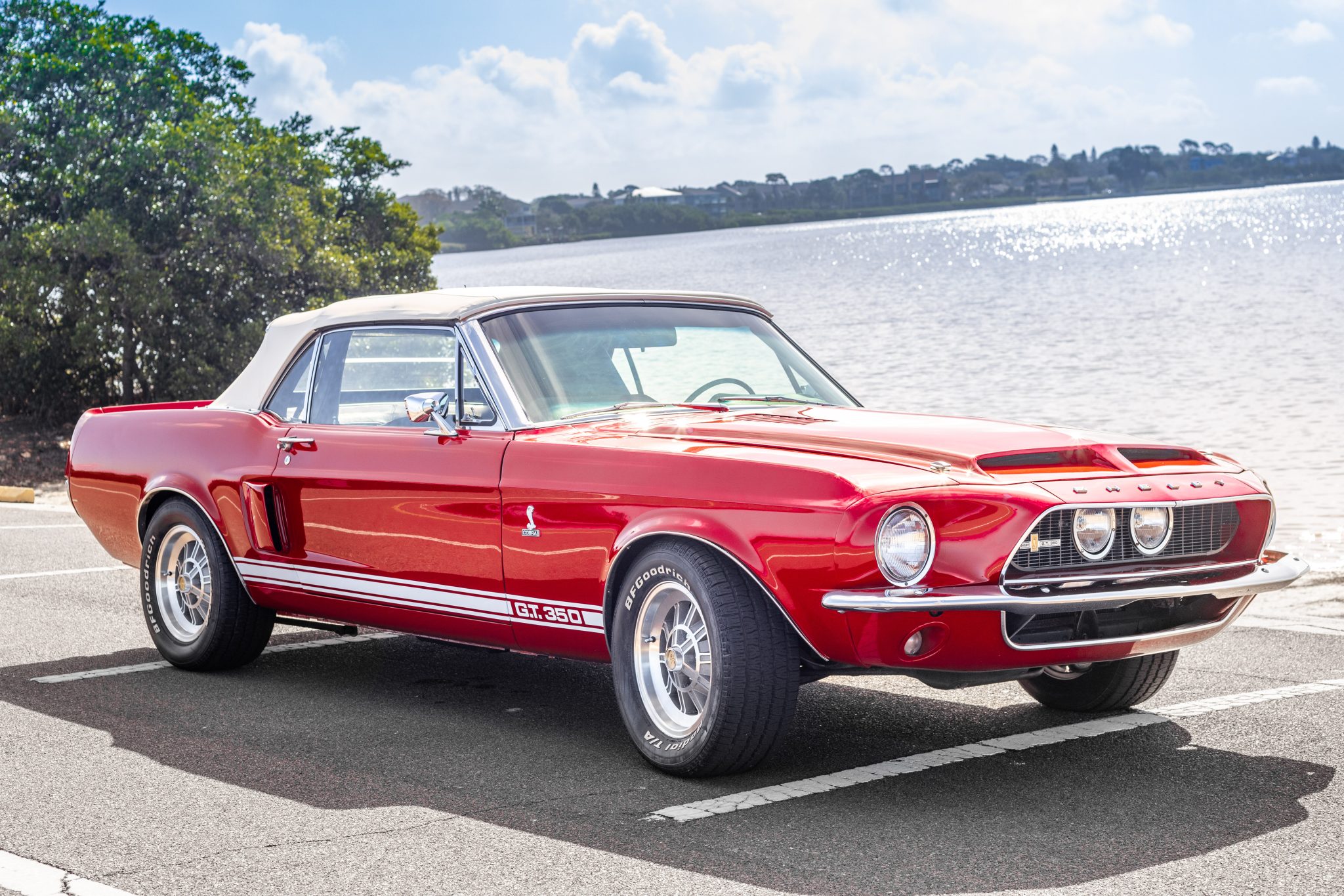 Shelby-style 10-spoke 15″ alloy wheels are mounted with 235/60 BFGoodrich Radial T/A white-letter tires. Stopping power is by Wilwood calipers front and rear, and the seller notes that the power-steering unit squeaks.