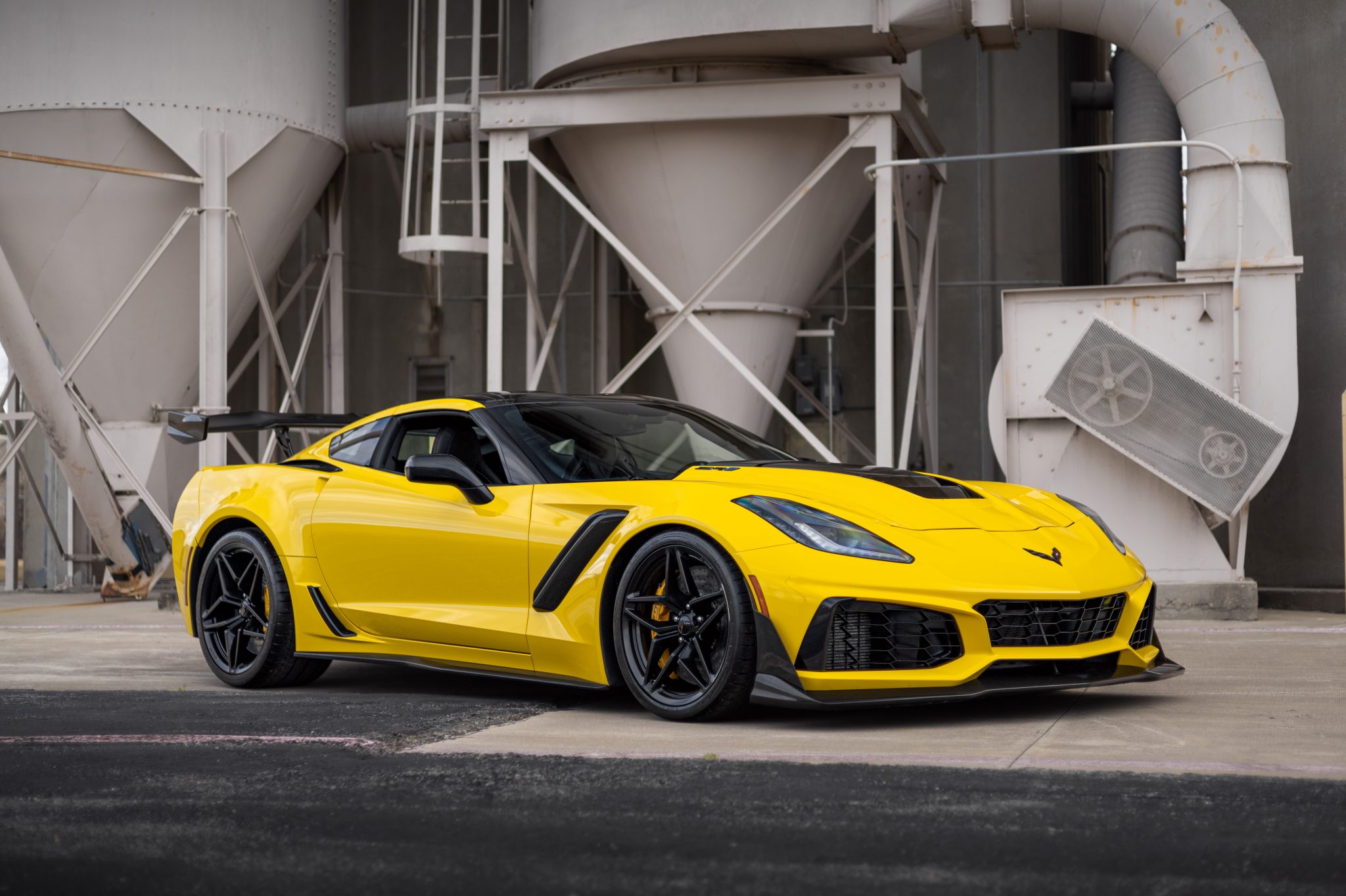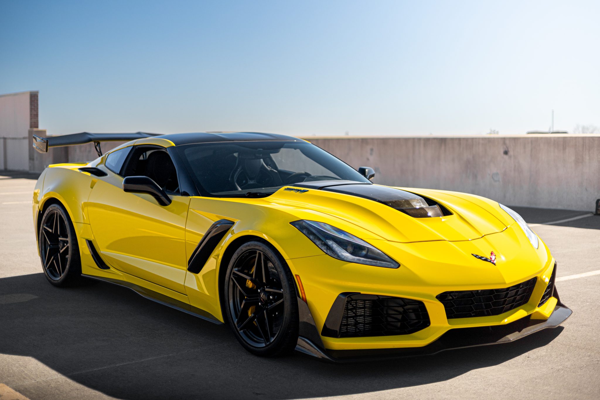 ZR1-specific 19 and 20-inch alloy wheels finished in Carbon Flash are wrapped in Michelin Pilot Super Sport tires sized 285/50 up front and 335/25 out back. The car is equipped with the ZTK Track Performance Package, which added increased spring rates. Braking is handled by cross-drilled carbon-ceramic discs with yellow-finished Brembo calipers.