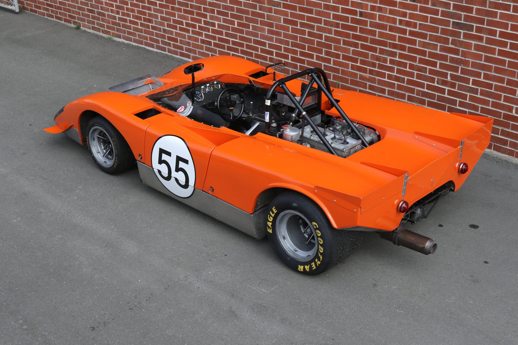 The 13″ multi-piece wheels feature three-eared knock-off hubs and are mounted with Goodyear Eagle slicks. A matching set of wheels with AVON tires is included in the sale. The T212 features an aluminum monocoque chassis with an independent front suspension and a multi-link rear setup. Penske DA 7500 series non-reservoir shock absorbers were fitted under current ownership along with a CV joint conversion. Stopping power is provided by Girling two-piston calipers over discs at all four corners. An incident at Watkins Glen in 1973 reportedly damaged the right-rear magnesium hub, although the part has reportedly remained fitted since.
