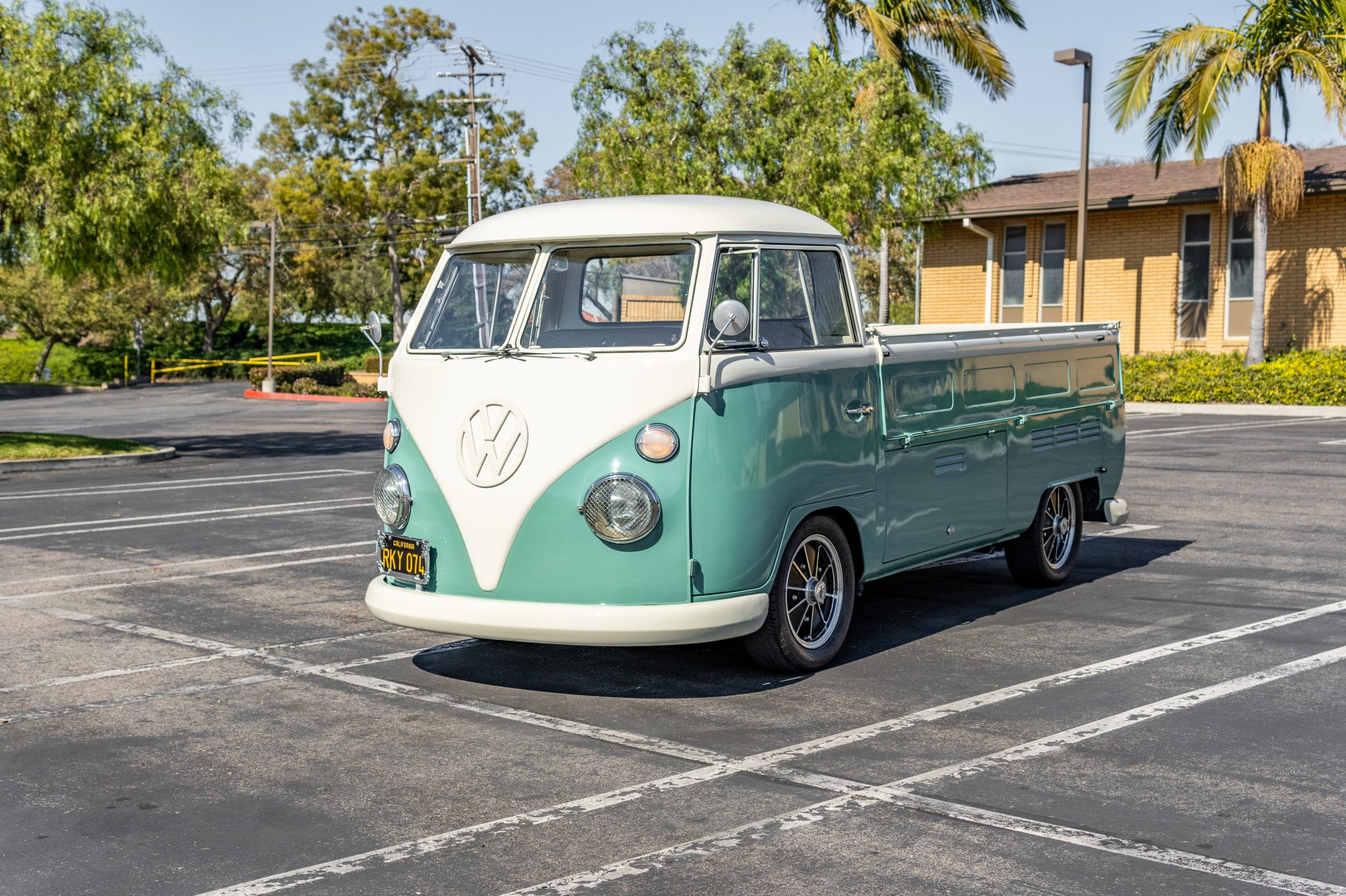 A lower storage compartment is accessible via flip-up doors. BRM-style 15″ wheels sourced from EMPI are mounted with 195/60 Uniroyal and Negotiator tires, and a spare wheel and tire is stored in the aforementioned compartment. According to the seller, the ride height has been lowered, and braking is handled by discs up front and drums out back.