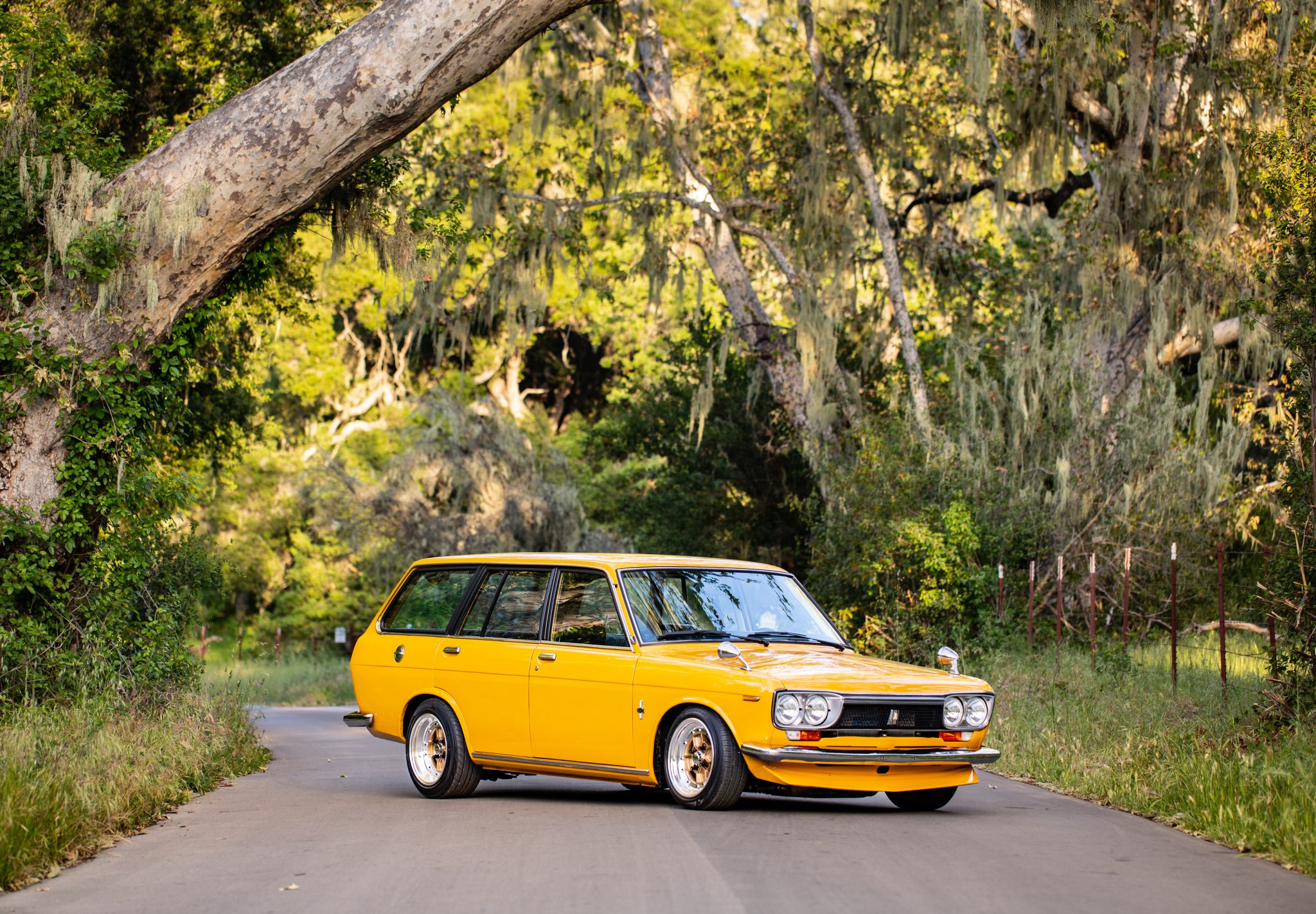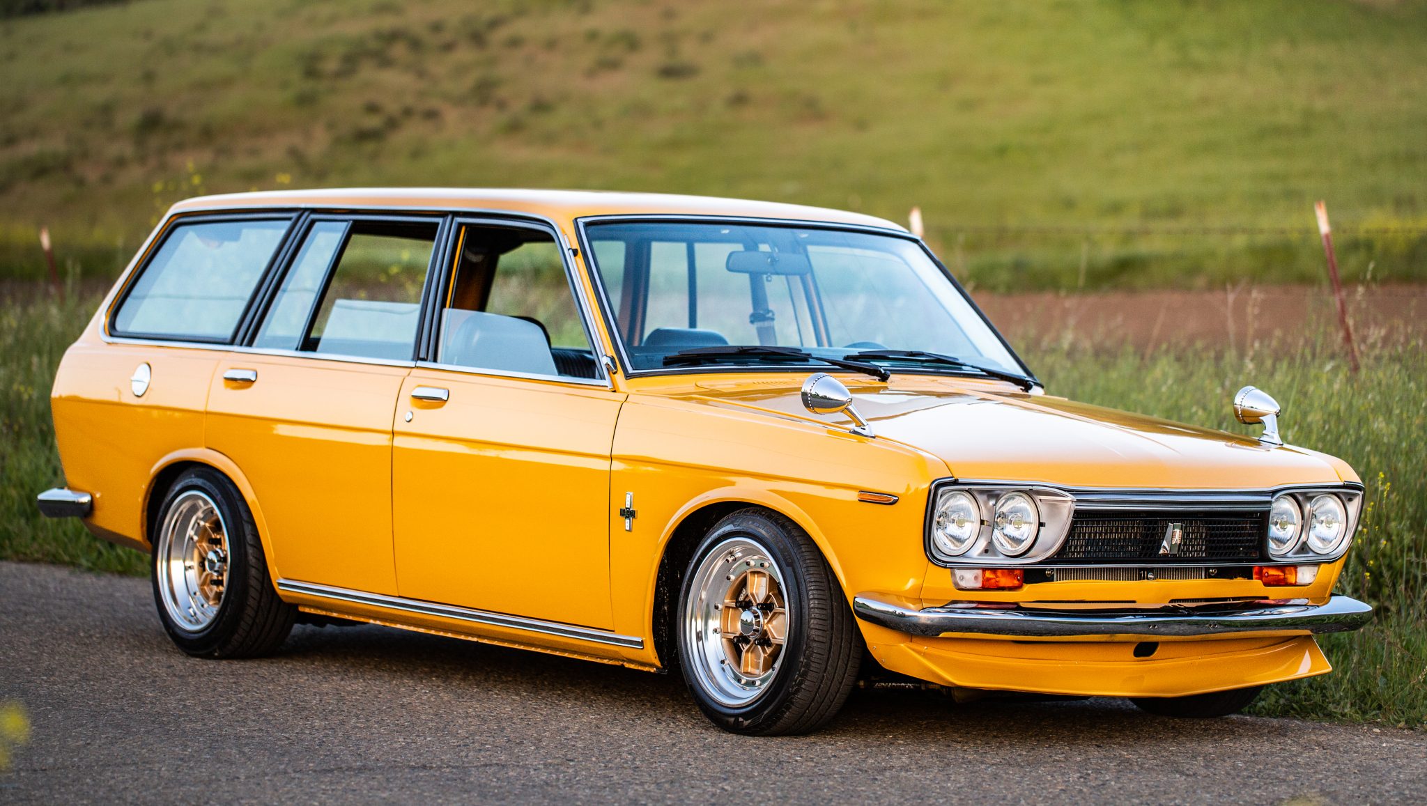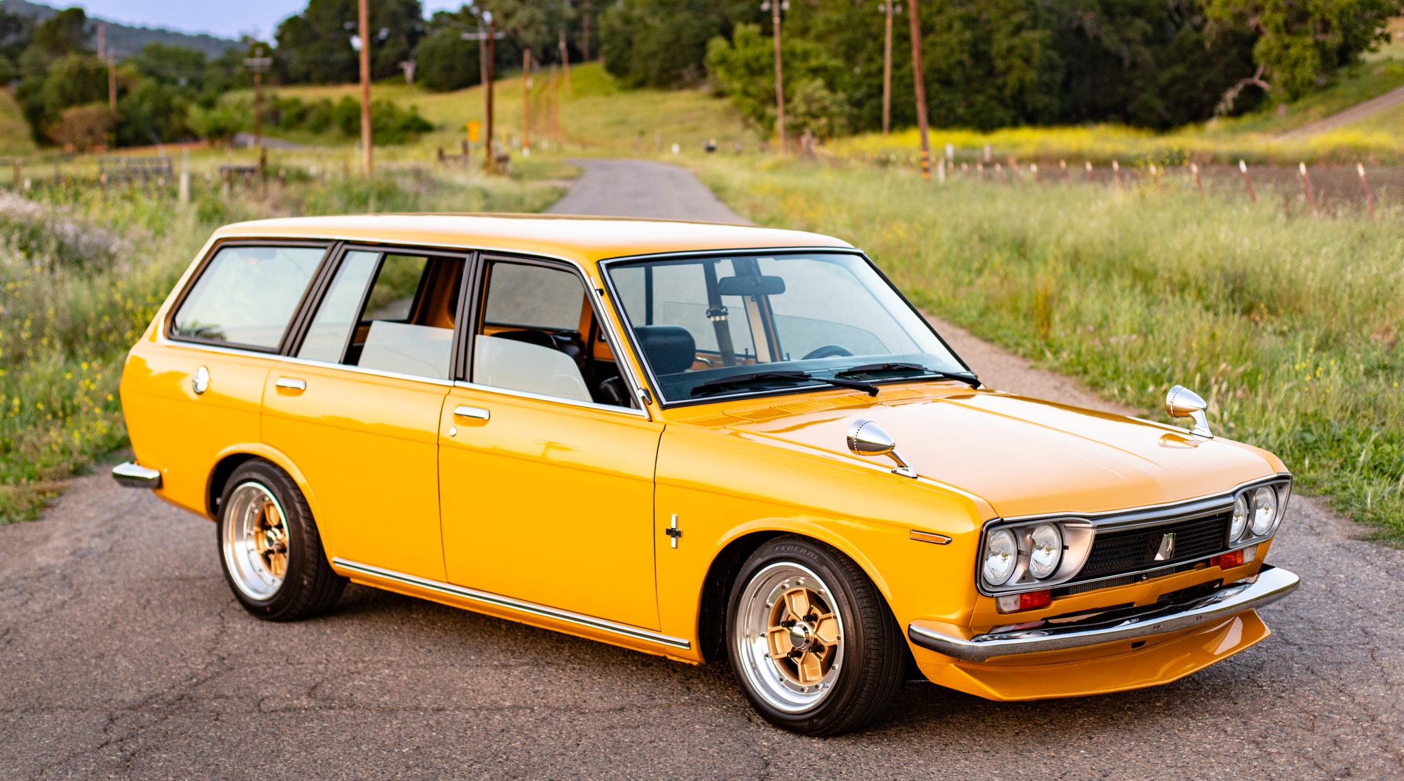 Gold-faced 14″ Crimson Zed Compe Spoke 4 wheels were produced from 1978 to 1980 and are mounted with polished barrels and a mix of Federal and Yokohama tires. Wilwood front disc brakes have been installed along with a rear-brake assembly from a Mazda RX-7, and the suspension has been modified with the following components: