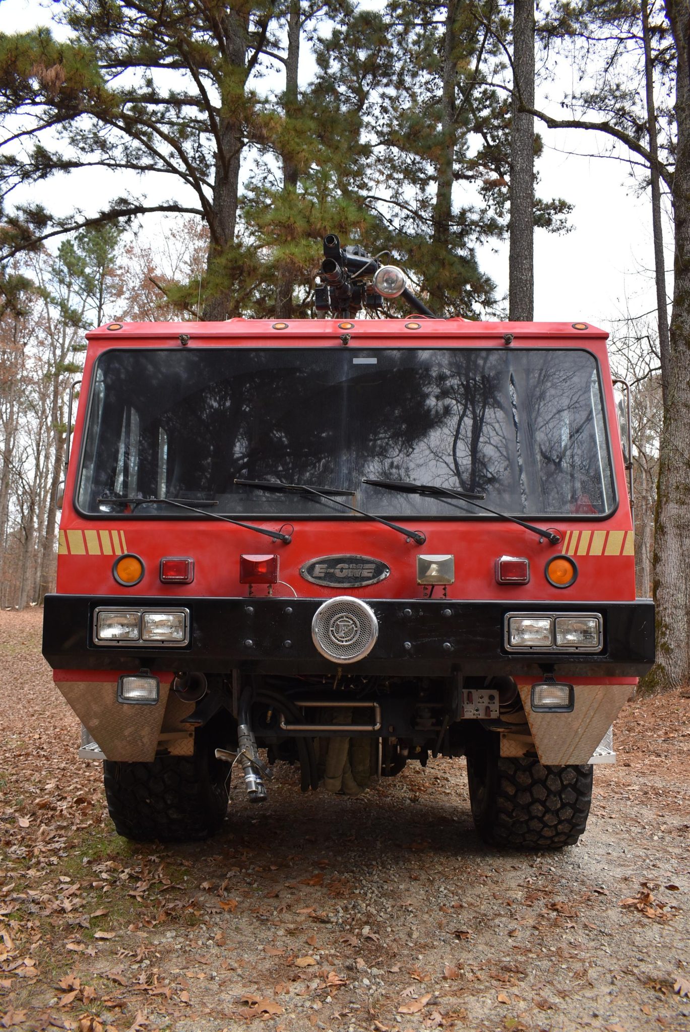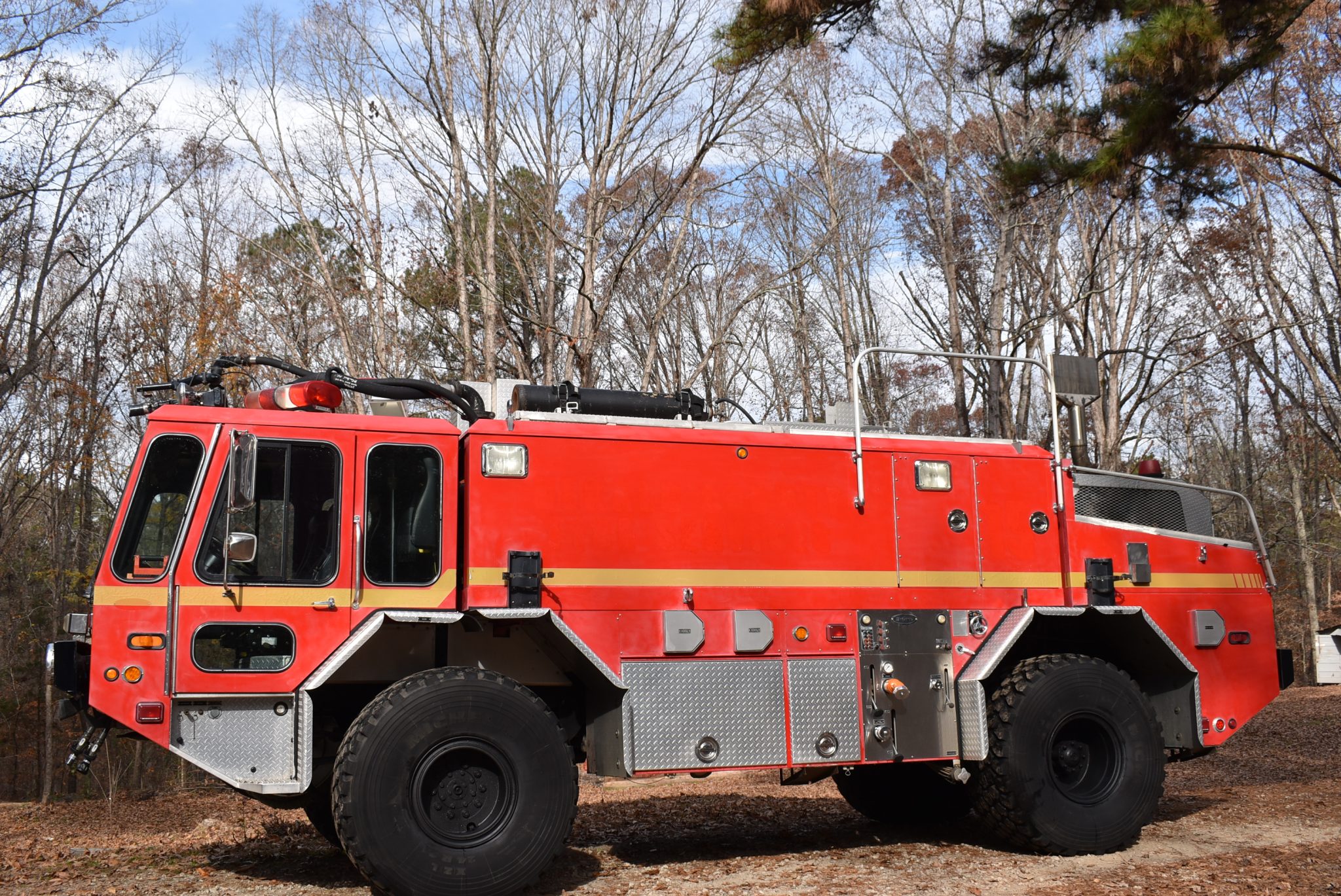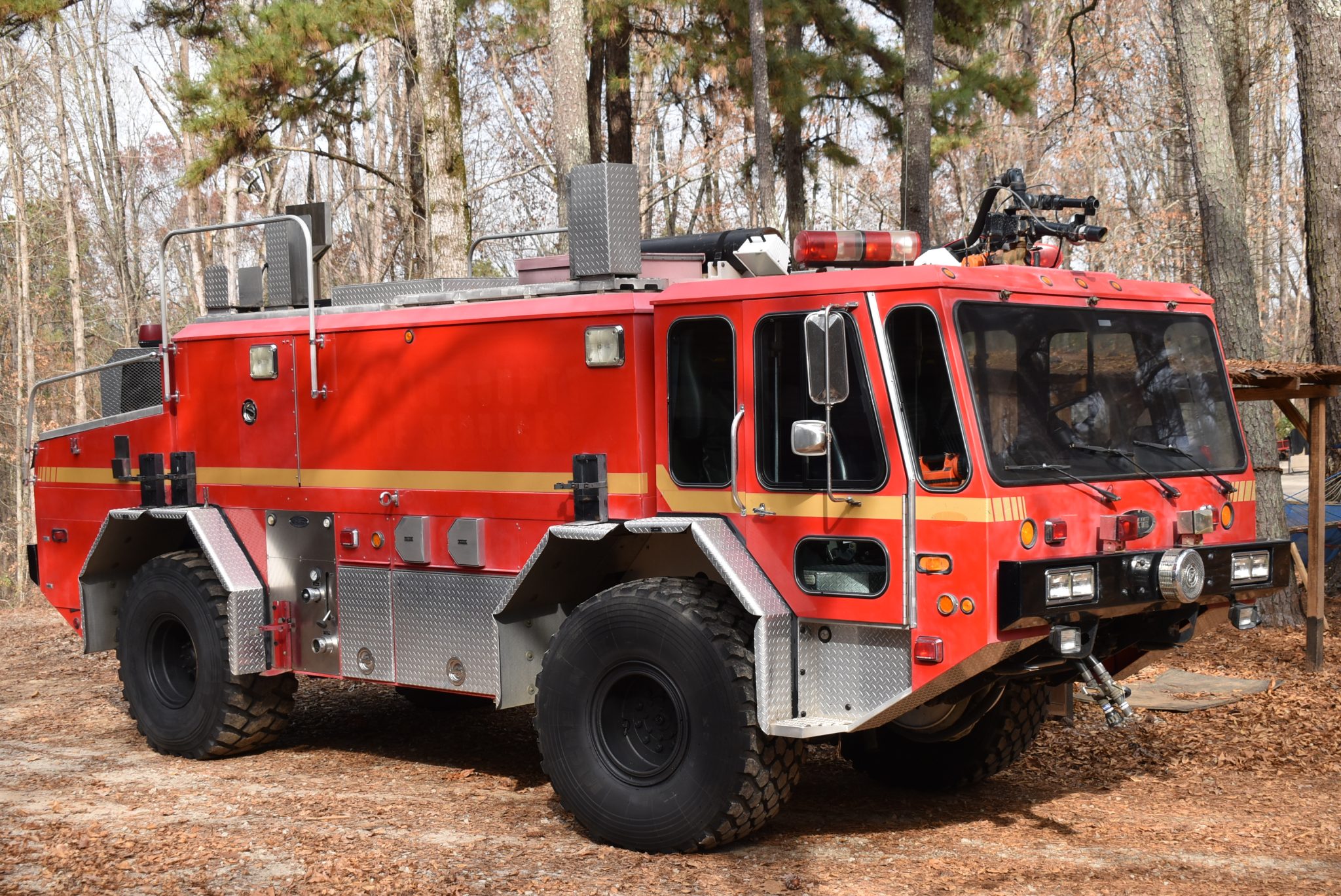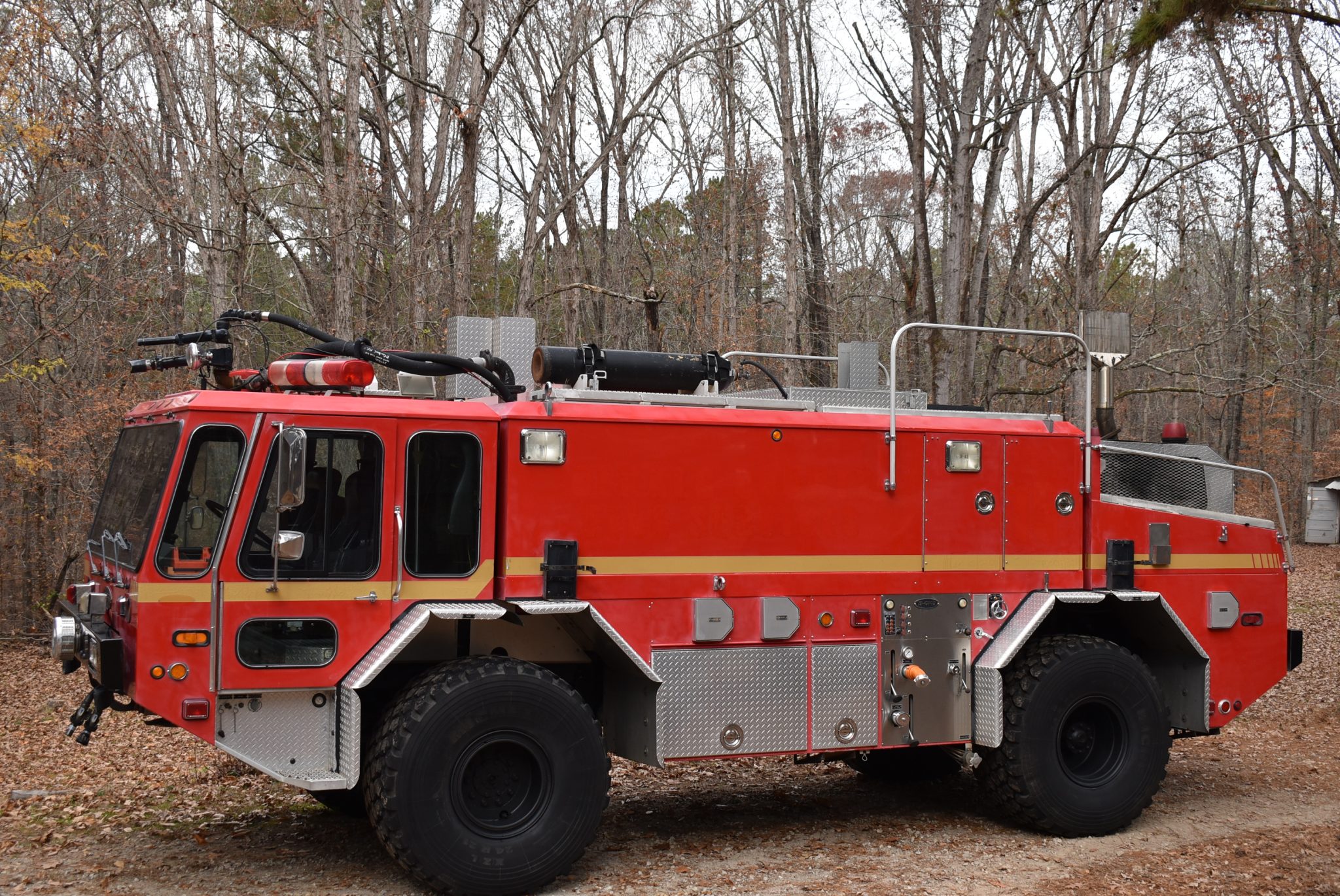 Black-finished steel wheels wear 24R21 Michelin XZL tires. Fire-fighting equipment includes a dual-hose fire suppression system with a roof turret, a 1,500-gallon water and foam tank, and a 1,250-gpm side-mount single-stage pump.