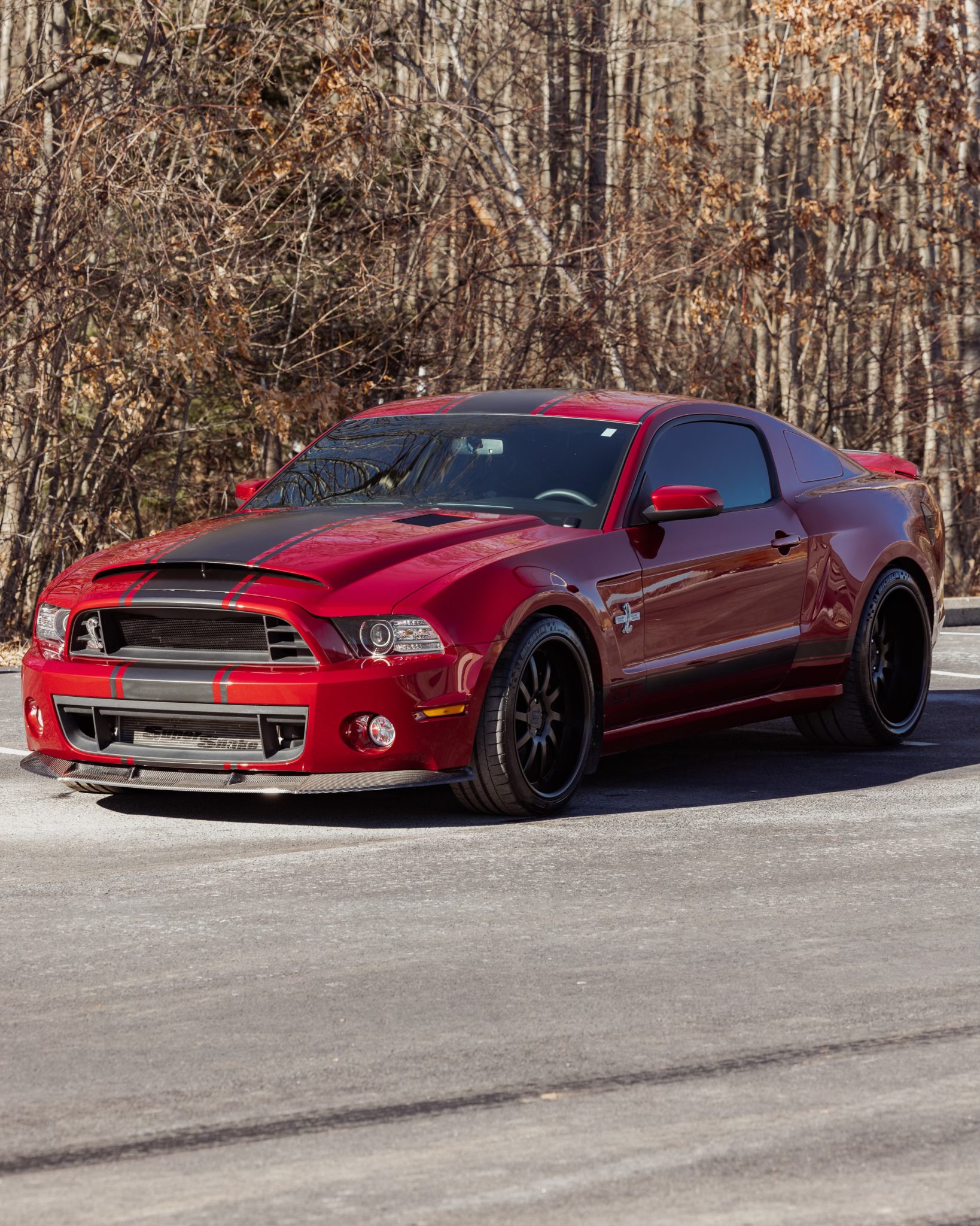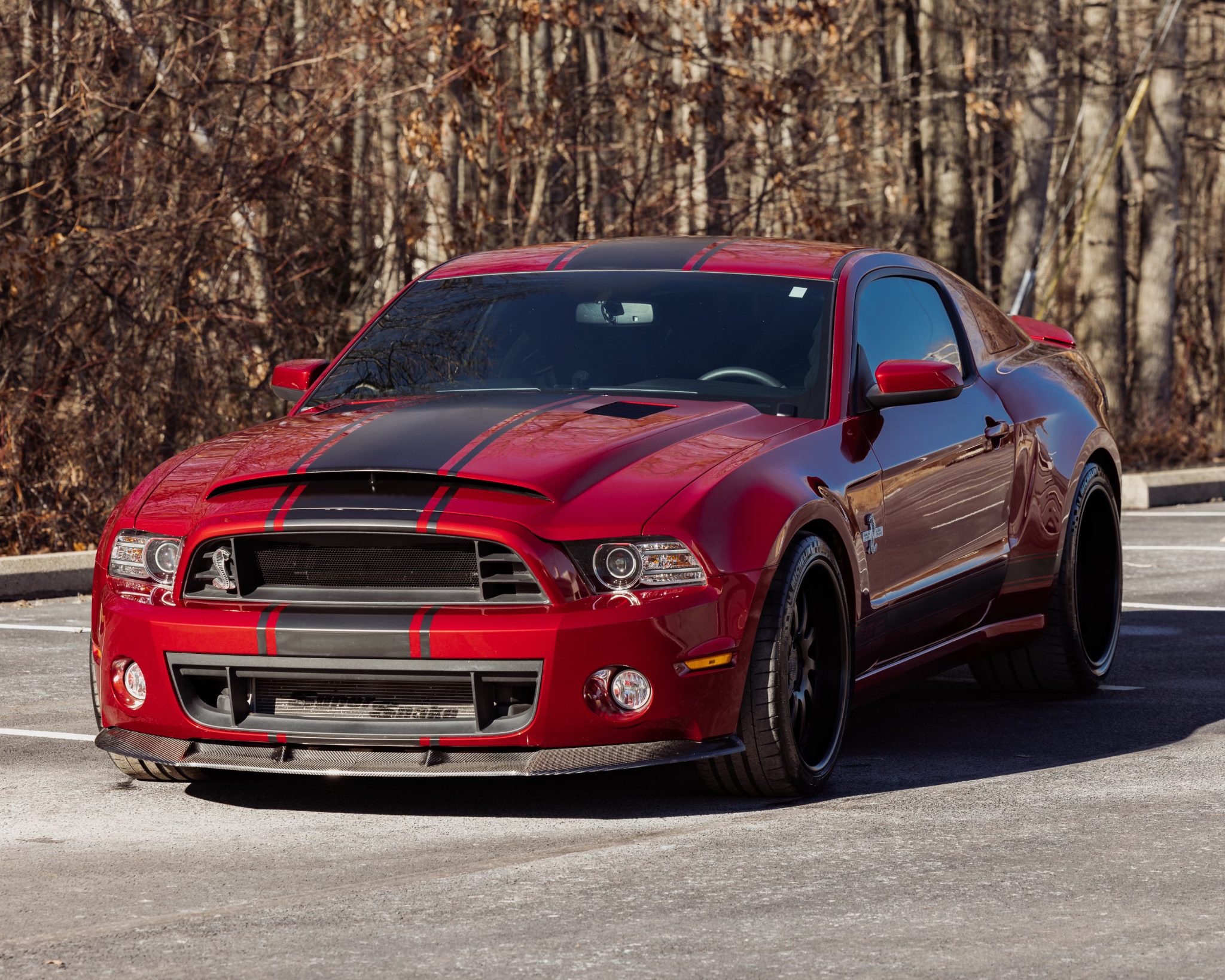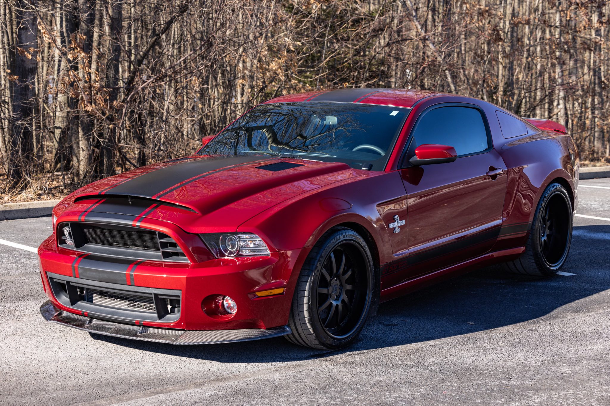 Staggered-width 20″ forged wheels are finished in satin black and wear 275/35 front and 345/30 rear Michelin Pilot Super Sport and Michelin Pilot Sport Cup 2 tires, respectively. The car rides on a revised Watts link suspension with SVT springs, and caster camber plates are installed. Stopping power is provided by Wilwood multi-piston calipers with cross-drilled and slotted rotors, and Shelby-installed cooling ducts provide airflow for the front calipers.