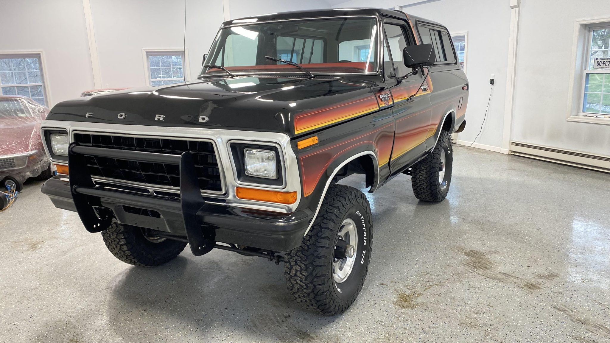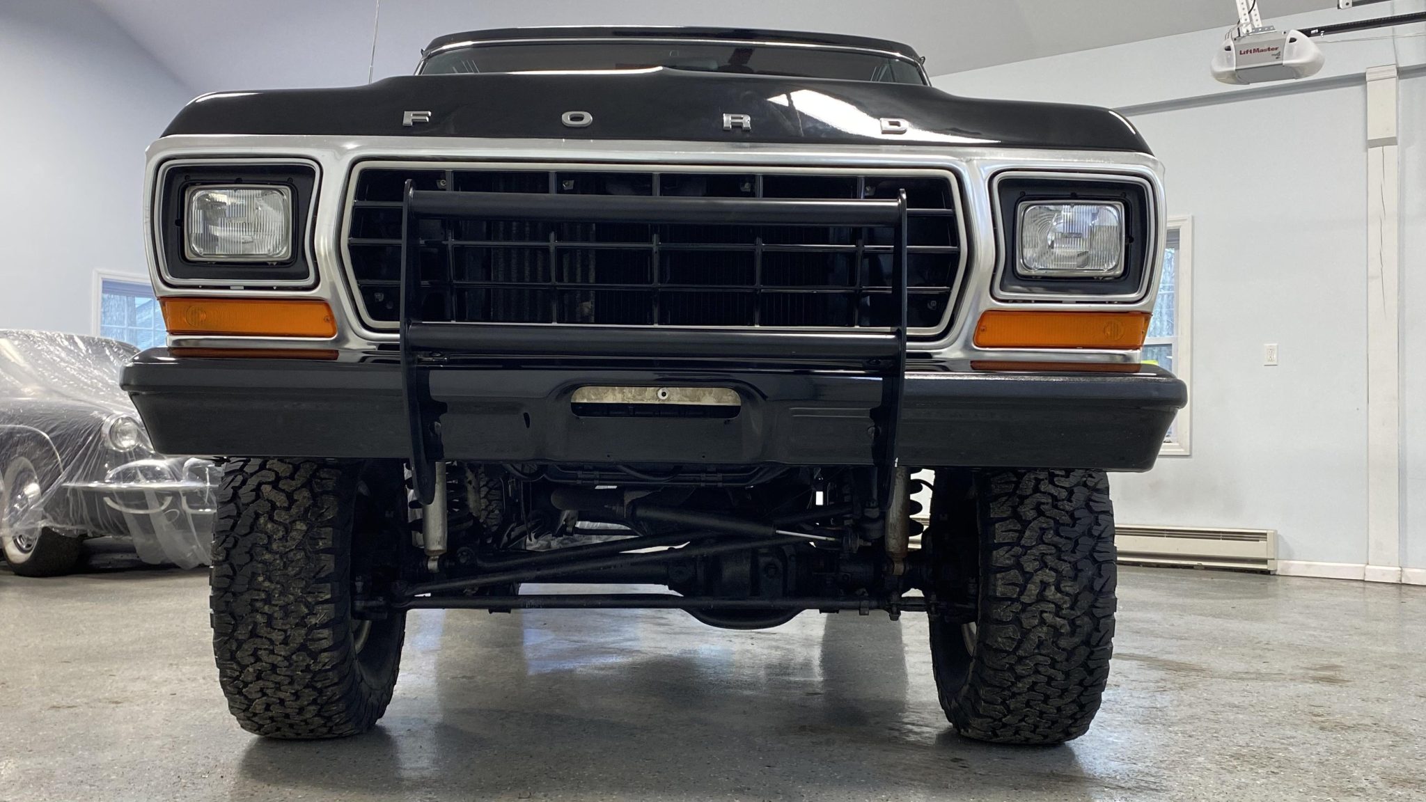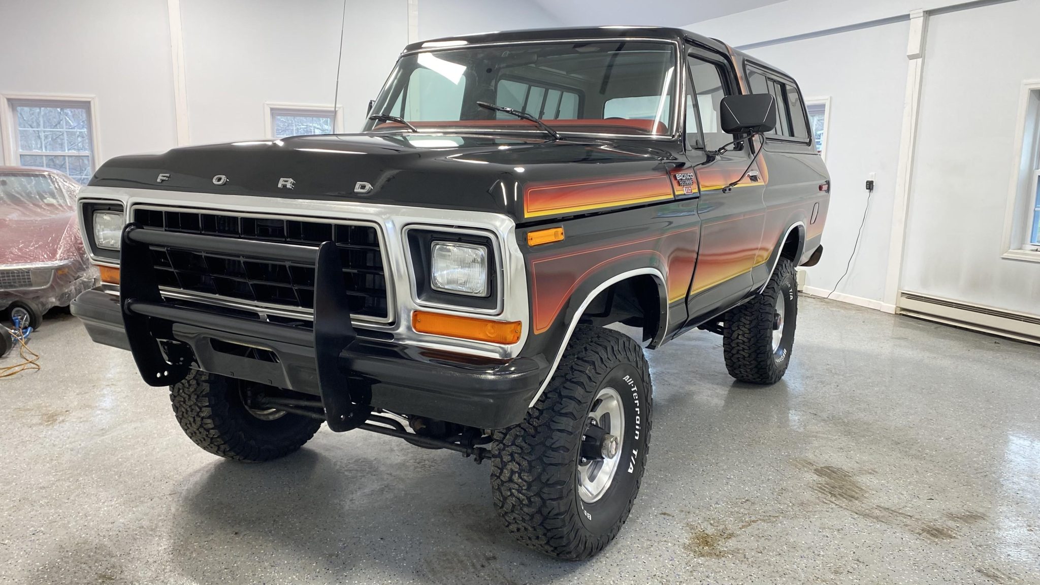 Polished aftermarket wheels are mounted with BF Goodrich All-Terrain T/A K02 tires installed in preparation for the sale. A matching-combination spare and a removed tire carrier are located in the cargo area. The parking brake is not currently connected.