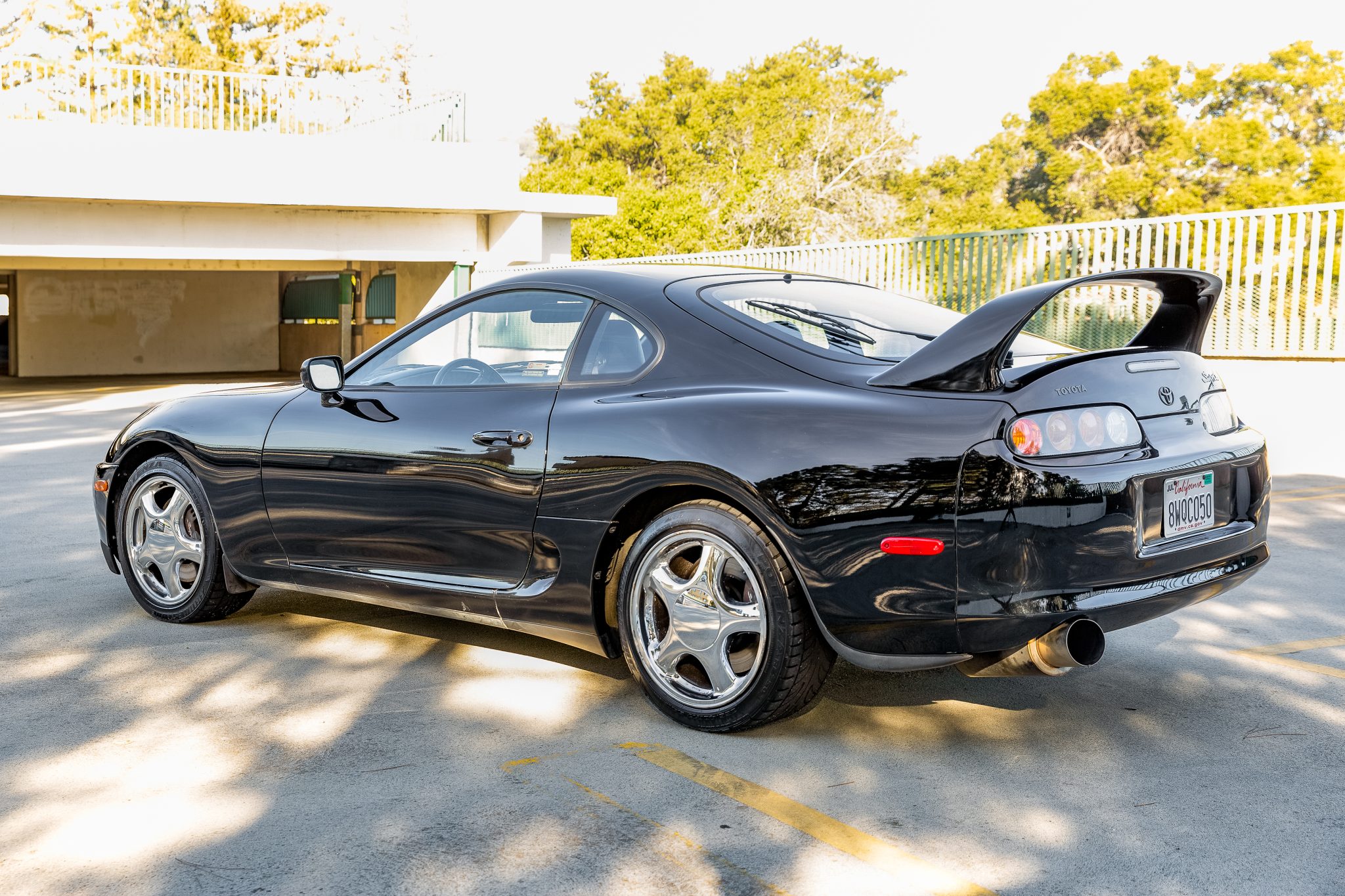 Chrome-finish 17″ wheels are wrapped in 235/45 front and 255/40 rear Bridgestone Potenza RE750 tires. Braking is handled by four-wheel anti-lock discs with Supra-script calipers. The brake rotors were reportedly replaced in February 2022. Curb rash and pitting of the finish on the wheels are shown in the gallery.