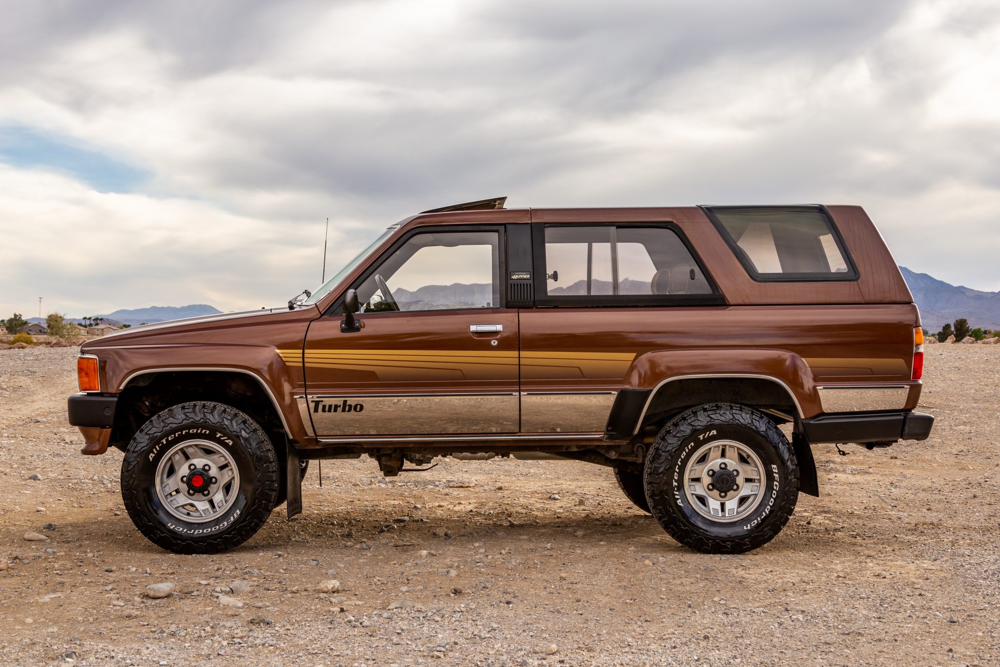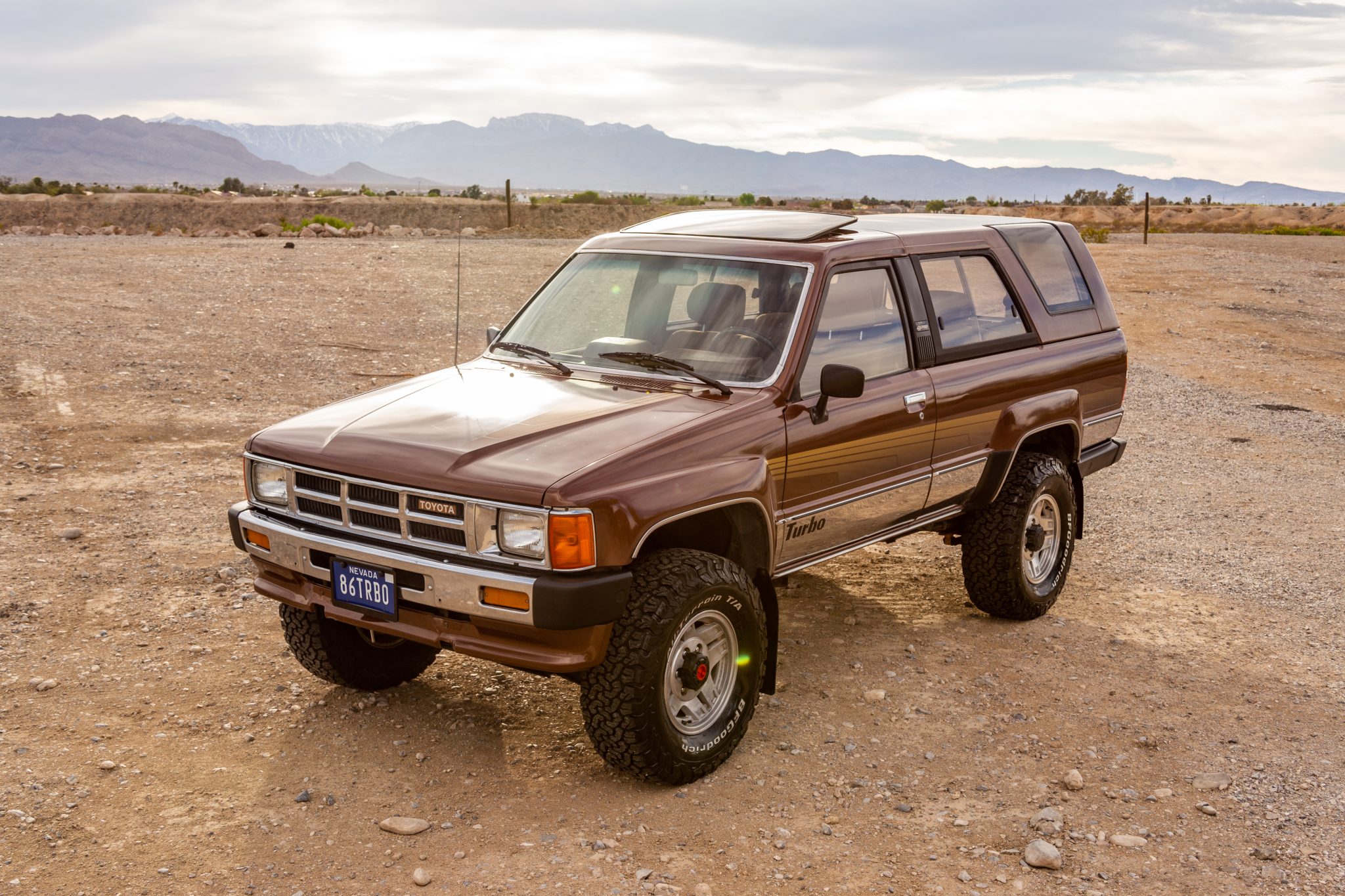 Polished 15″ alloy wheels are mounted with 31×10.5″ BFGoodrich All-Terrain KO2 tires. The truck is equipped with manually locking front hubs and Bilstein shocks. The tie rods, shocks, brake components, steering damper, wheel bearings, and upper and lower ball joints are said to have been replaced under current ownership.