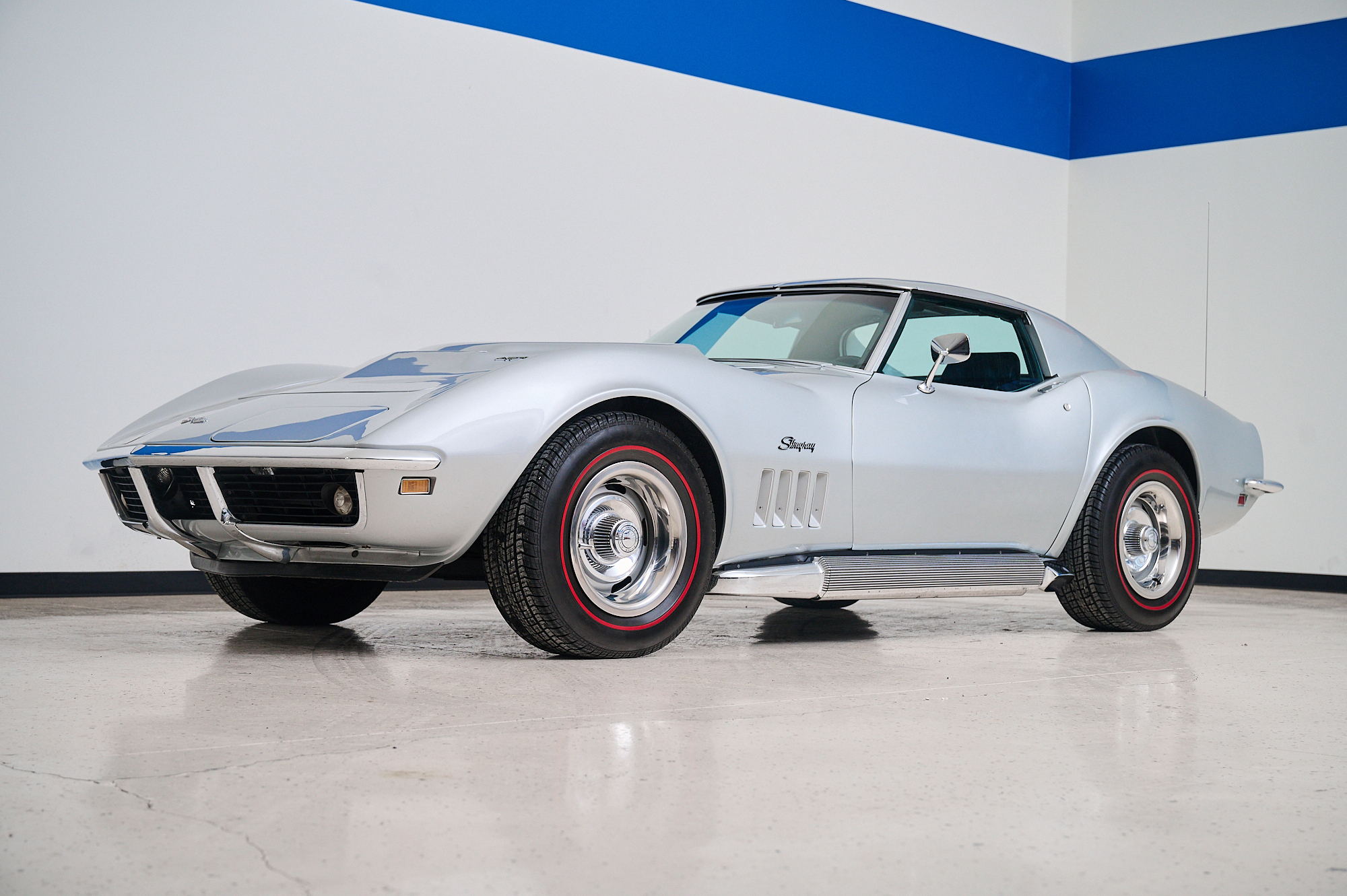 Rally wheels wear chrome hub covers and trim rings and are wrapped in red-stripe tires. Braking is handled by four-wheel discs.