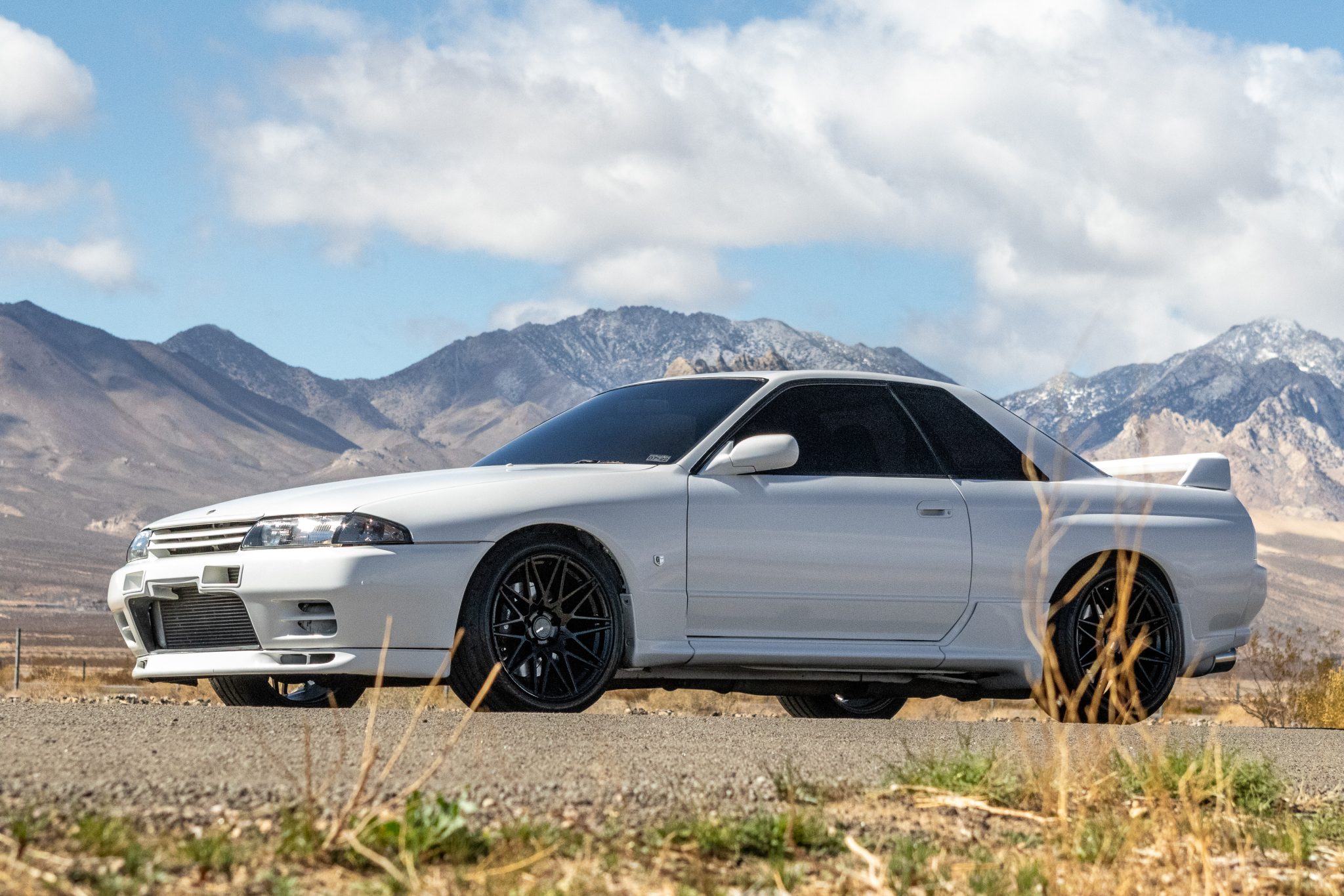 Enkei 18″ wheels finished in black are wrapped in 265/35 Yokohama Advan Apex V681 tires showing 2020 production codes. Braking is handled by four-wheel discs with R33-sourced Brembo calipers, Endless slotted rotors, and Project Mu pads, while the suspension has been modified with Öhlins coilovers and a front Cusco strut tower brace. The car is equipped with HICAS four-wheel steering.
