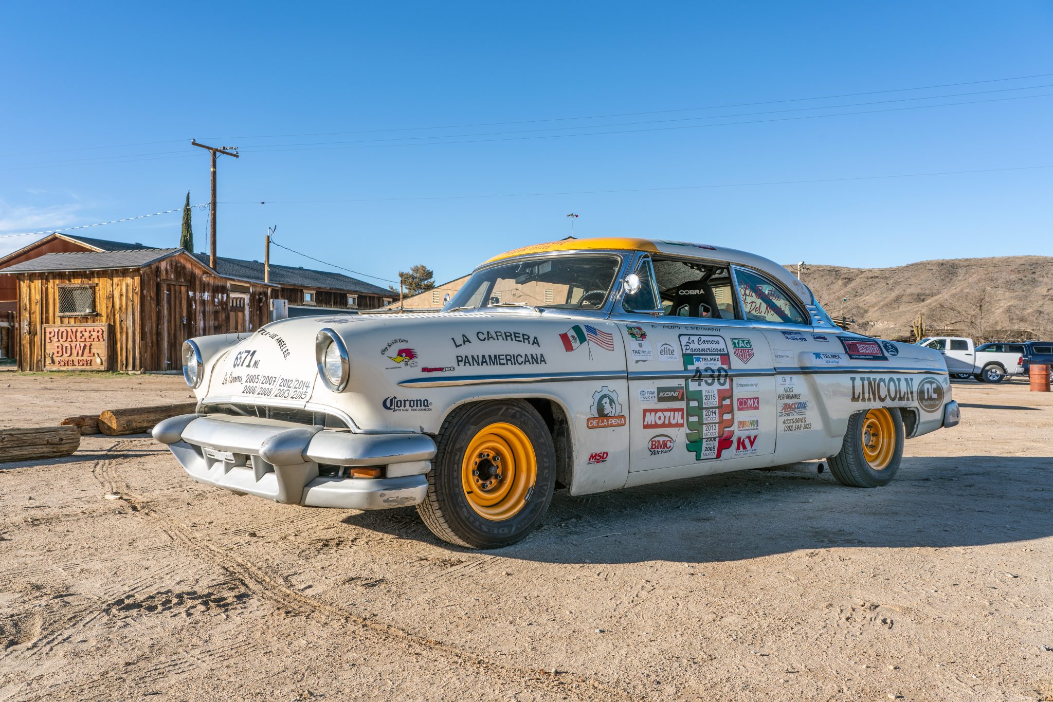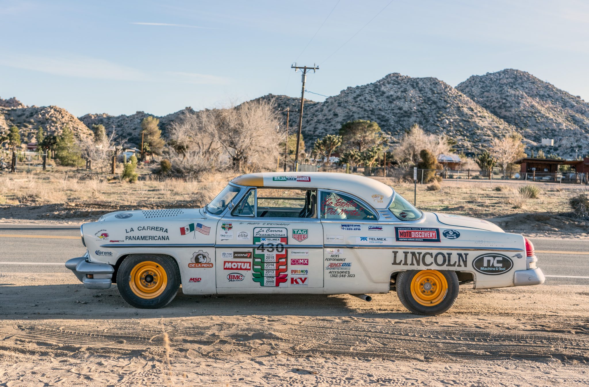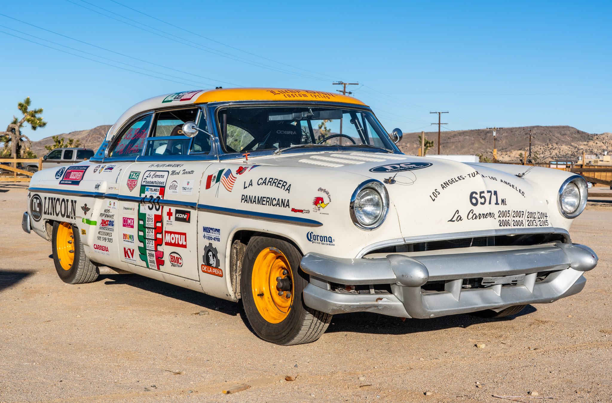 Originally finished in Columbia Blue, this car has been repainted in off-white, and various imperfections in the finish are shown in the photo gallery below. Modifications include a peaked hood with custom louvers, peaked fenders, frenched 1956 Oldsmobile headlight buckets, shaved door and trunk handles, hood pins, rubber trunk hold-downs, a front fender-mounted electrical cutoff switch, dual side exhaust exits, and numerous decals. Lettering on the front hood celebrates the 6,571 miles traversed by the car from Los Angeles to the start of the Carrera Panamericana, over the event course, and then back to Los Angeles, while also listing the eight years it successfully completed the event under current ownership.
