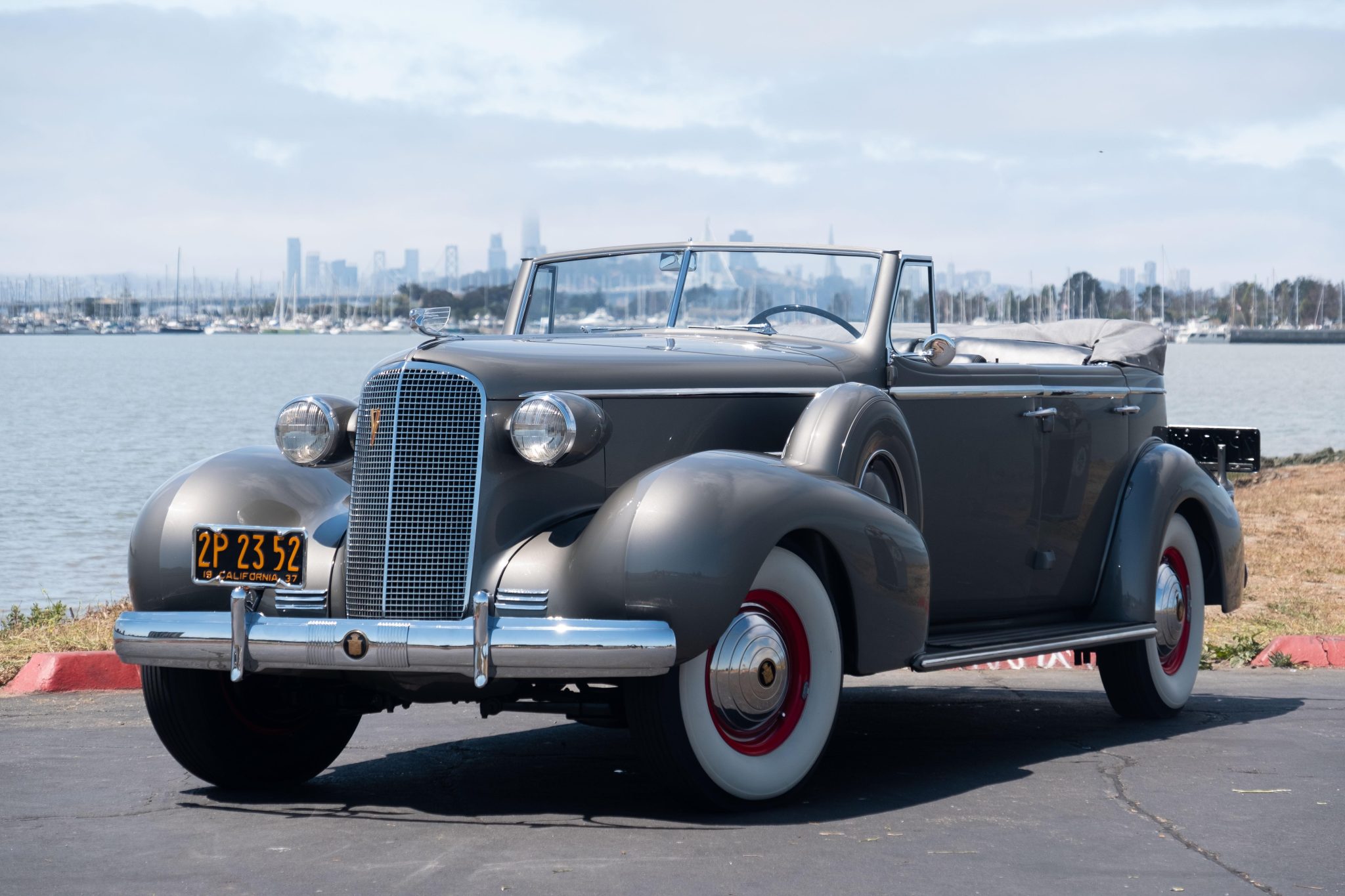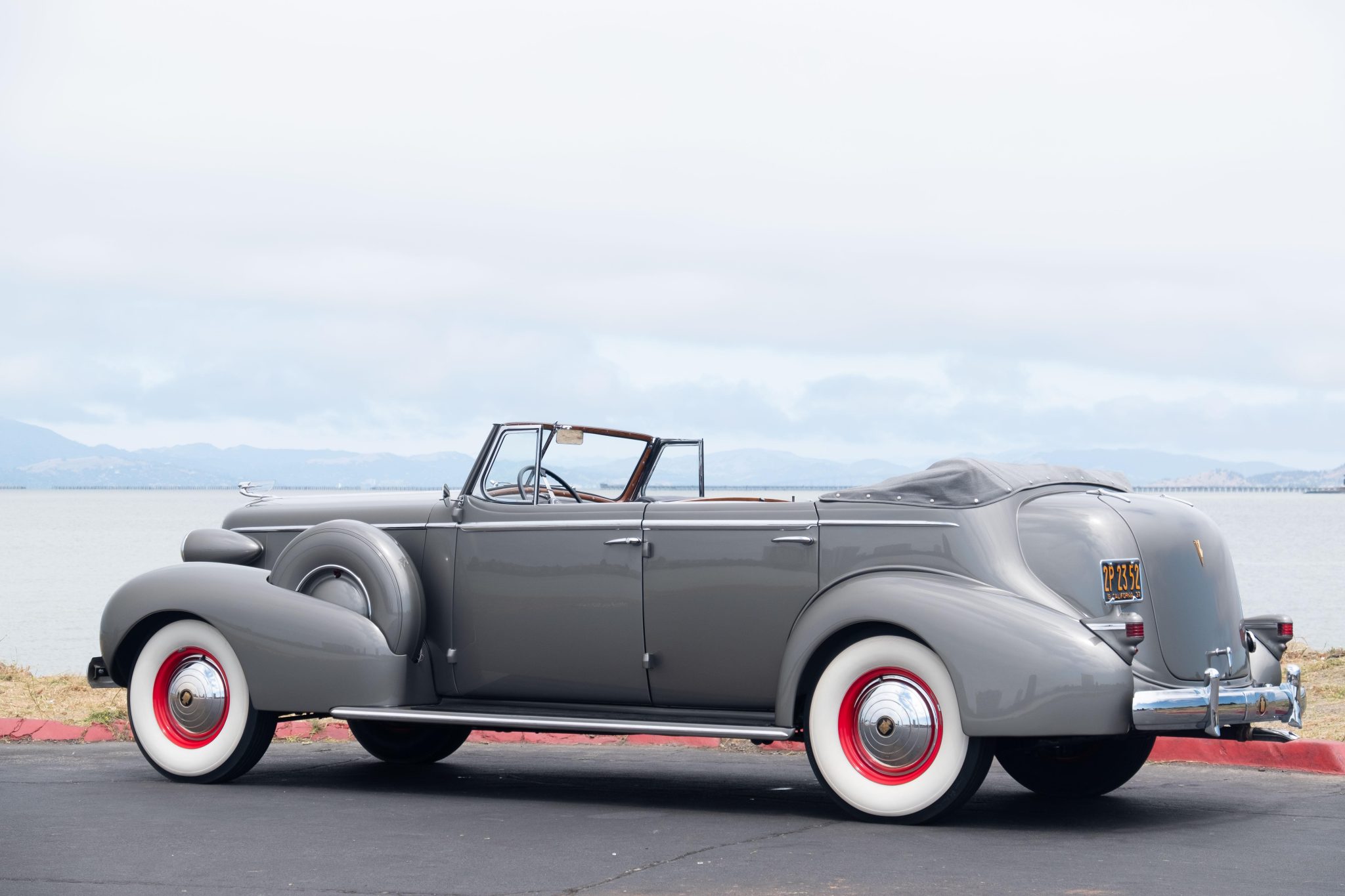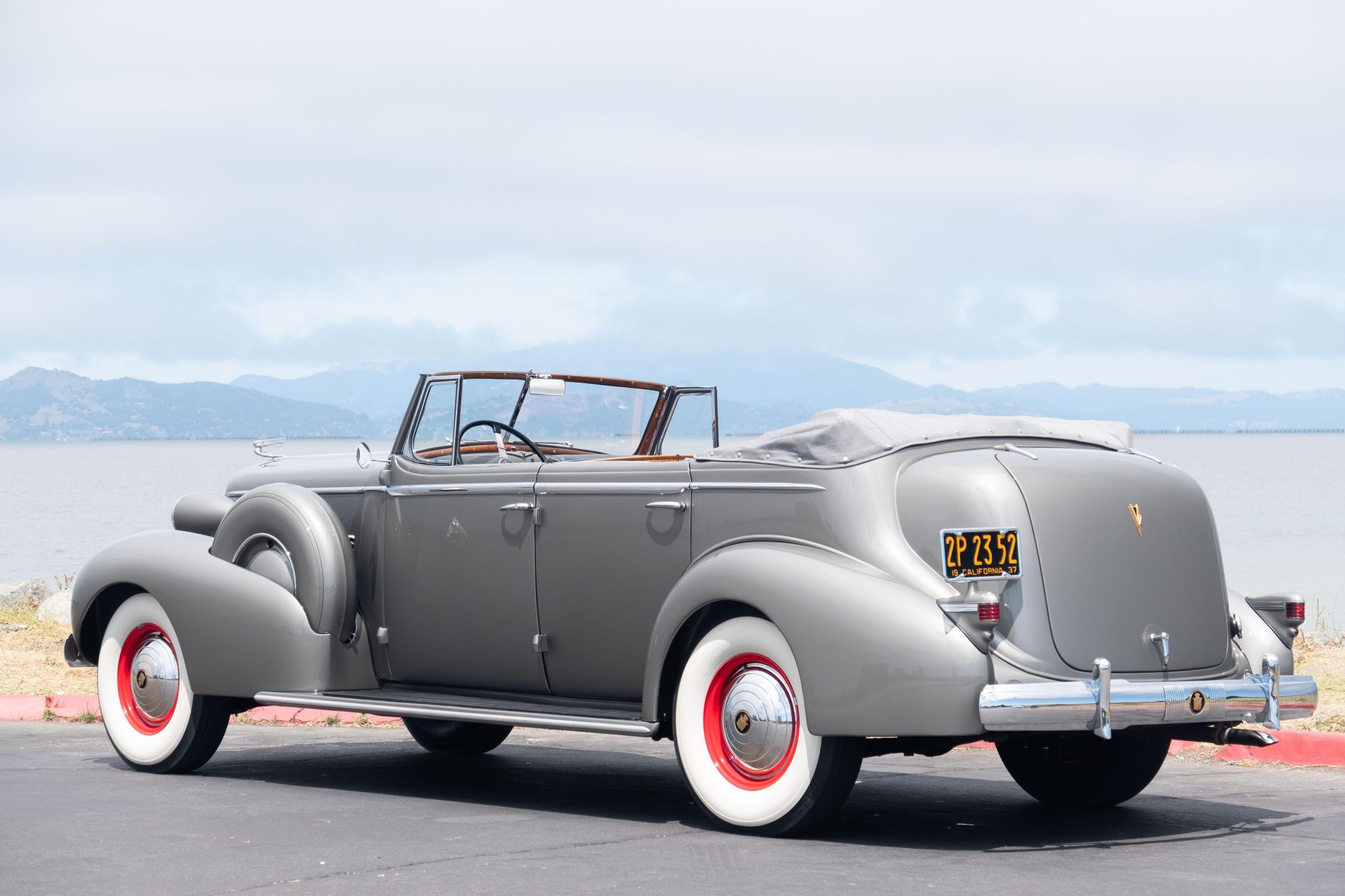 The red-painted steel wheels wear chrome Cadillac crest hubcaps and trim rings, and they are mounted with 7.50/8.20–16 Denman bias-ply whitewall tires. Twin spare tires are mounted inside body-color covers on the front fenders. A replacement gray soft top was reportedly fitted during the refurbishment. The Model 85 rode on a 138″ wheelbase and featured an independent front suspension with semi-elliptical leaf springs out back. Stopping power is provided by hydraulically assisted drums at all four corners.