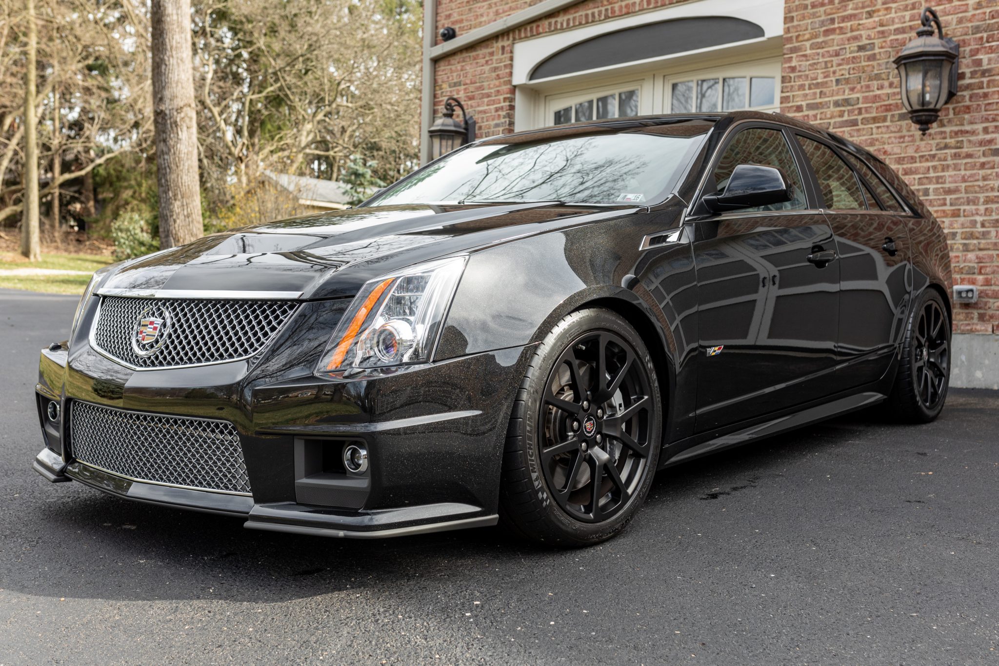 Satin-black 19″ alloy wheels are mounted with 255/35 front and 285/35 rear Michelin Pilot Super Sport tires that show date codes from 2014. The car features a Magnetic Ride Control suspension system, and stopping power is provided by four-wheel discs with silver calipers. The seller notes that Eibach Pro-Kit springs have been fitted at all four corners, and a spare set of Cadillac polished aluminum wheels are included in the sale.