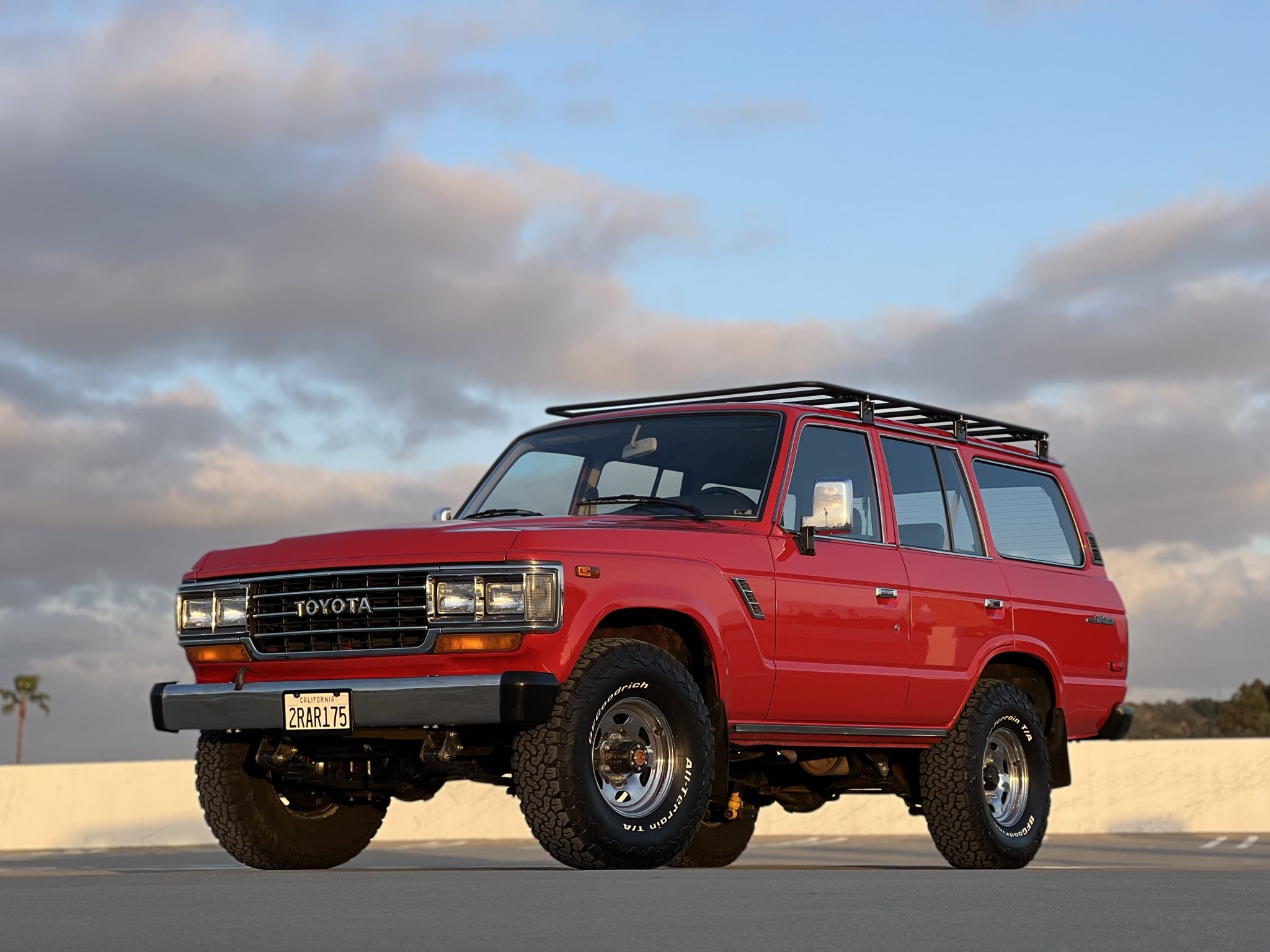 The 15″ polished steel wheels are wrapped in 33×10.5″ BFGoodrich All-Terrain T/A KO2 tires. The front axle is equipped with Aisin manually locking hubs, and braking is handled by front discs and rear drums. An Old Man Emu 3″ lift kit is said to have been recently installed by Corsetti Cruisers in Gardena, California.