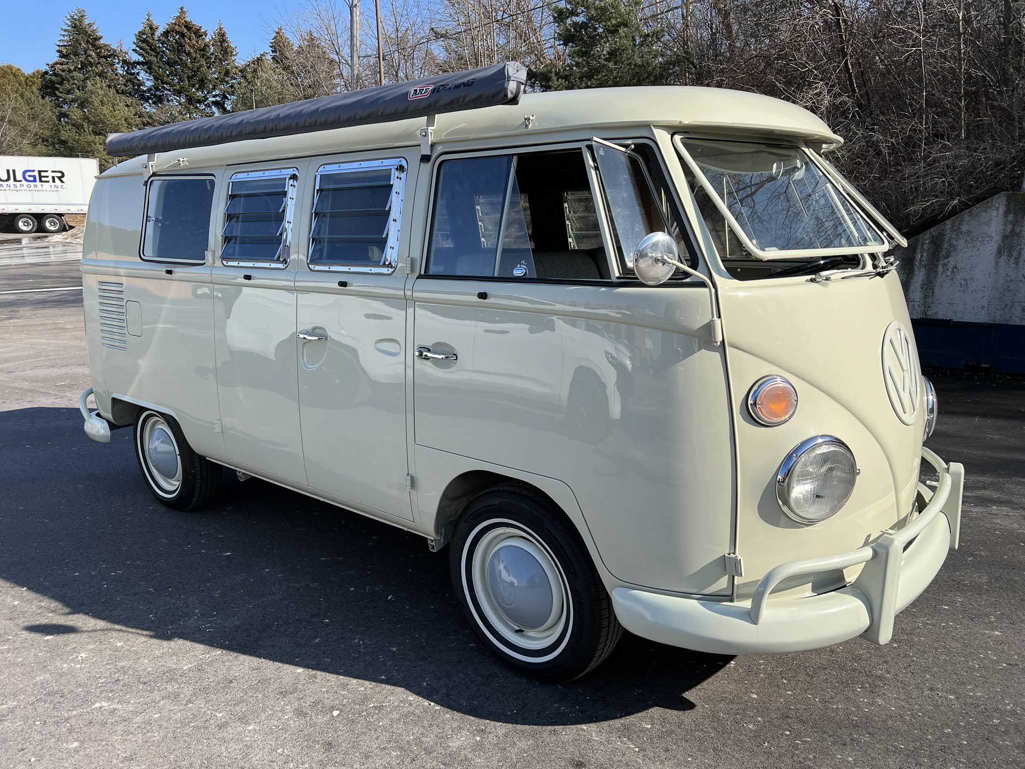 During the refurbishment an ARB Touring awning was added on the right side. Painted 14″ steel wheels are mounted with Hankook Kinergy ST thin-whitewall tires, and the van is equipped with Bilstein shocks.