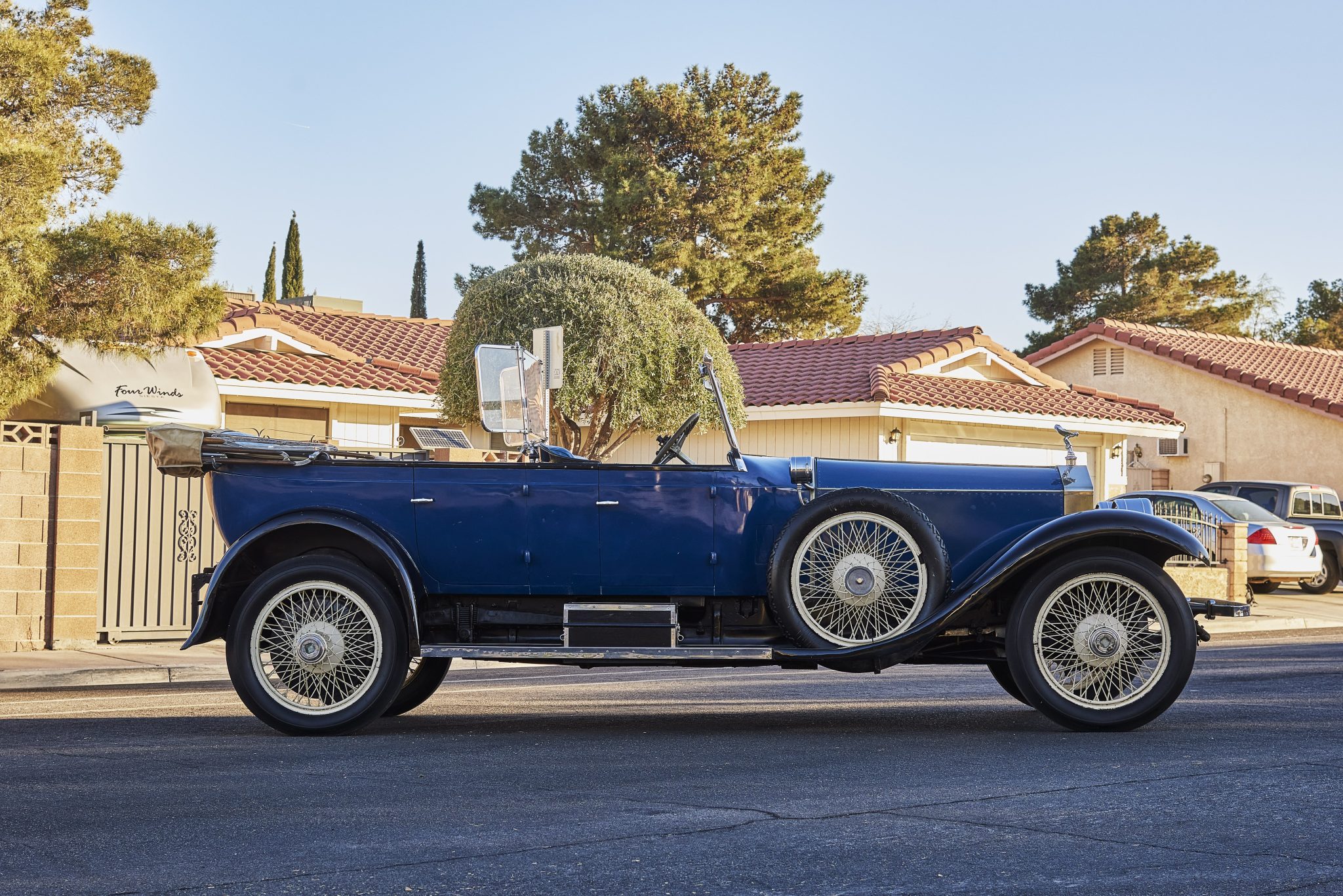 This example’s four-door open tourer styling was named the Oxford in keeping with the Springfield subsidiary’s system of naming bodywork variants after British landmarks. The body was repainted in its current shade of blue with black fenders and cockpit perimeter trim during the early years of the family’s ownership in favor of the car’s previous yellow shade. Various dings and imperfections are exhibited on areas of the body.