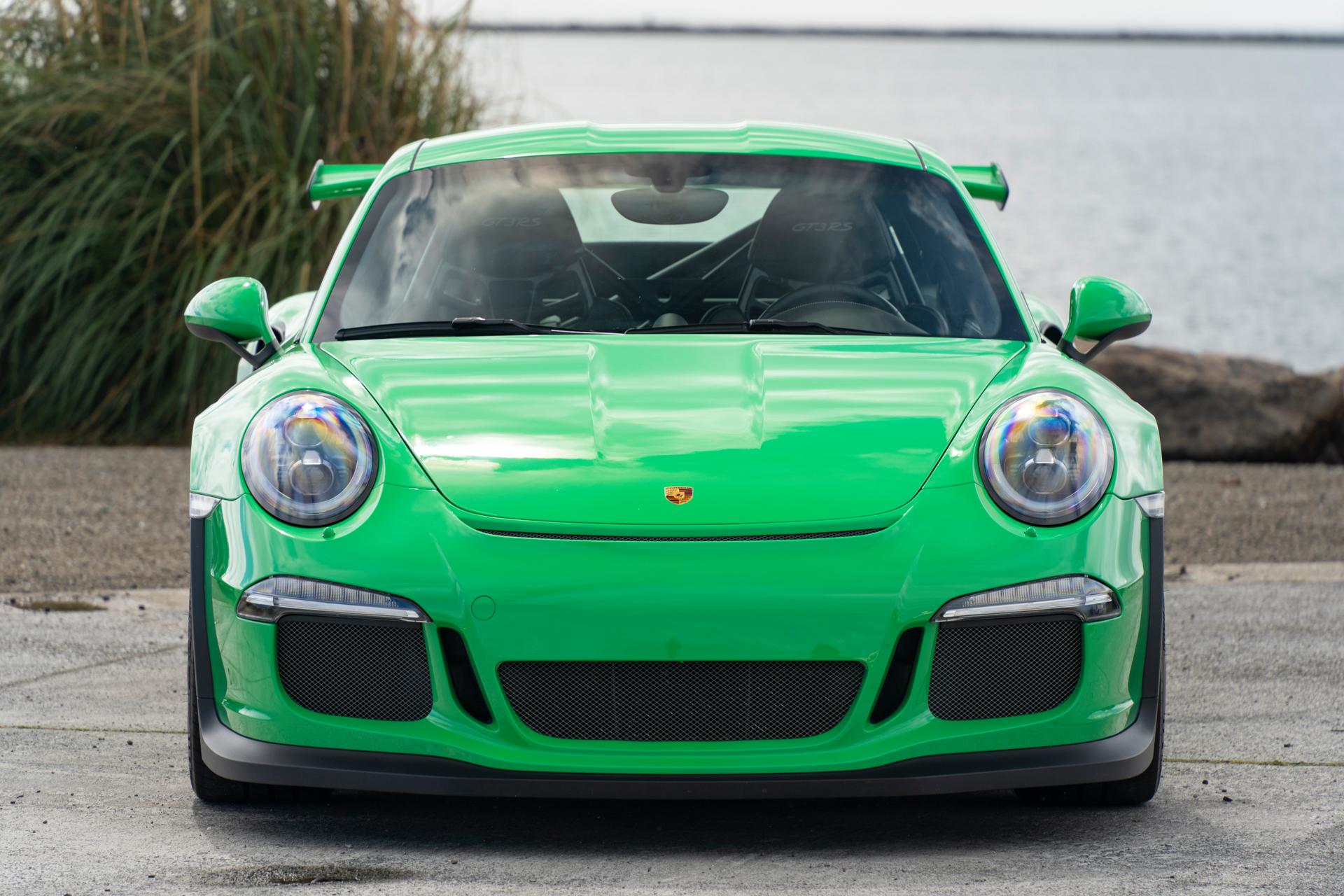 Center-lock wheels with an optional silver finish measure 20″ in diameter up front and 21″ out back, and they are mounted with 265/35 front and 325/30 rear Michelin Pilot Sport Cup 2 tires. The Porsche Ceramic Composite Brake system added $9,210 to the sticker price, and it is denoted by yellow-finished multi-piston calipers. The car was ordered with a front-axle lift system, and standard GT3 RS equipment included rear-axle steering, Porsche Active Suspension Management, Anti-Slip Regulation, and Porsche Torque Vectoring Plus.