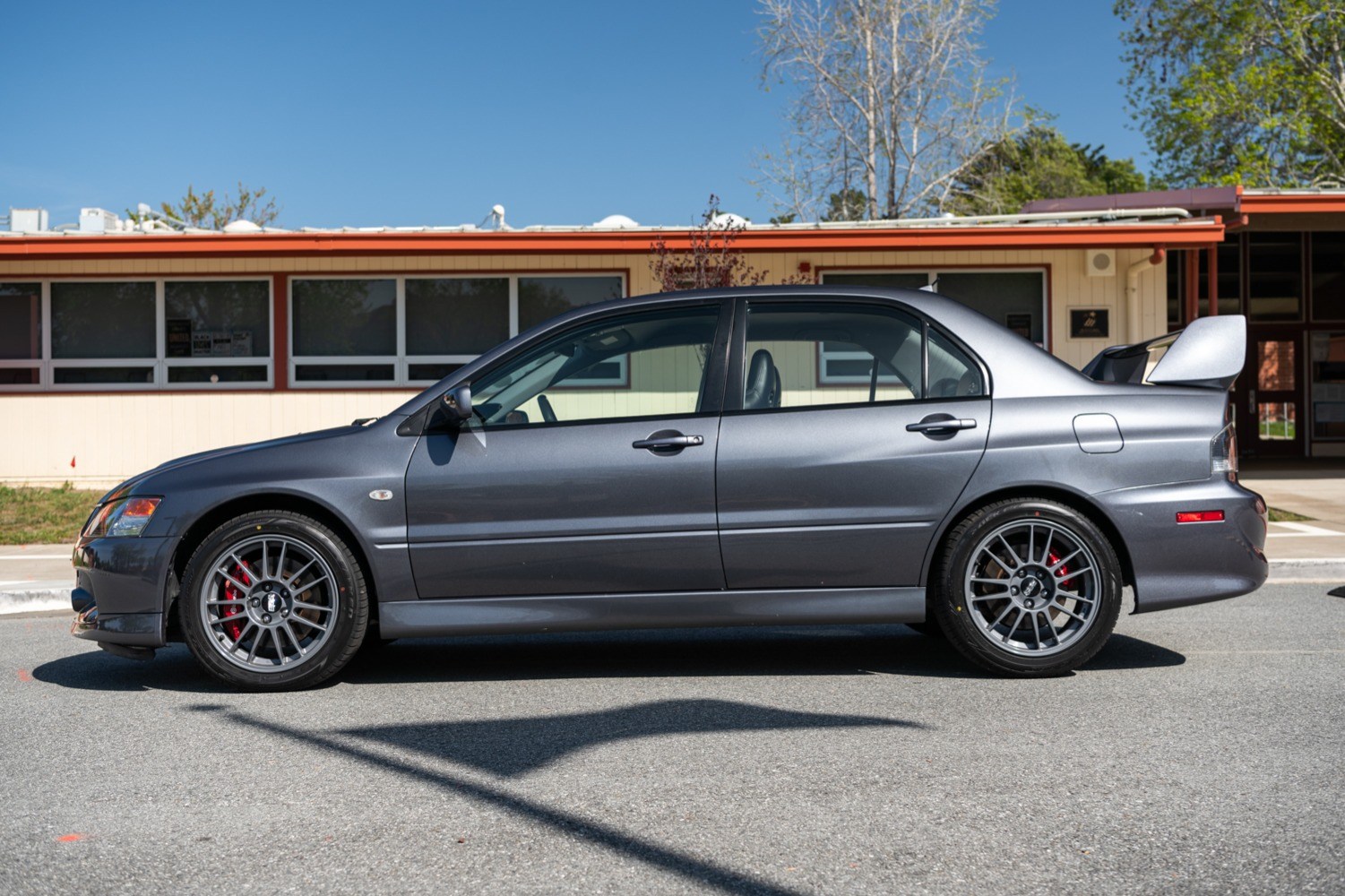 BBS 17″ forged alloy wheels wear newer 235/45 Falken Azenis FR510 tires all around. Factory equipment includes a forged aluminum suspension featuring Bilstein shocks and a front strut tower brace. Braking is handled by red-finished Brembo calipers at each corner.