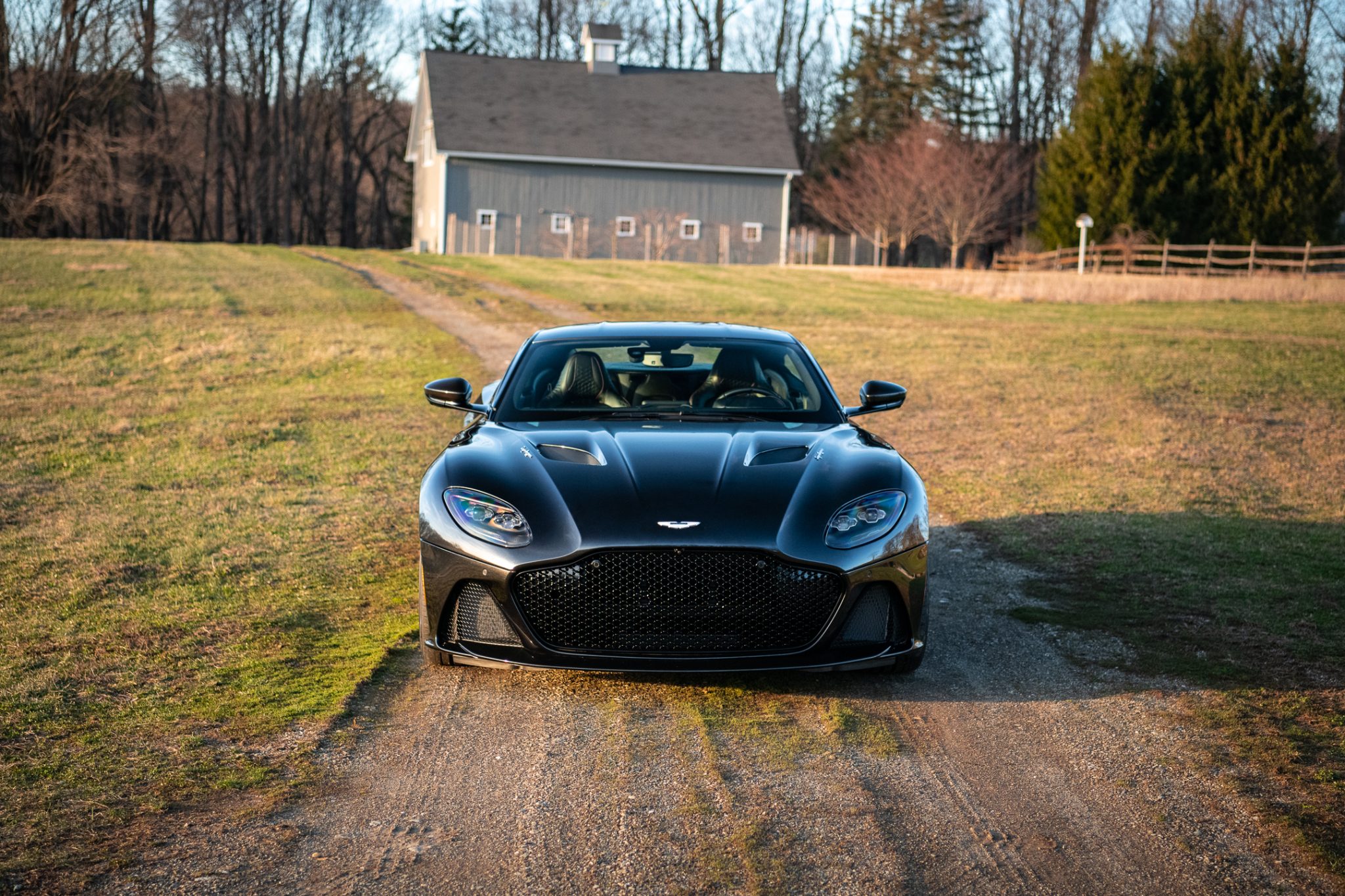 All 007 Edition DBS Superleggera examples were finished in Ceramic Grey with a black-tinted splitter, carbon-fiber roof panel, mirror caps, Aeroblade spoiler, and diffuser. Chrome 007 Edition badges are also affixed to the fenders. Additional equipment on this example includes LED headlights, Superleggera fender badges, fender vents, smoked taillights, and a 360-degree camera system with front and rear parking sensors.
