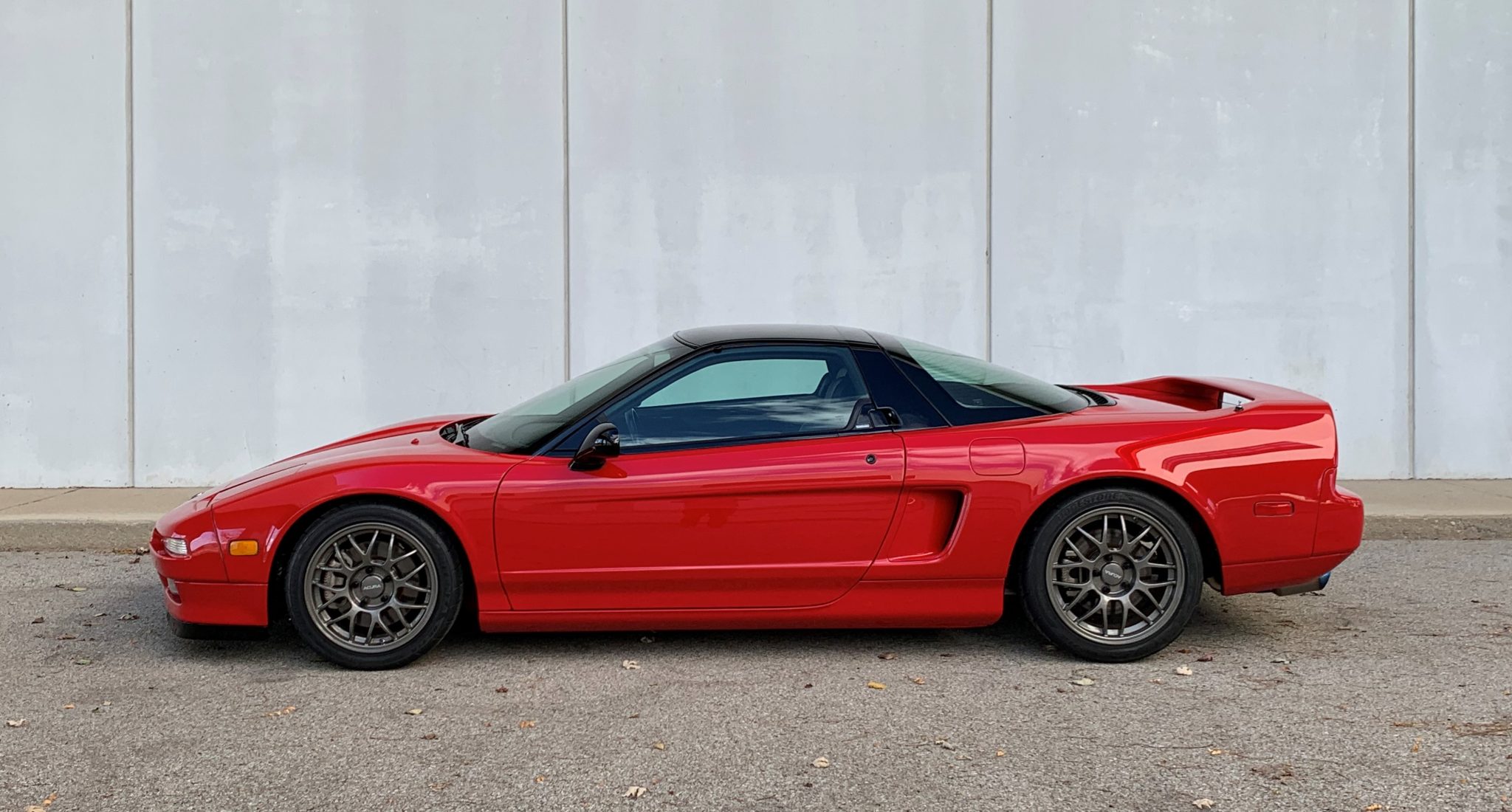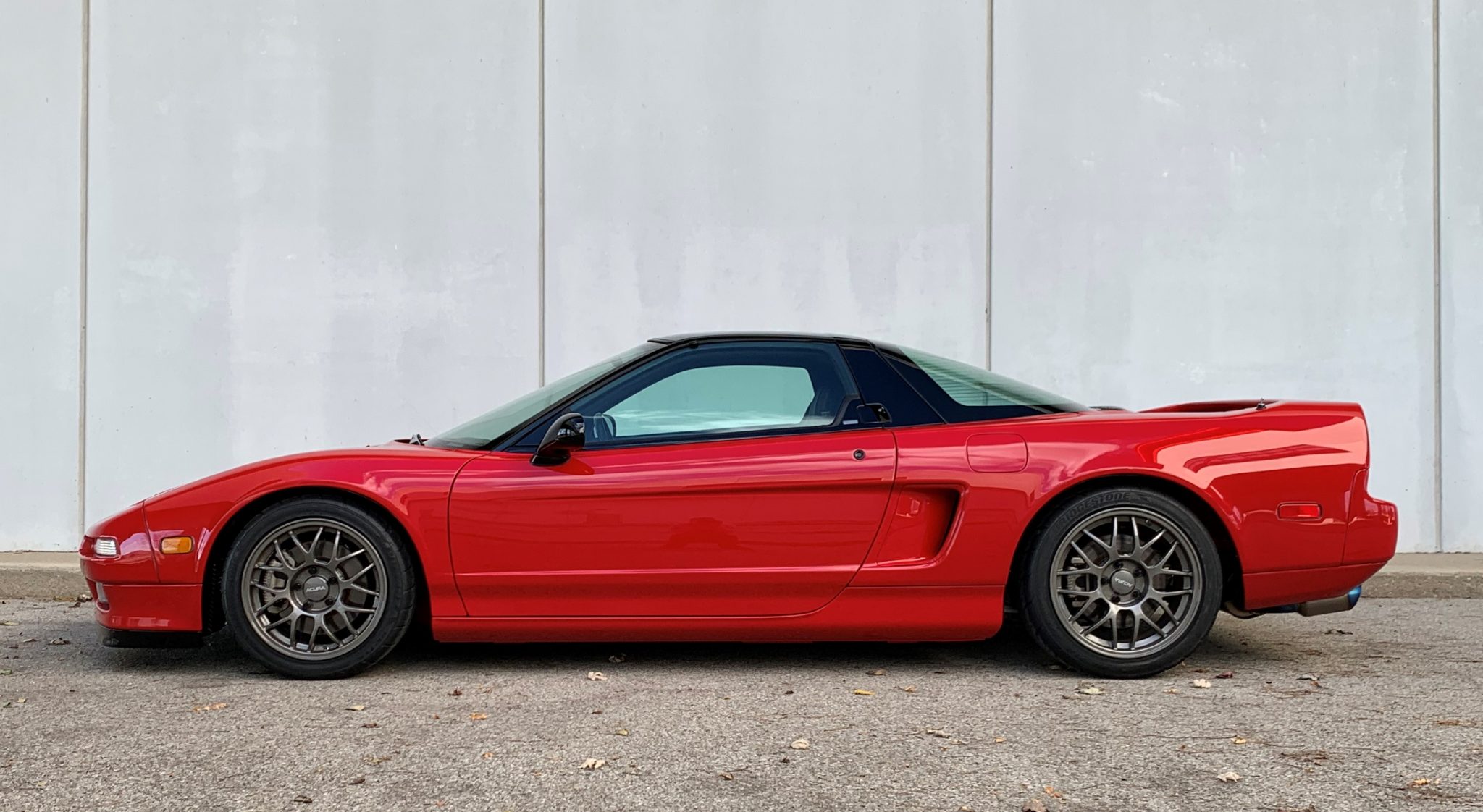 Forged 16″ and 17″ BBS alloy wheels wear Acura-script center caps and are mounted with aluminum lug nuts. The tires are 205/45 and 245/40 Bridgestone Potenza Re-71Rs. The suspension, steering rack, and brakes were removed and refurbished, and the brake fluid was flushed in 2021.