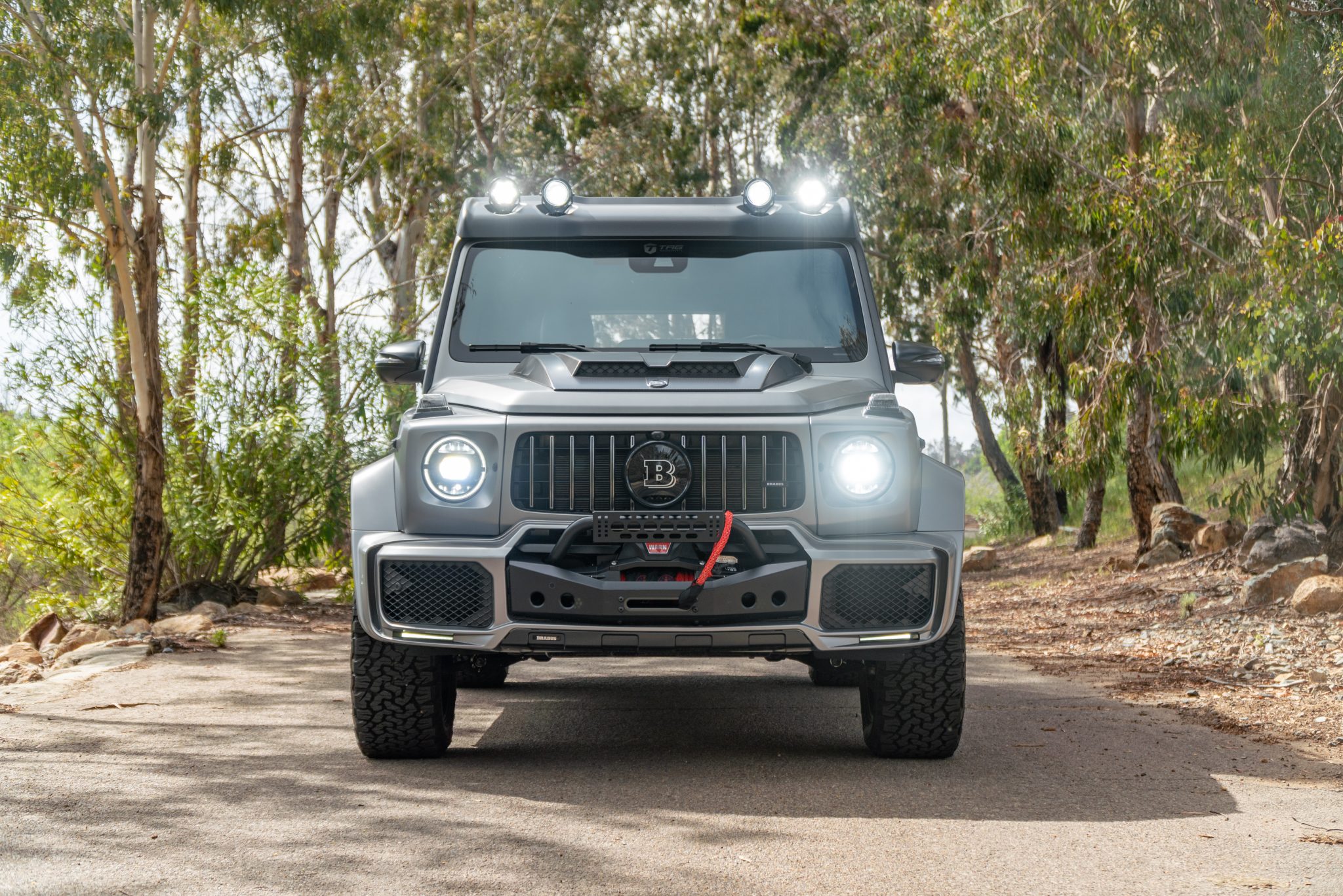 Brabus 20″ HD forged wheels are wrapped in 285/55 BFGoodrich All-Terrain T/A KO2 tires. A matching spare is fitted to a Brabus swing-away tire carrier. Braking is handled by cross-drilled and vented rotors with gray-finished AMG calipers, and Brabus suspension updates include taller springs with adjustable coilovers.