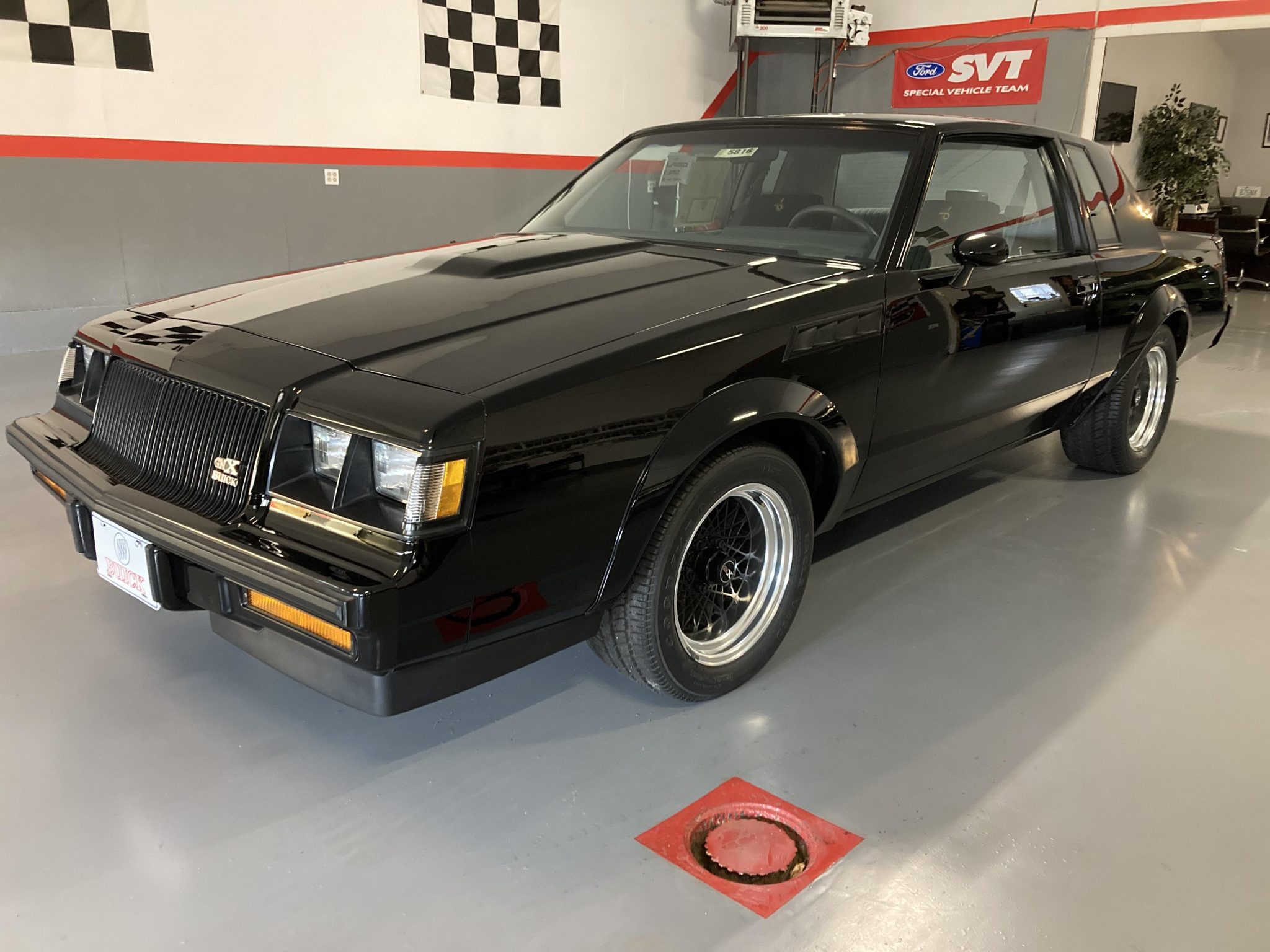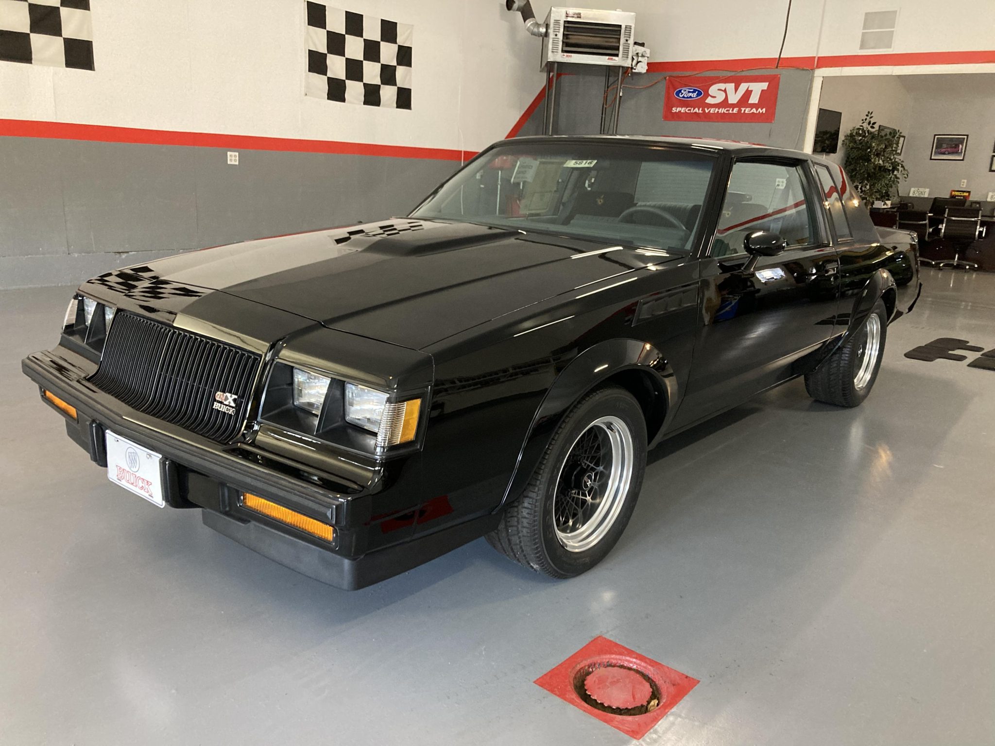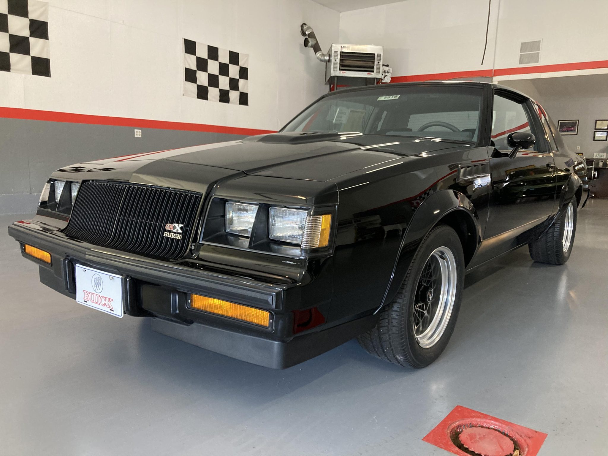 Black-finished 16″ cross-lace wheels feature GNX-branded center caps along with chrome trim rings and are mounted with Goodyear Eagle VR50 tires. The GNX features front suspension components from the contemporary Grand National, and upgraded rear components include a Panhard rod, a torque arm, and an additional frame cross member. Braking is handled by power-assisted front discs and rear drums.