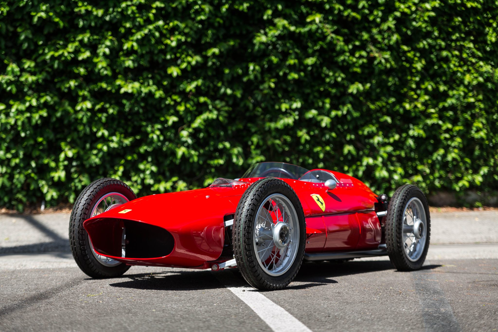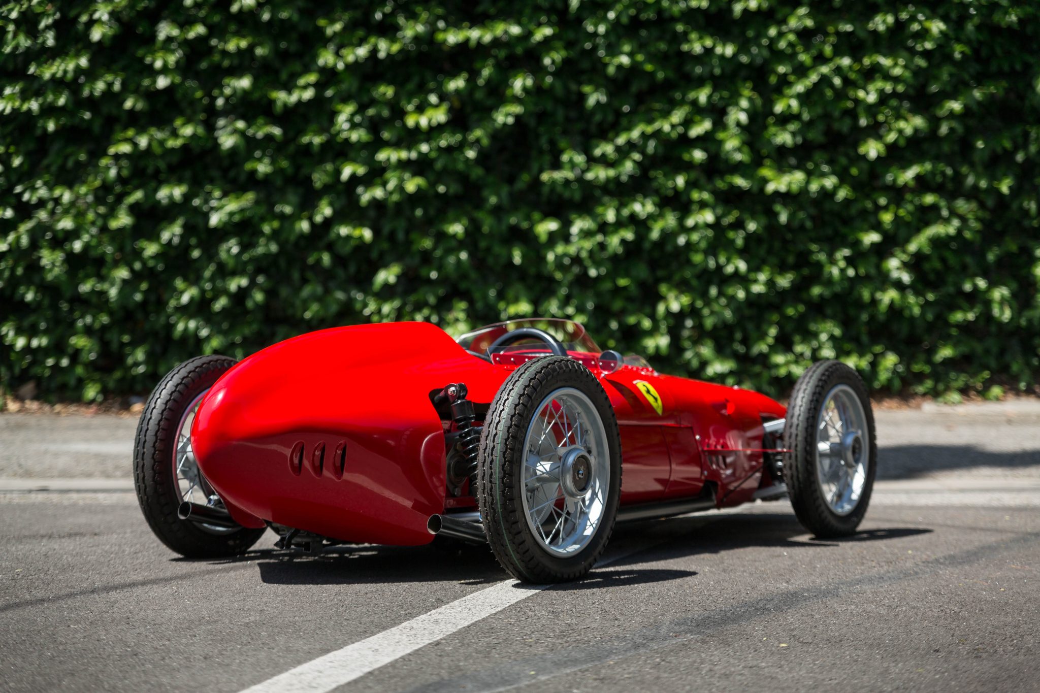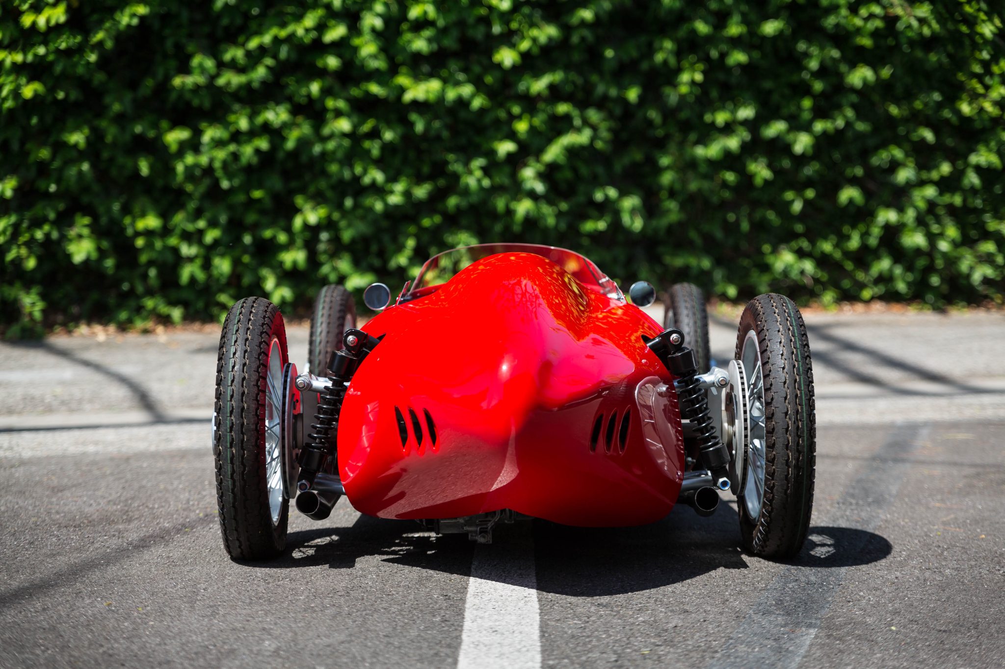 The silver-painted center-lock wire wheels are mounted with 3.00-12 Sava MC5 tires. A set of prancing horse center caps is included in the sale. The wheels are mounted with three-eared knock-offs ahead of faux brake rotors, and stopping power is provided by inboard rear units. The boxed steel frame is finished in red and features double wishbones at all four corners along with coilovers out back.
