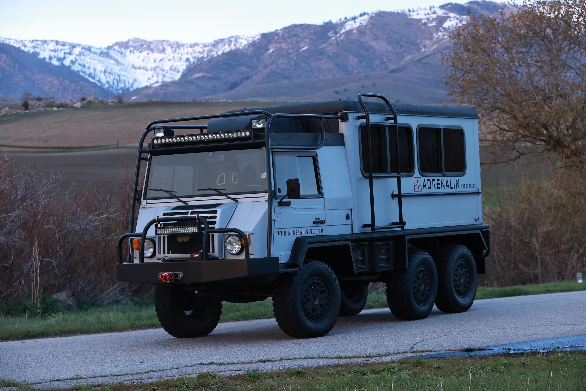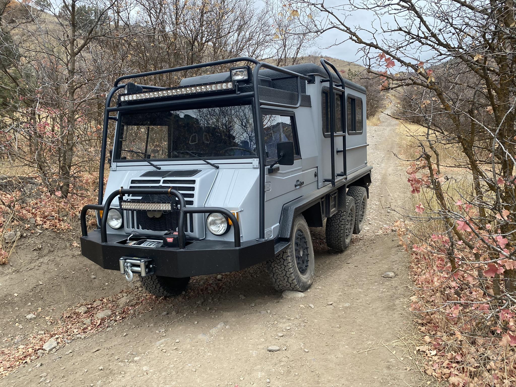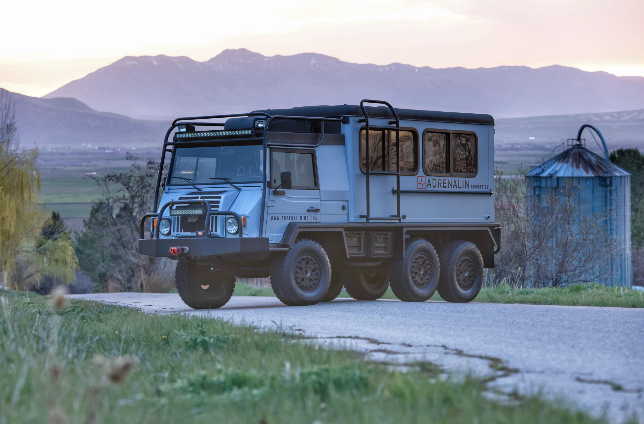 The rear passenger cabin is constructed of aluminum and features an insulated roof and walls, side rails with quick-release cargo baskets, a ladder, six sliding windows, a rear 50″ Globe-Tek LED light bar, and an AMP Research power-retractable entry step.