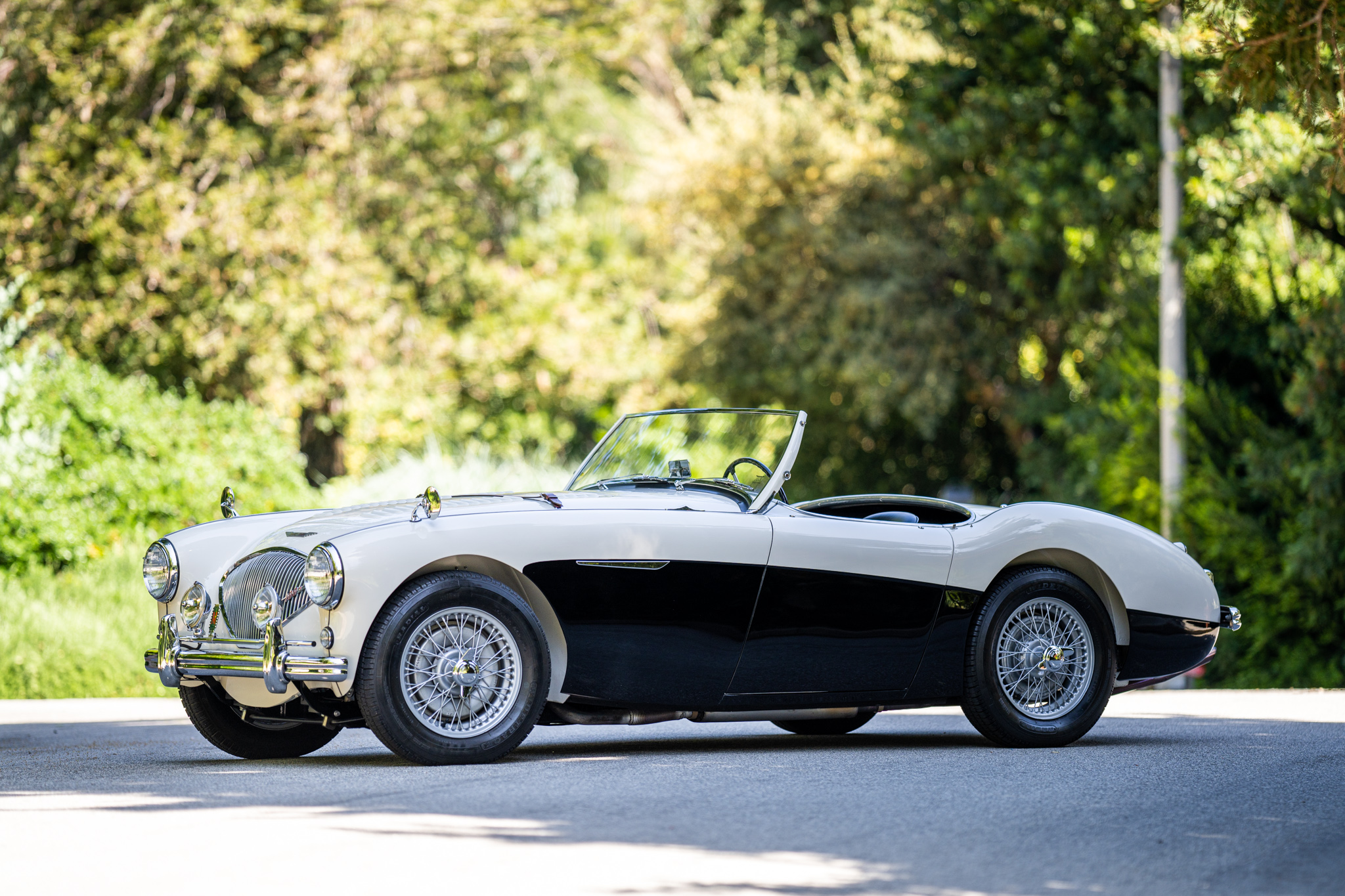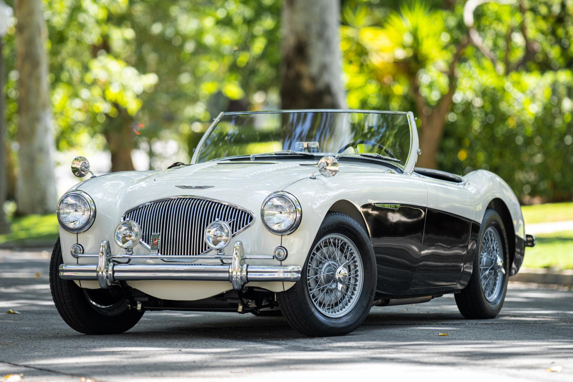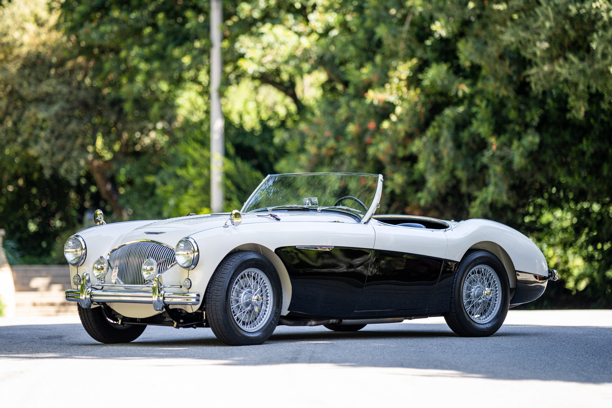 Silver-painted wire wheels are secured by two-eared knock-off spinners and mounted with Widetrack Radial tires. A full-size spare is housed in the trunk. Braking is through drums at all four corners, and the car features an independent front suspension. The brake shoes are said to have been replaced in March 2022 by Thompson British Car of Northridge, California.