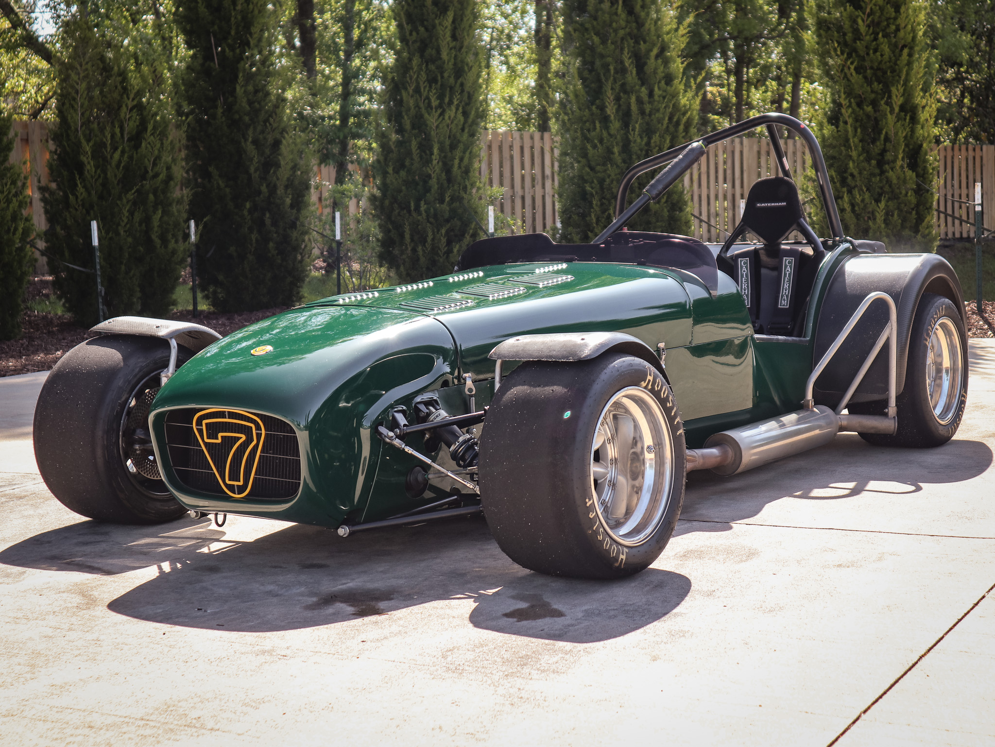 Staggered-width 13″ modular alloy wheels wear Hoosier R25B racing slicks. The car is equipped with a three-way adjustable coilovers with Penske remote reservoirs, and braking is handled by four-wheel discs with Wilwood Dynalite brake calipers and custom drilled rotors. The removed Caterham brake calipers, spare suspension components, and four black wheels wearing Avon tires are included in the sale and are displayed in the photo gallery below.