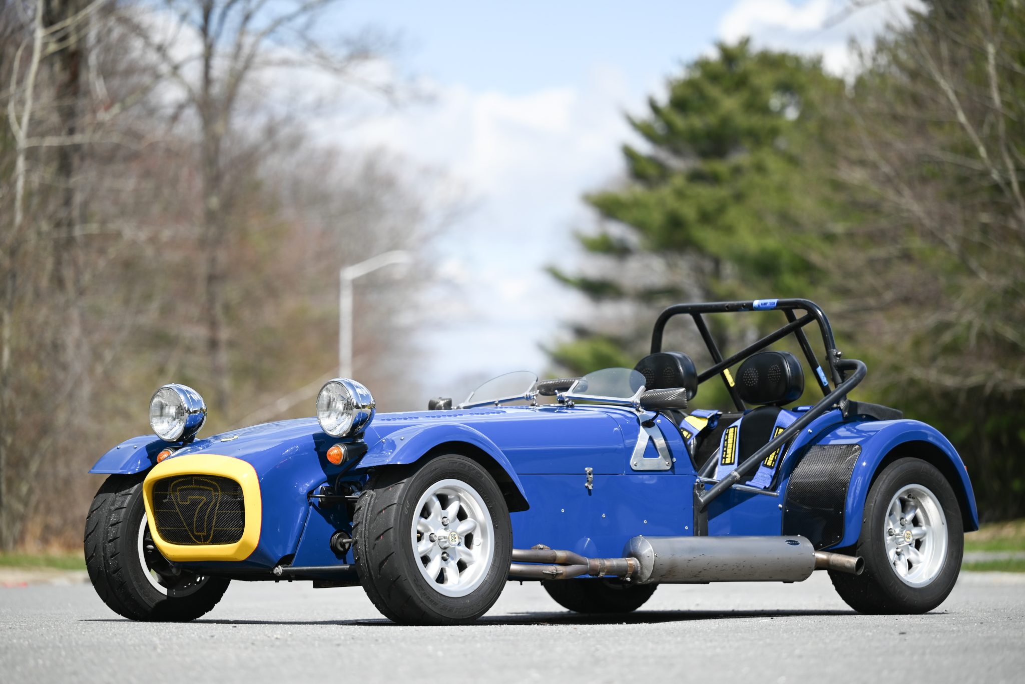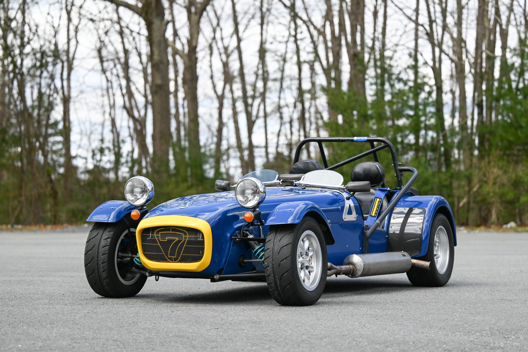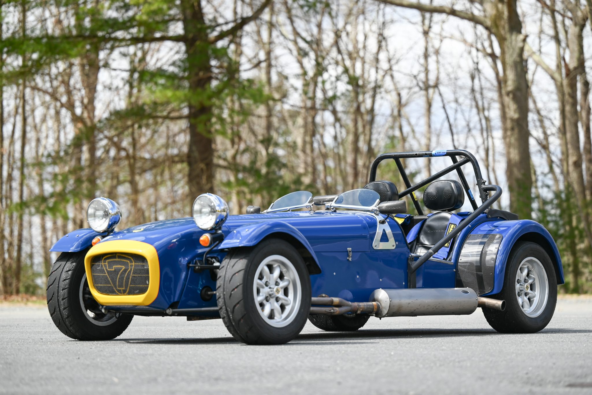 Eight-spoke 13″ Minilite wheels wear 185/60 front Toyo Proxes R888R and 215/55 rear Avon ZZR rear tires. A spare is mounted to the rear. The car is equipped with four-wheel disc brakes and de Dion rear suspension. Work under current ownership is said to have consisted of installing Meteor Nitron NTR1 coilovers and flushing the brake fluid. The removed Bilstein coilovers and set of five 15” Caterham wheels and tires are included in the sale.