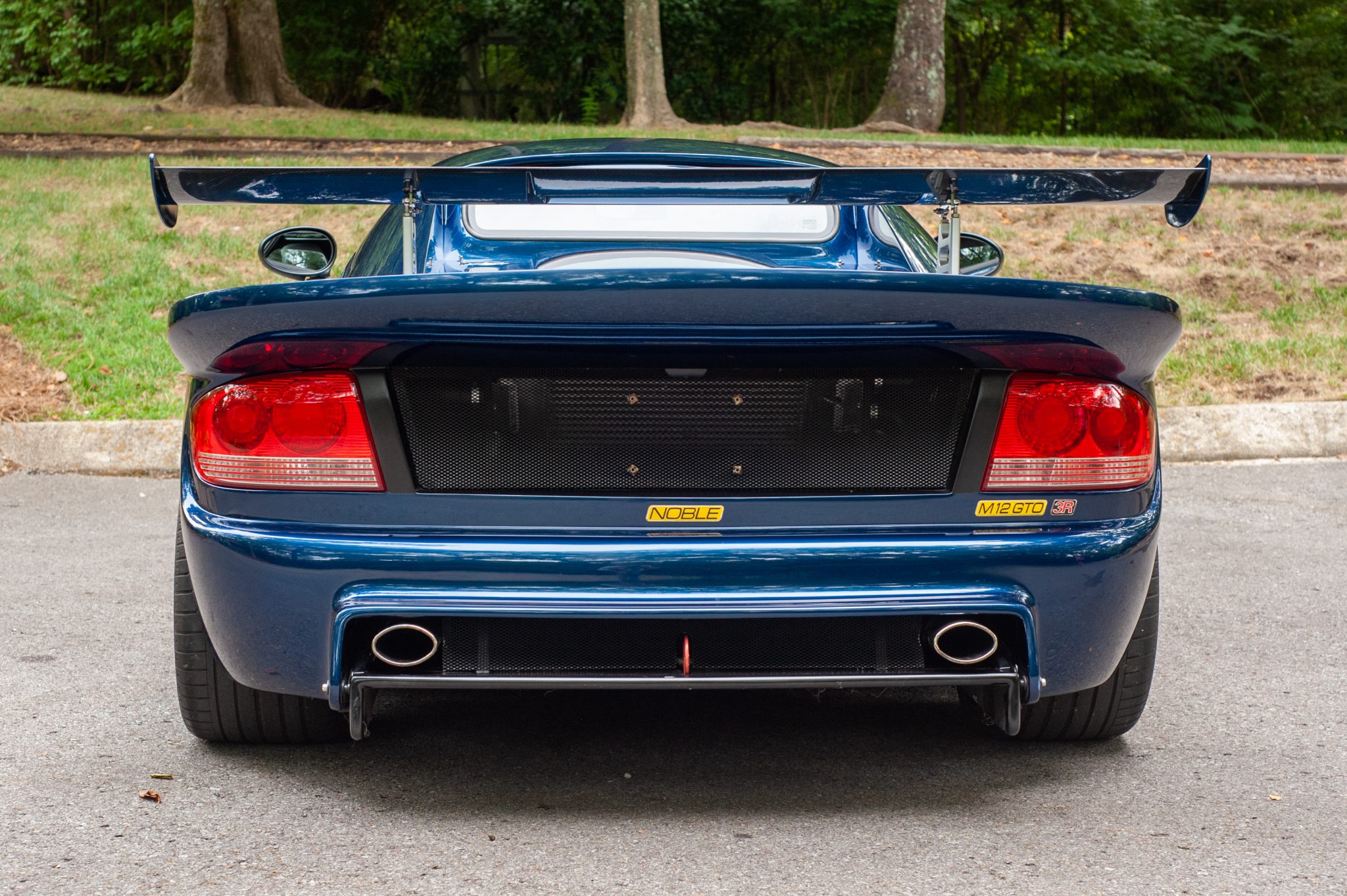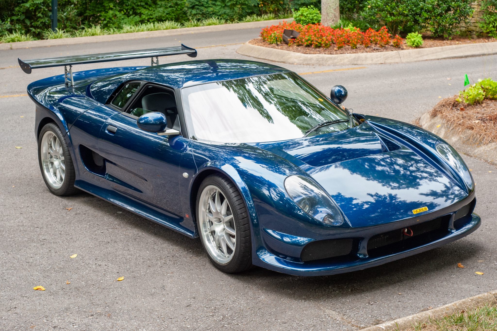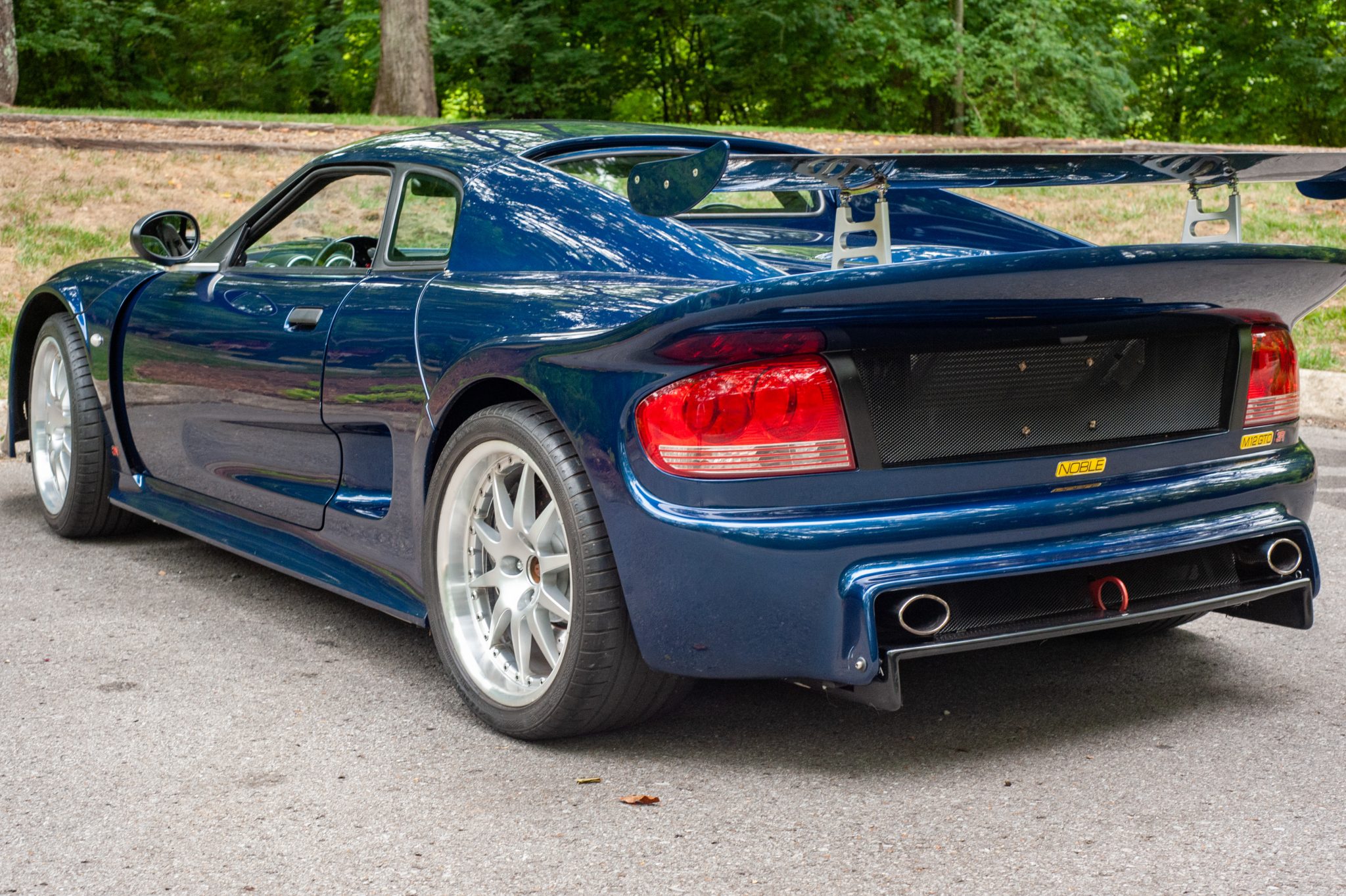 Staggered-width 18″ wheels wear Continental SportContact 2 tires showing 2005 date codes. Braking is from Noble-branded calipers over slotted rotors at the front and cross-drilled rotors at the rear. The brake fluid was serviced in September 2022. A spare set of four wheels wrapped in Hoosier R6 racing tires is included in the sale.