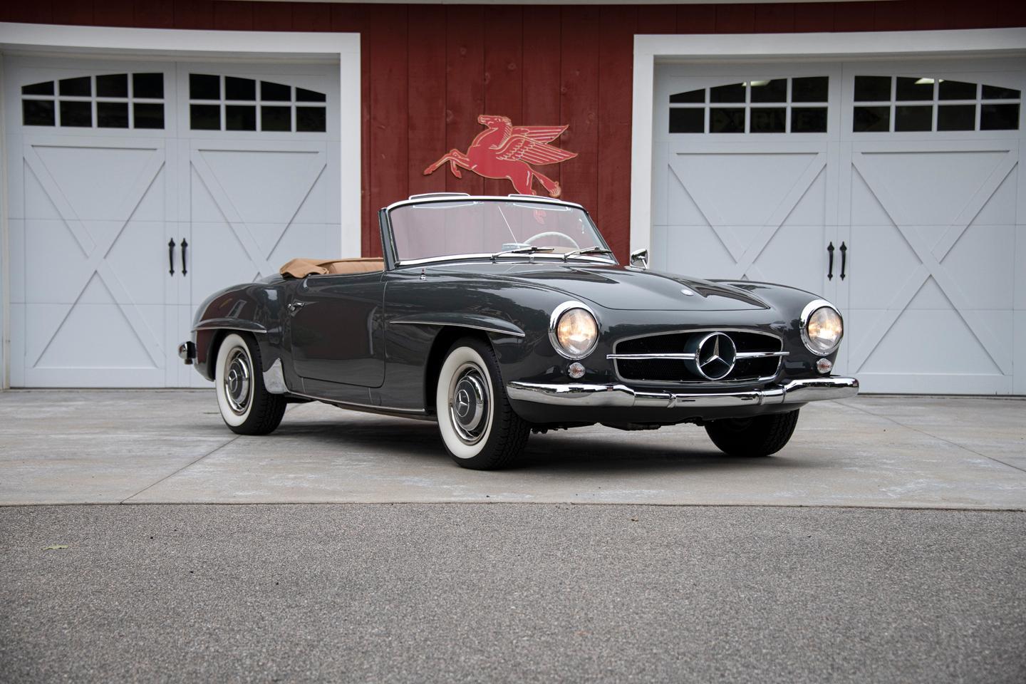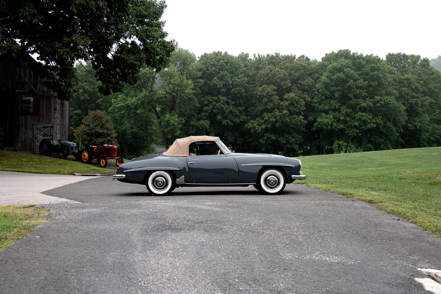 Black-finished 13″ steel wheels with body-color hubcaps and polished trim rings are mounted with 185/80 BFGoodrich Silvertown whitewall tires. The car is equipped with a double-wishbone front suspension, rear swing axles with coil springs, and power-assisted drum brakes. According to the seller, the brake drums, shoes, hoses, and master cylinder were replaced during the refurbishment. The suspension and steering system were also refreshed and repainted.