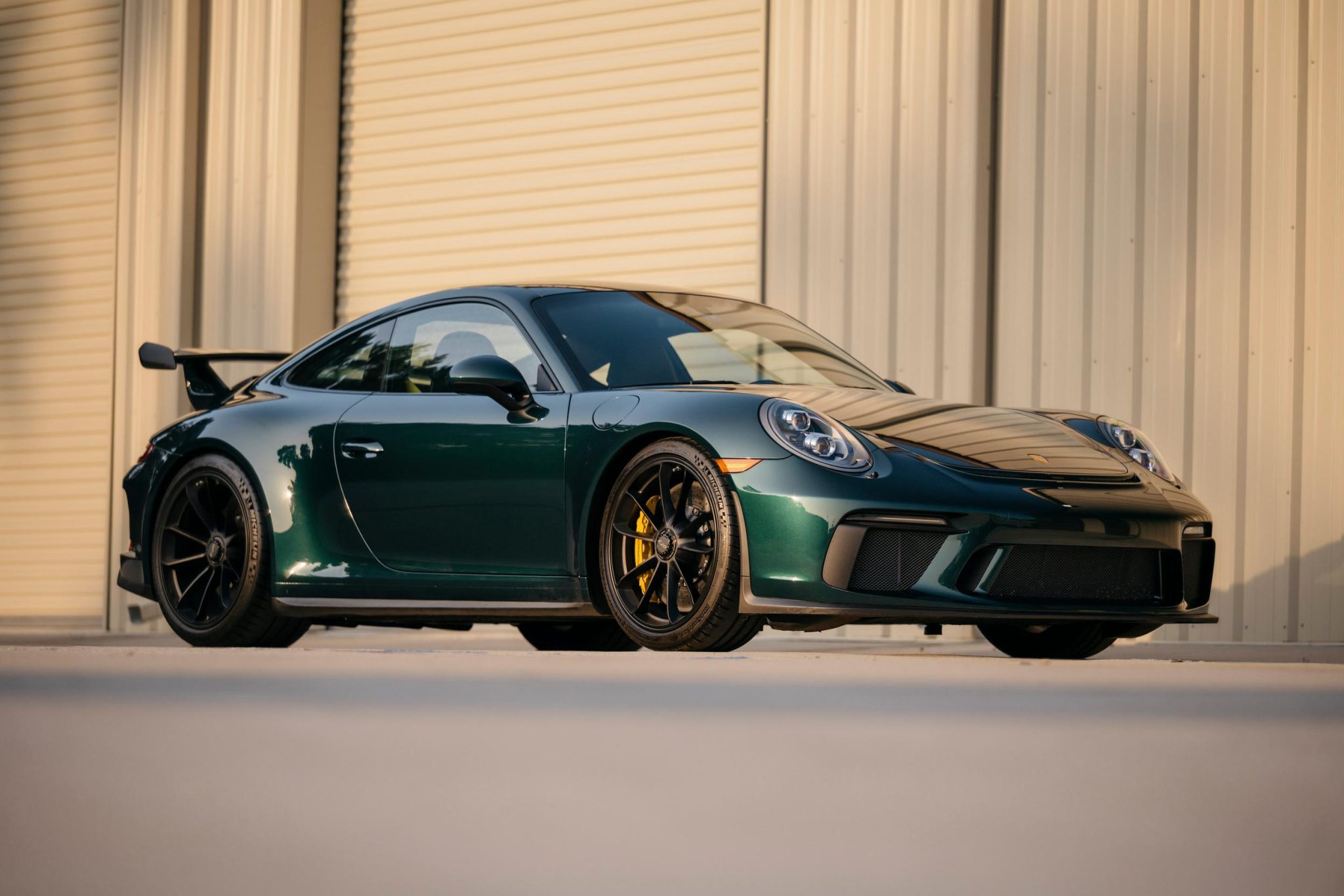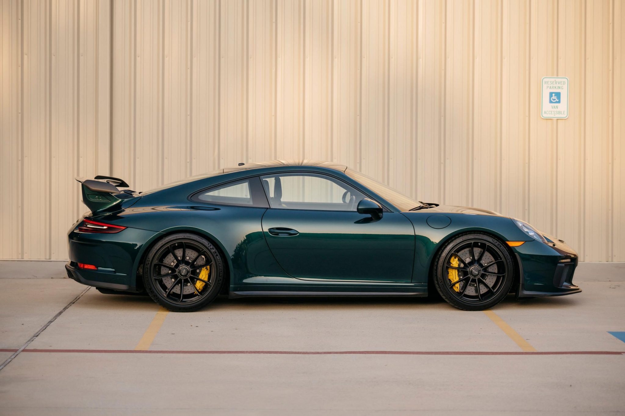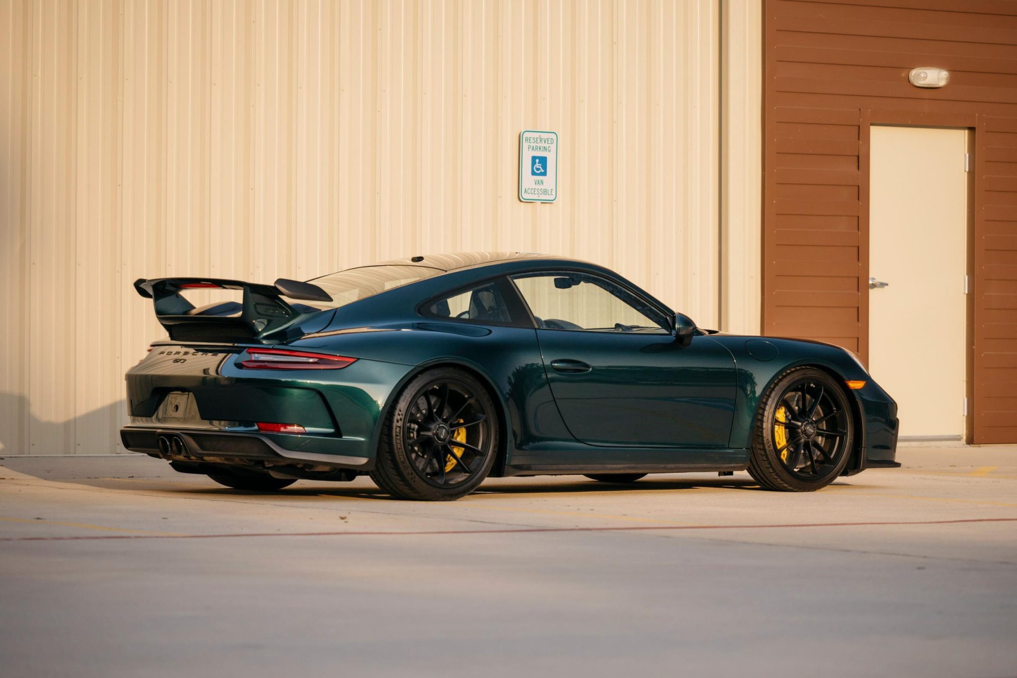 Satin black 20″ center-lock wheels are wrapped in 245/35 front and 305/30 rear Michelin Sport Cup 2 tires. The car is equipped with rear-axle steering, an optional front-axle lift system, and Porsche Ceramic Composite Brakes with yellow calipers.