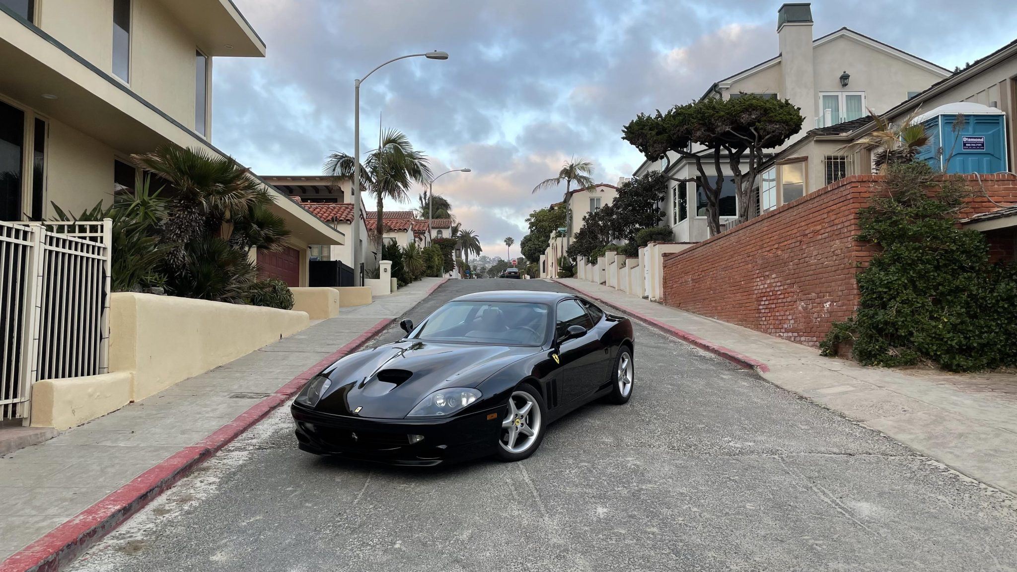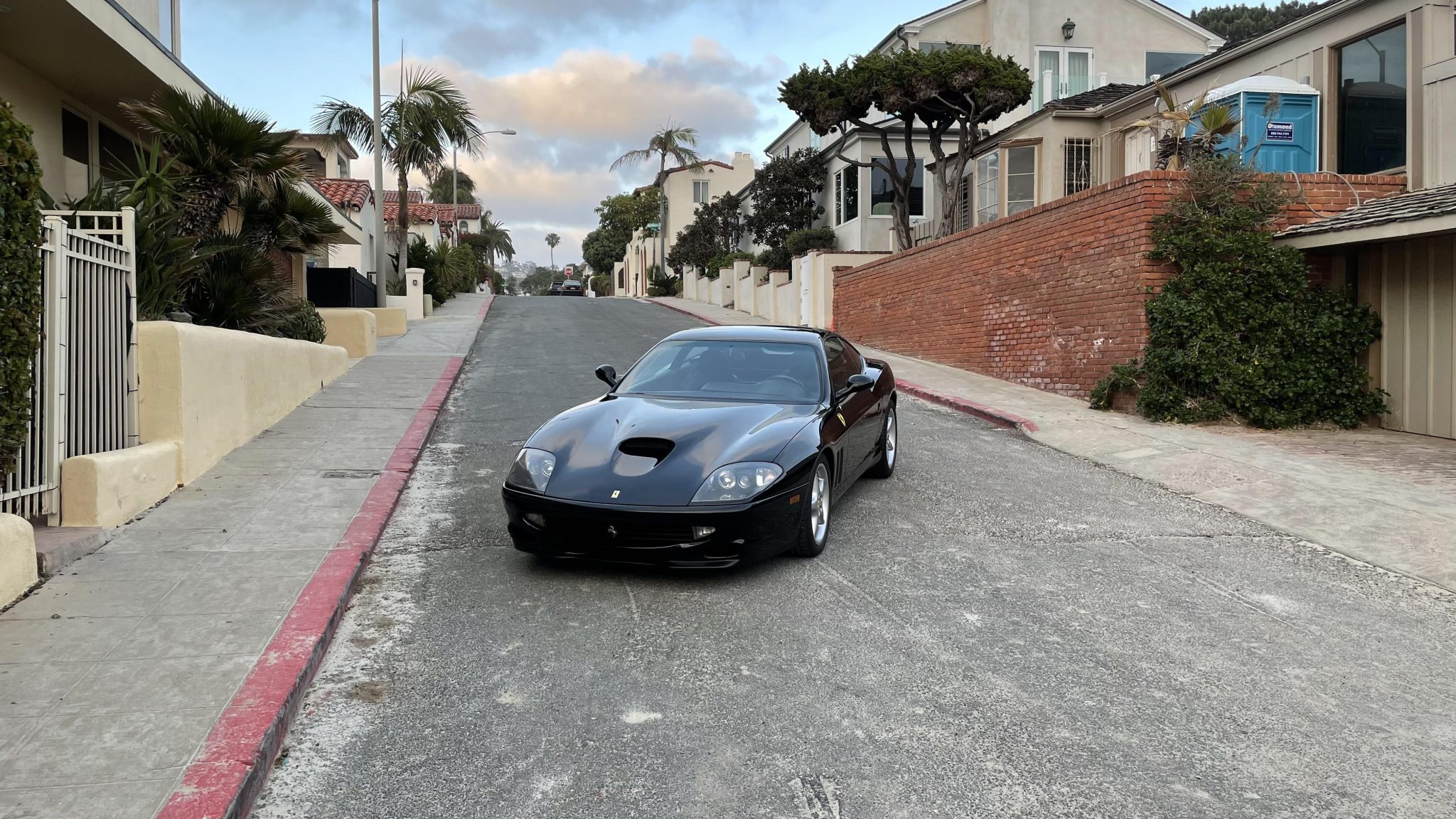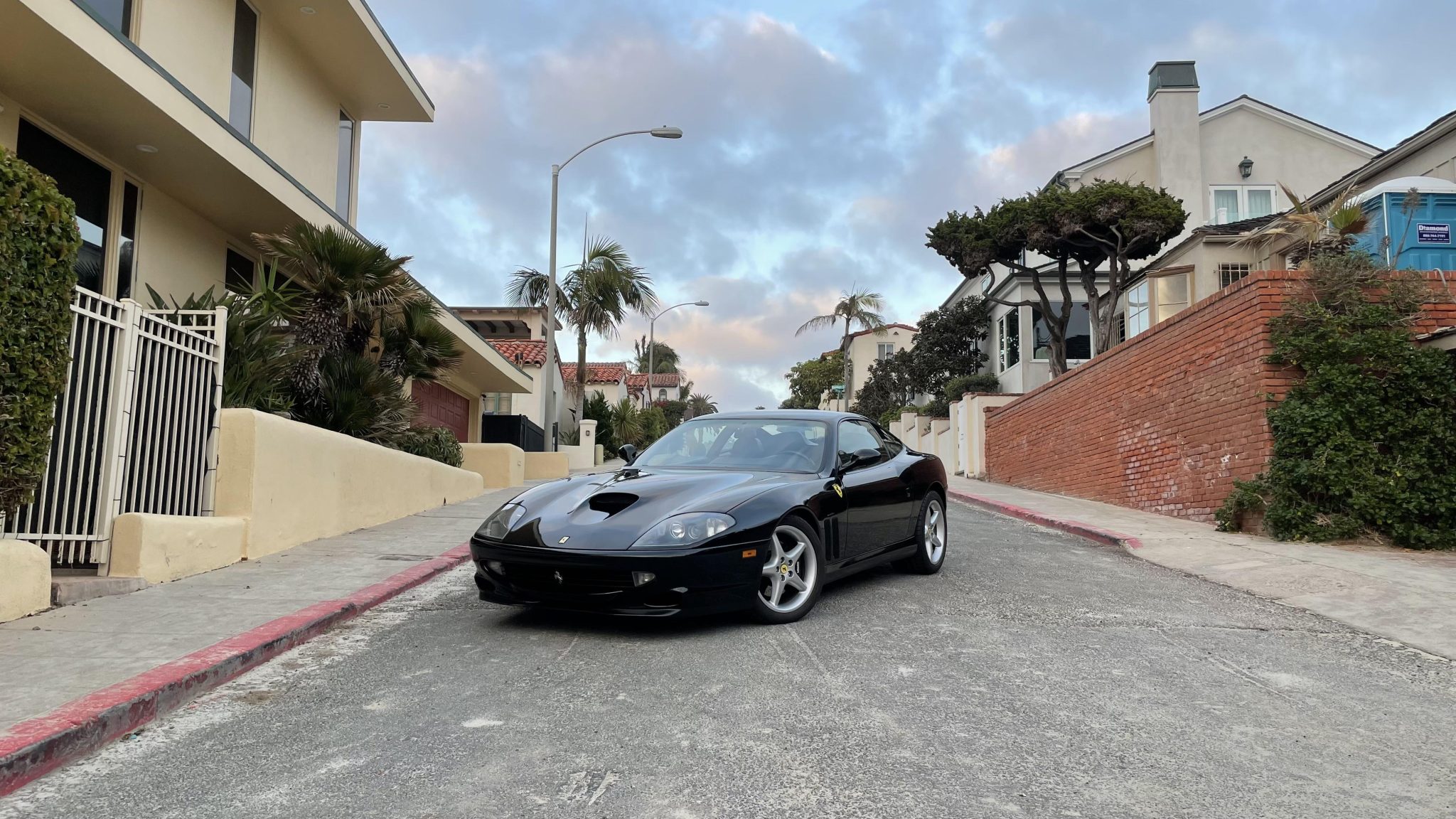 The 18″ five-spoke alloy wheels are wrapped in 255/40 front and 295/35 rear Michelin Pilot Super Sport tires the seller states were mounted in July 2021. Braking is handled by black-finished Ferrari-branded calipers over cross-drilled and ventilated rotors at all four corners, and the seller states spacers are fitted to the rear hubs. Work completed in 2021 included replacing the front suspension bushings and brake ducting.