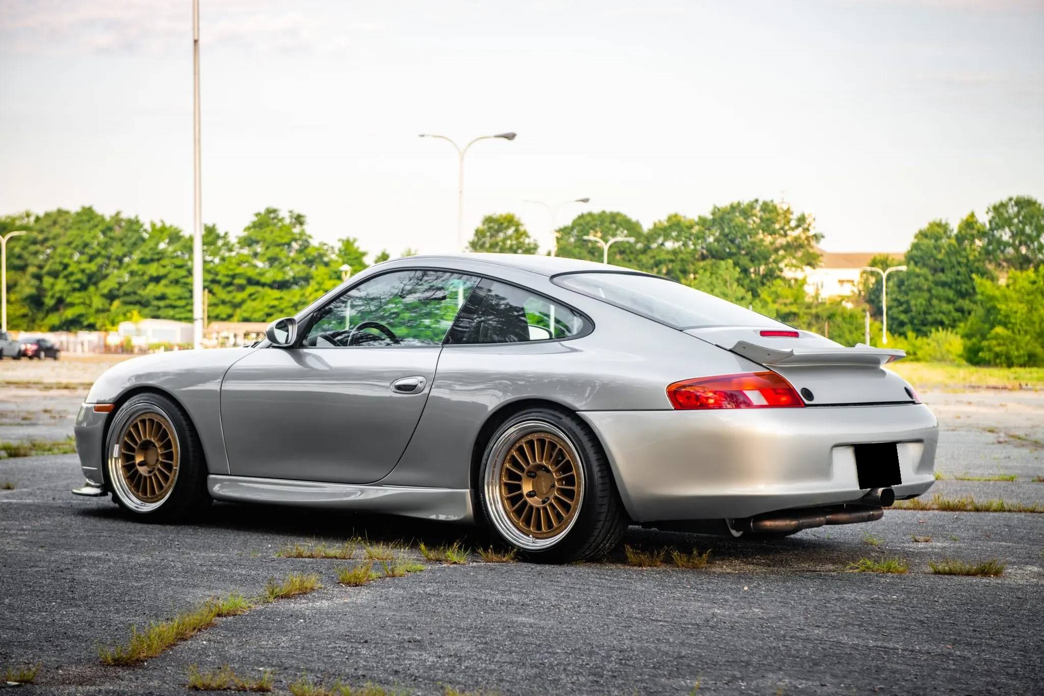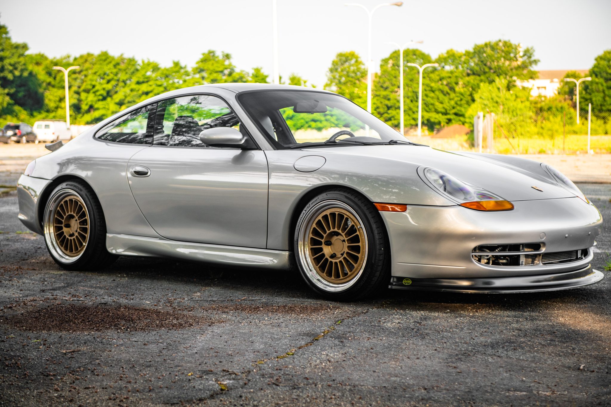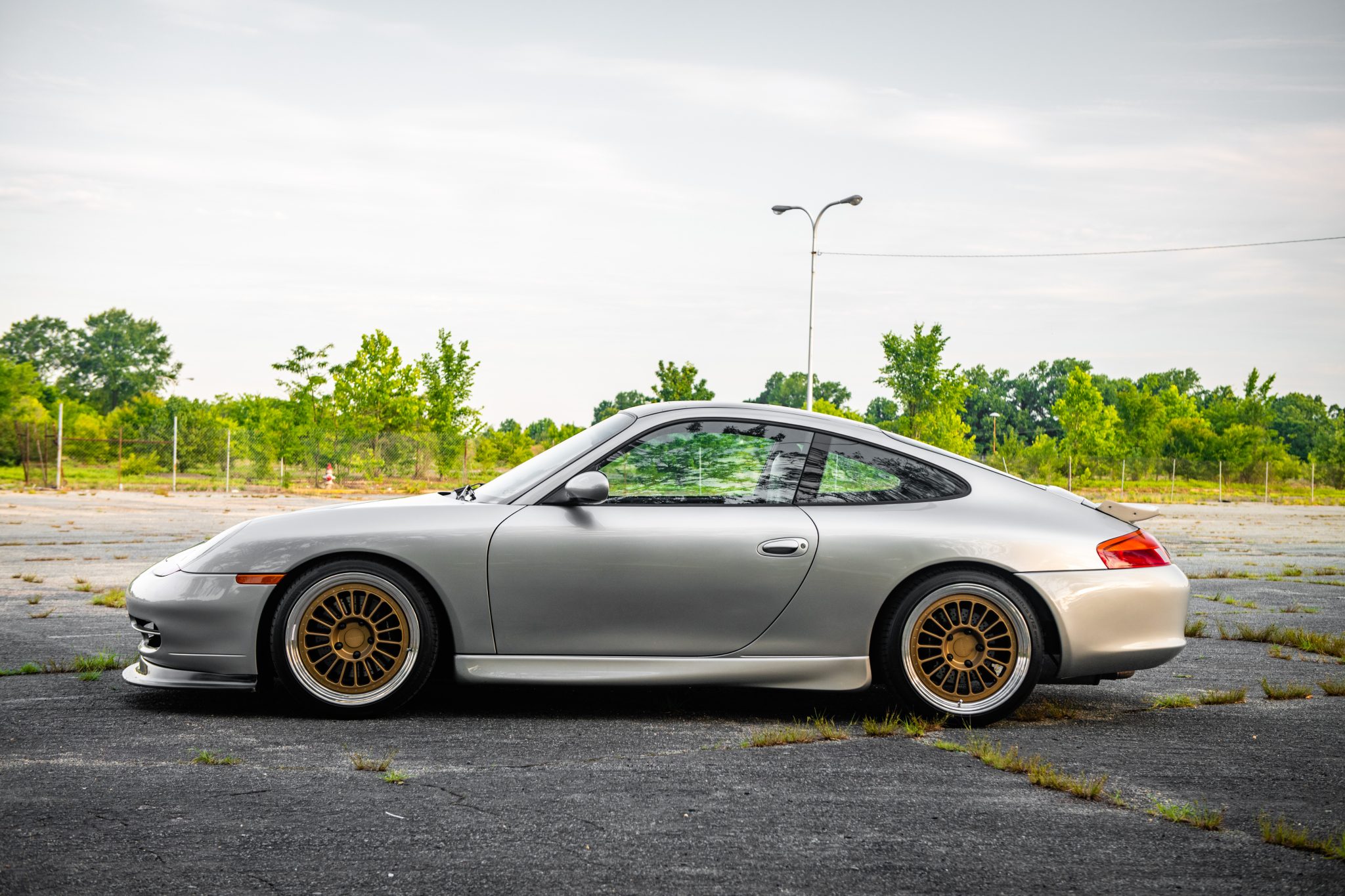 Satin gold-finished 18×9″ and 18×11″ Jongbloed Racing Aero 305 wheels are mounted with Hankook Ventus V12 Evo2 tires that measure 225/40 up front and 265/35 in the rear. The car utilizes aftermarket electric power steering with a front-mounted pump, and additional modifications are said to include H&R lowering springs, drilled and slotted brake rotors, and a 60mm wheel-stud conversion. The inner fenders have been rolled to accommodate the lower stance.