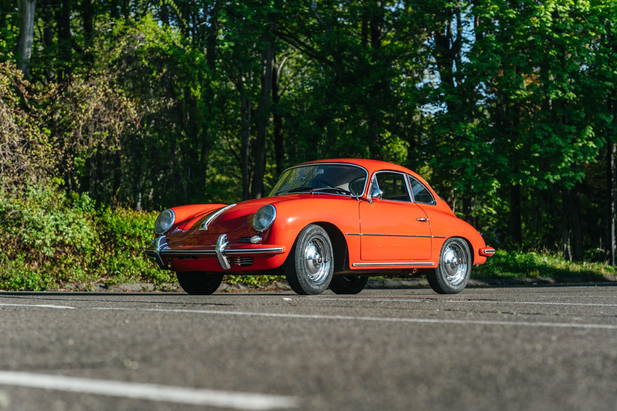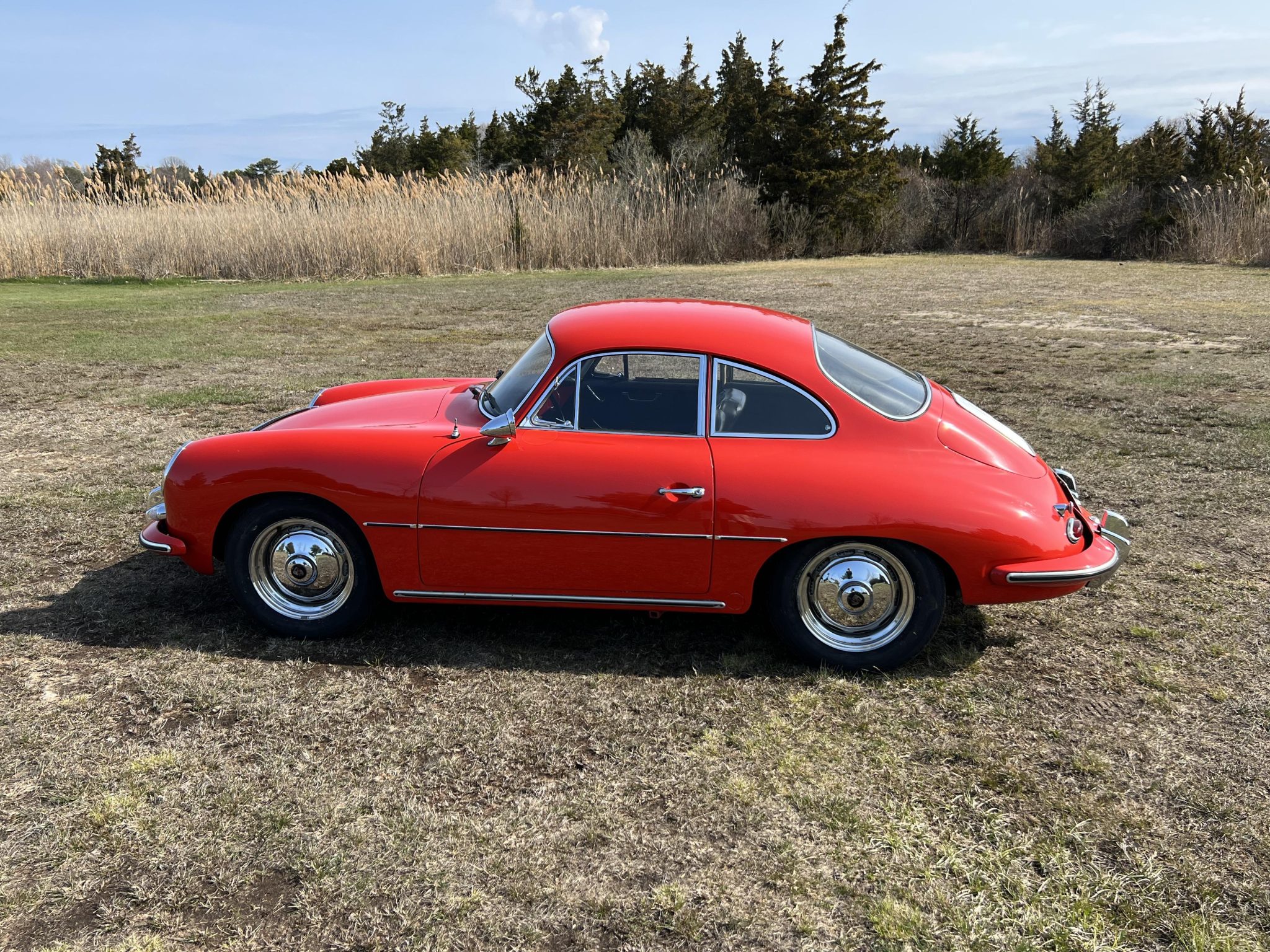 Chrome 15” steel wheels sourced from a Volkswagen model feature polished hubcaps with Porsche center crests, and replacement tires were installed in March 2022. At the same time the brake system was overhauled, which included resurfacing the front drums and replacing the shoes and wheel cylinders. The front and rear brake hoses were also replaced in March 2022, and the system was bled.
