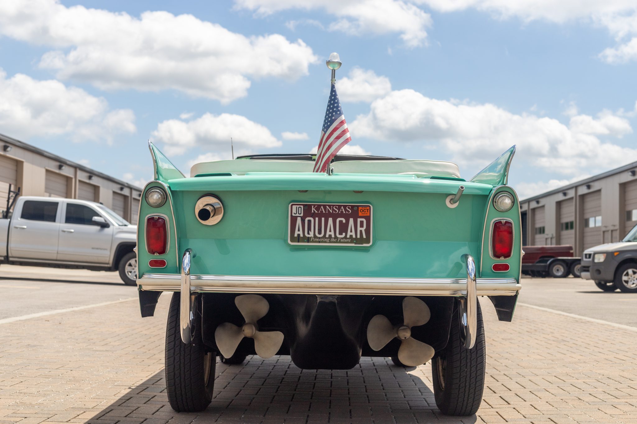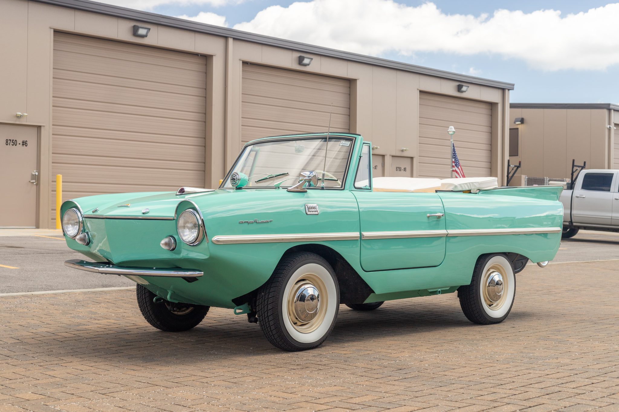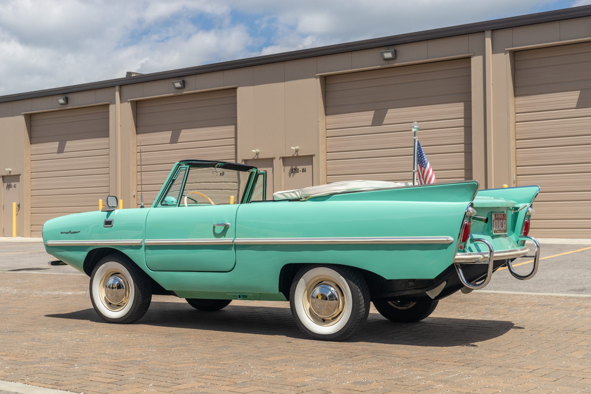 The yellow 13″ steel wheels wear chrome hubcaps and are mounted with radial whitewall tires. The front wheels serve as rudders when the car is afloat, and braking while on the ground is handled by hydraulic drums at each wheel.