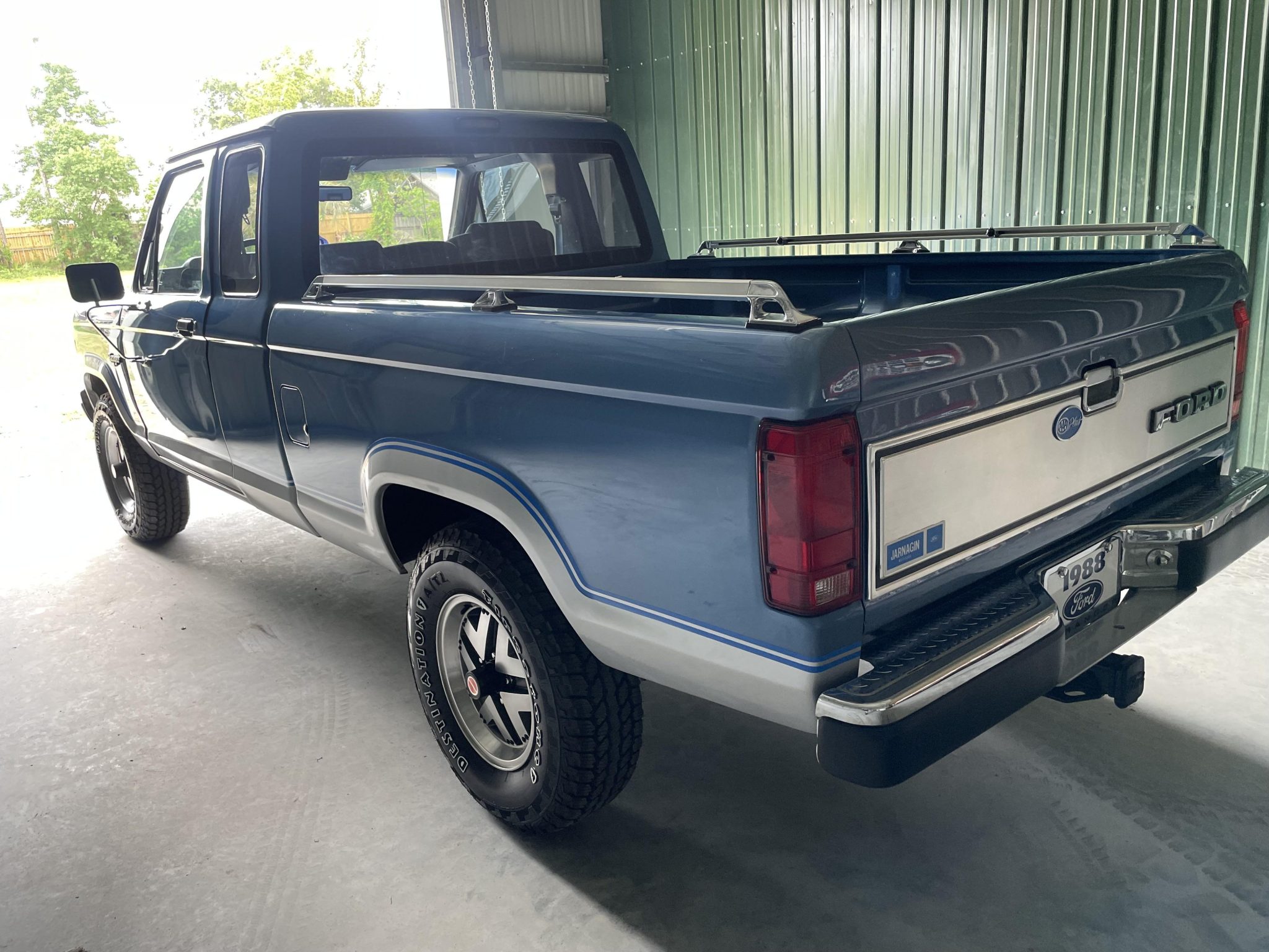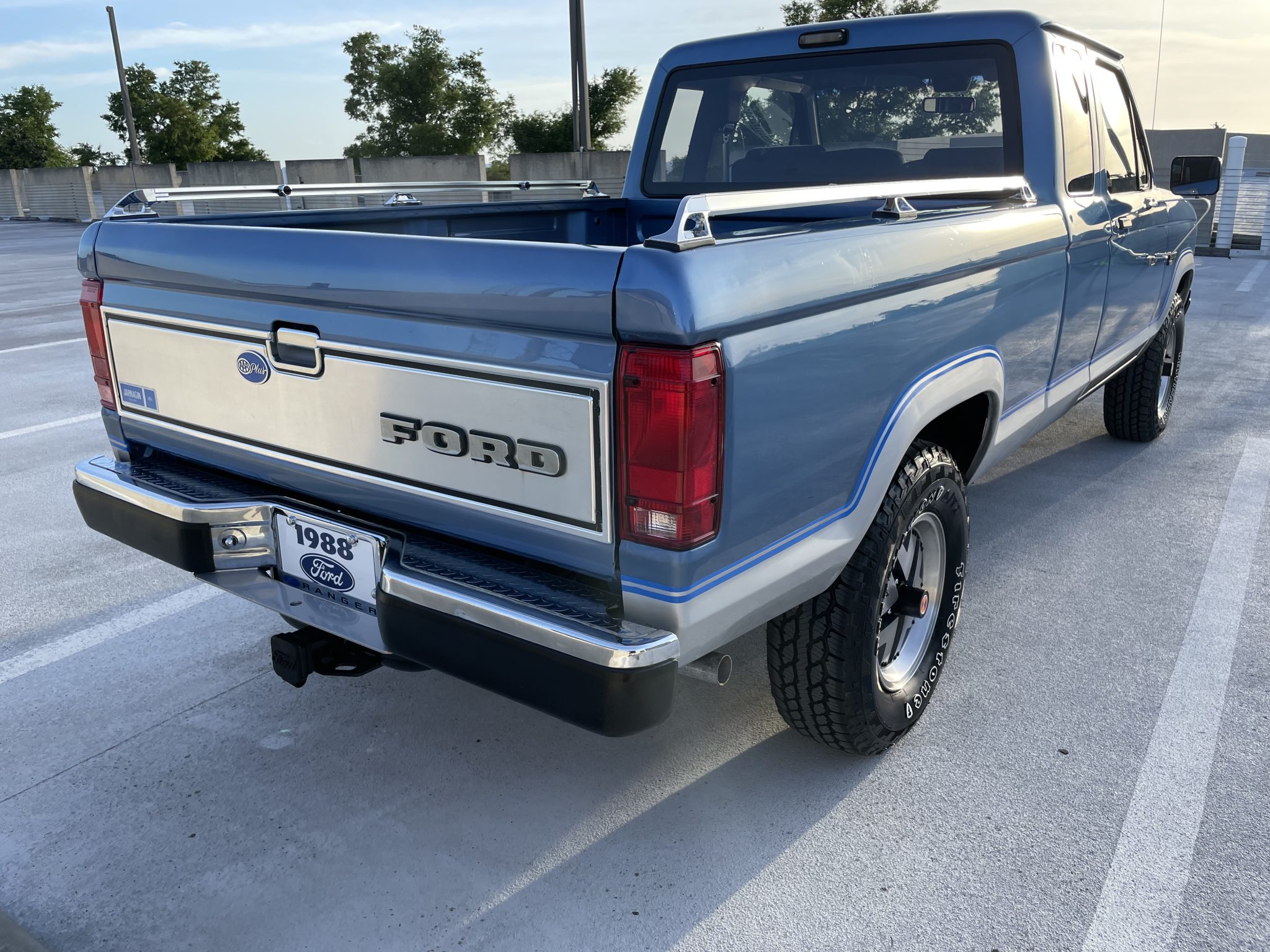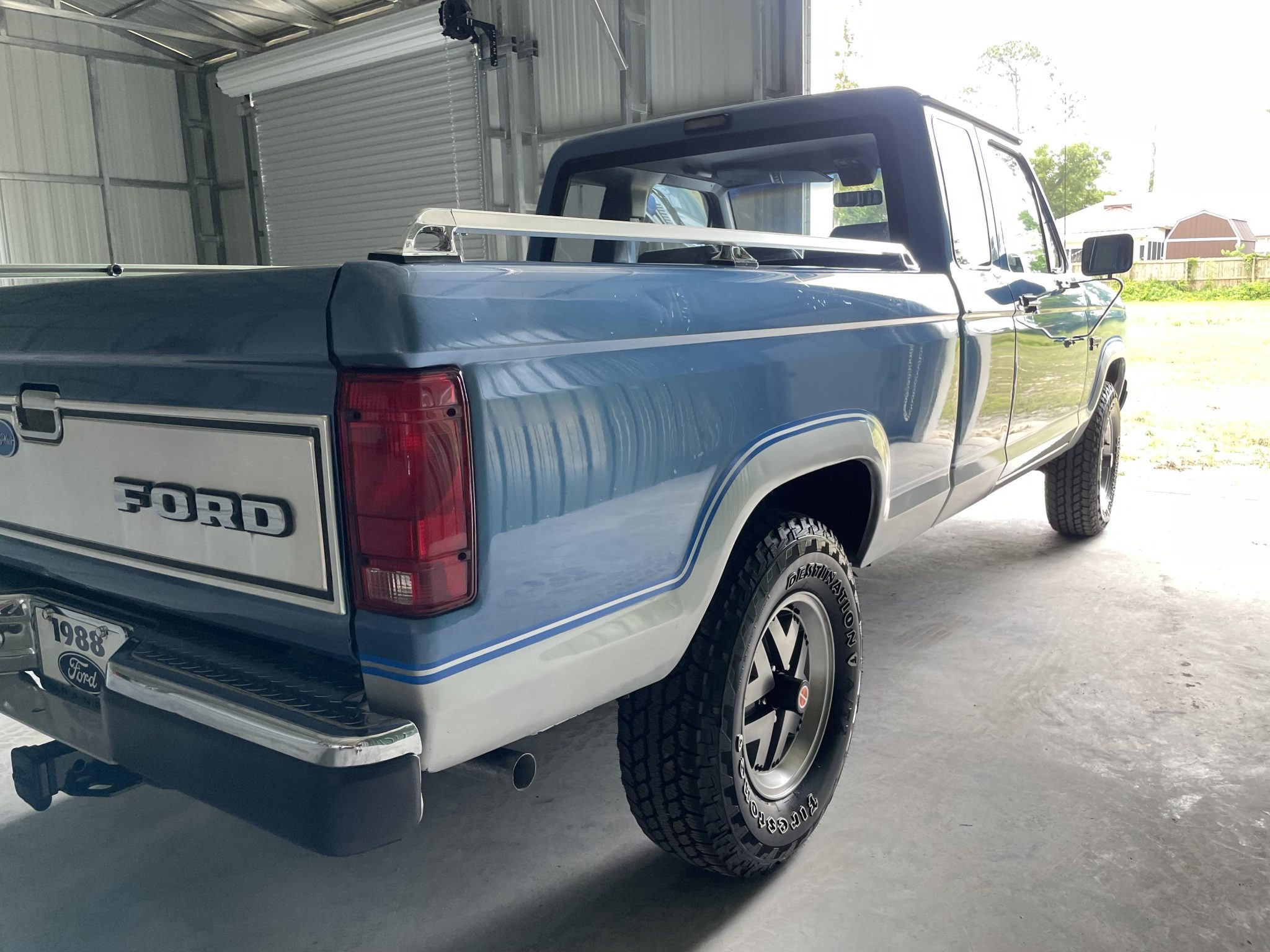 Silver-finished 15″ alloy wheels wear 235/75 Firestone Destination A/T 2 white-letter tires. A spare is located on the underside of the bed. Stopping power is provided by front disc and rear drum brakes, and the truck is equipped with Ford Motorcraft shocks.