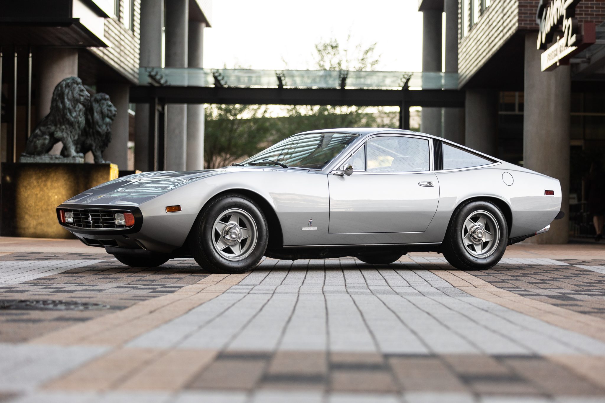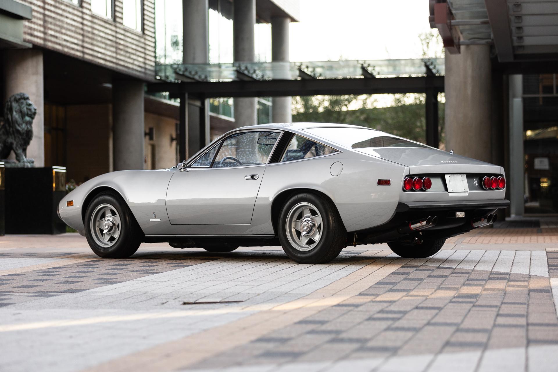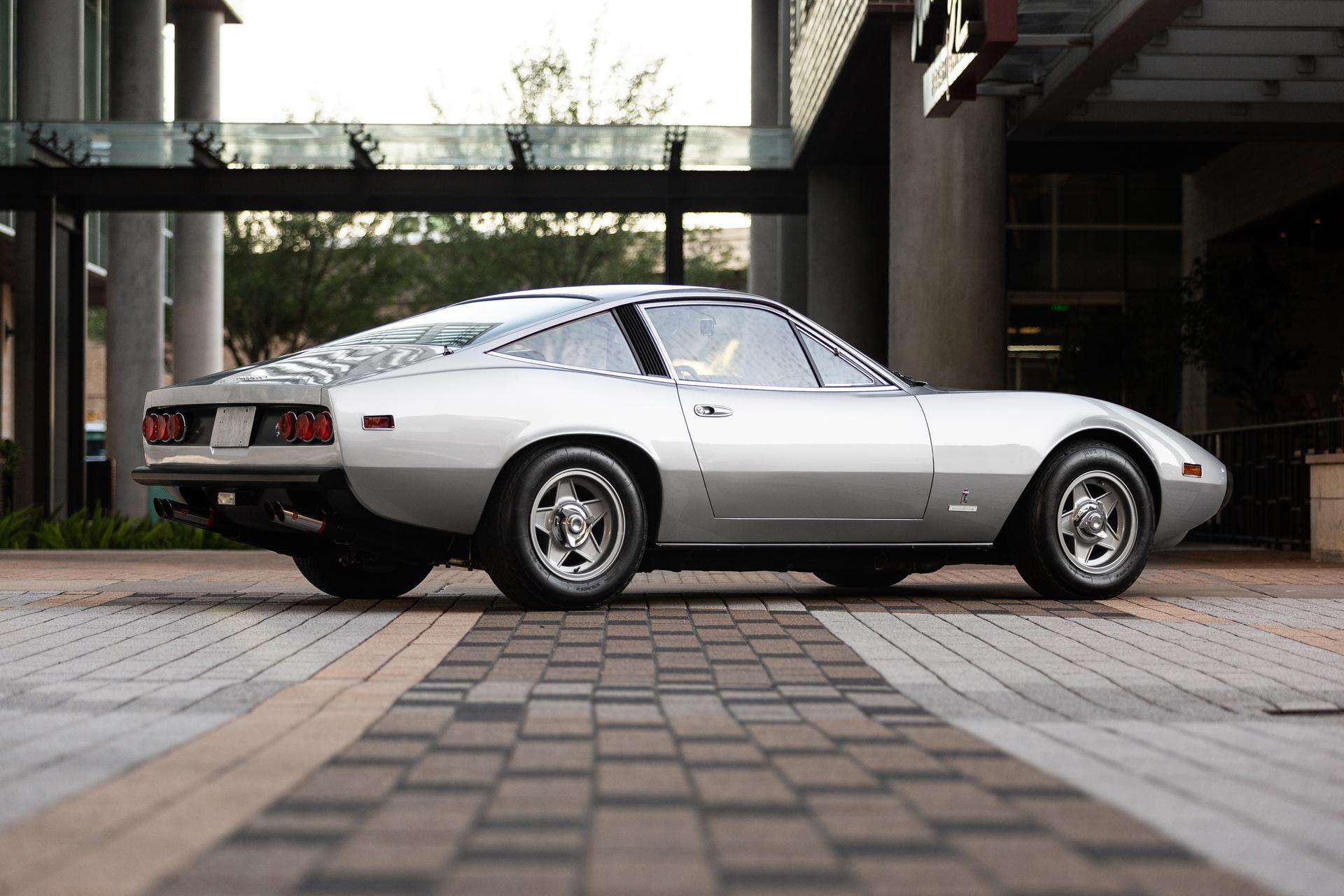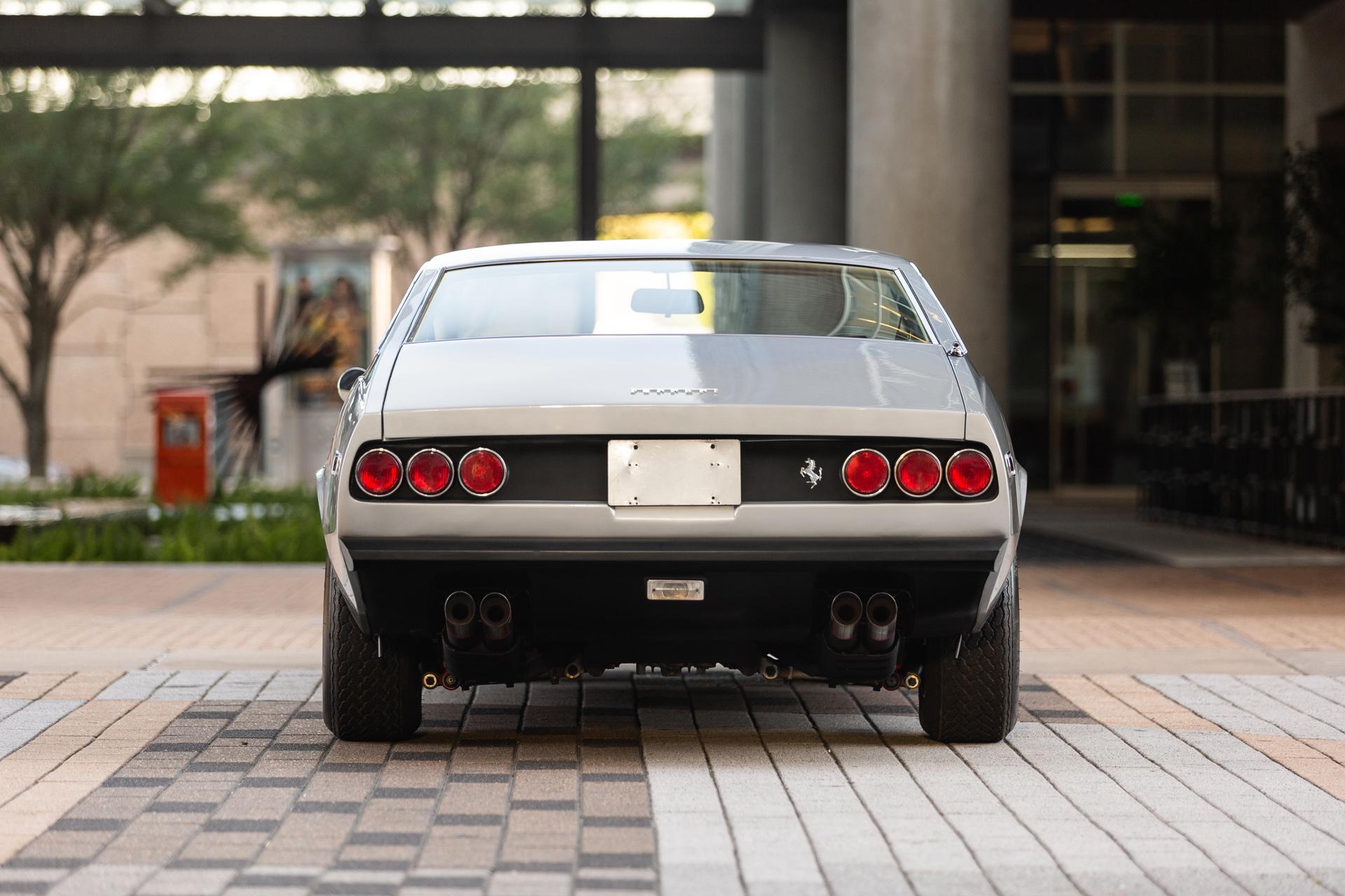 The 15″ Cromodora wheels show 1972 date stampings and are mounted with Borrani knock-off hubs and 215/70 Michelin XWX tires, the latter showing 2015 date codes. A 1971-dated matching spare wheel and tire are mounted below the trunk floor. Both steering and braking systems are power-assisted. Replacement rear Koni adjustable coilovers were installed by the selling dealer in 2022, and the removed Koni self-leveling units are included in the sale.