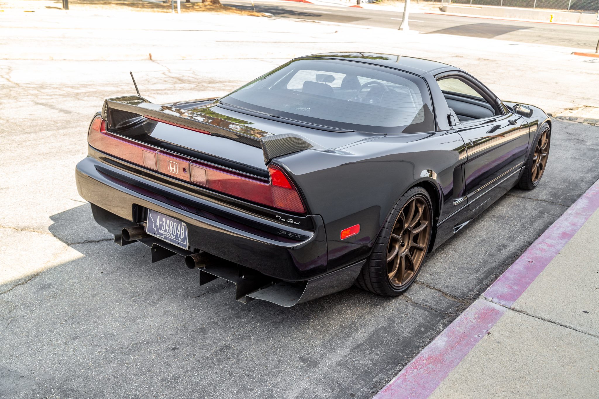 Staggered-diameter Volk Racing ZE40 forged wheels measure 18″ up front and 19″ out back and wear 225/35 and 255/30 Michelin Pilot Super Sport tires, respectively. The brake system utilizes Project Mu two-piece four-piston aluminum brake calipers over 355mm rotors up front, and the seller states that JRZ RS coilovers are installed at each corner.