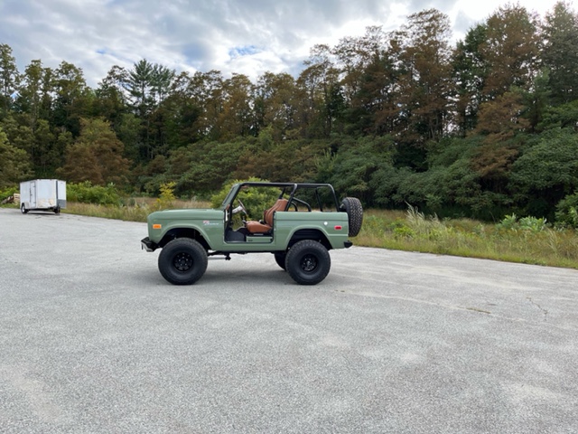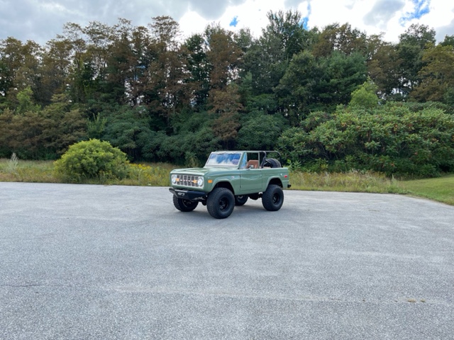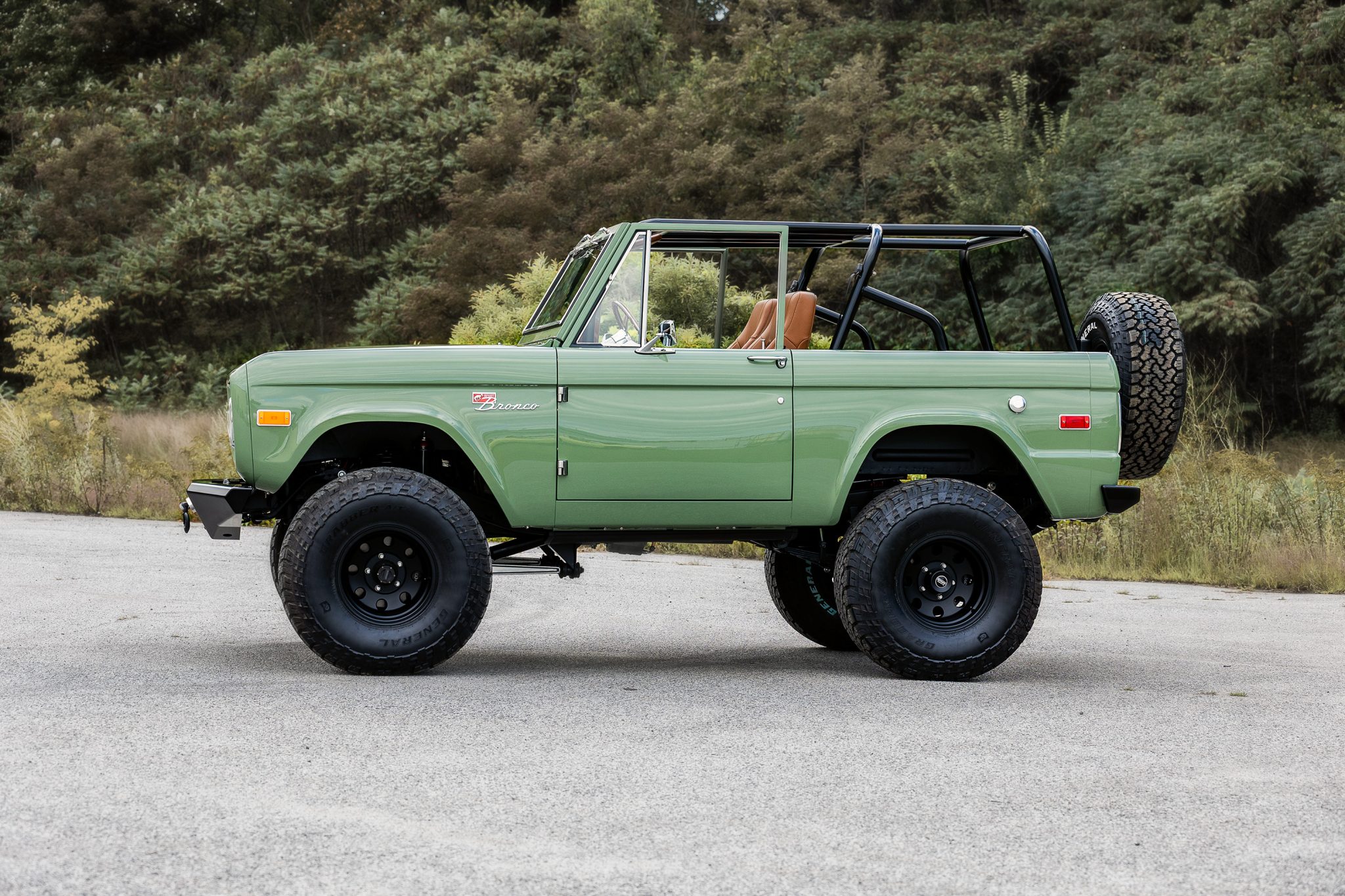 American Racing 15″ wheels are mounted over manually-locking front hubs and are wrapped in 35 x 12.5″ General Grabber A/TX tires. The truck is equipped with power steering, and modifications reported by the seller include a 2.5″ suspension lift, a 2″ body lift, front and rear sway bars with quick-disconnect links, and a retrofitted Wilwood disc brake system with six-piston front and four-piston rear calipers.
