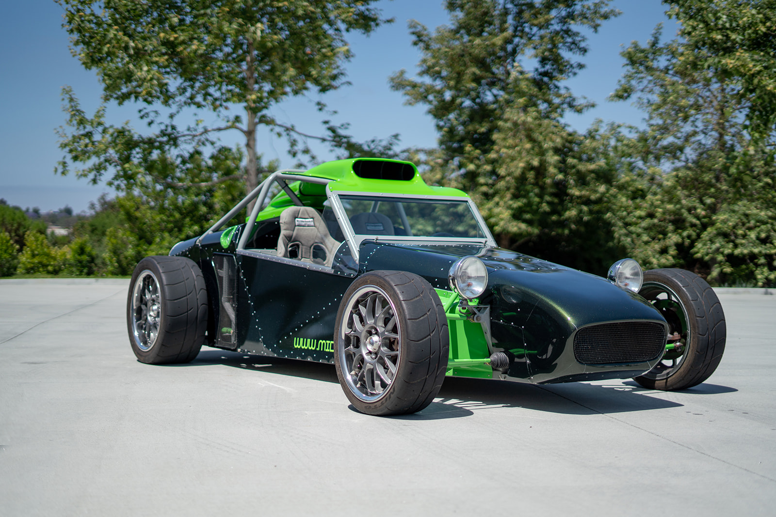 The front suspension utilizes pushrods with tubular control arms as well as a steering rack and uprights designed for an NA-generation Mazda Miata. In the rear, upper control arms are paired with lower lateral links and trailing links, and each corner is equipped with two-way-adjustable QA1 coilovers. The seller states that the vehicle specifications are as follows: