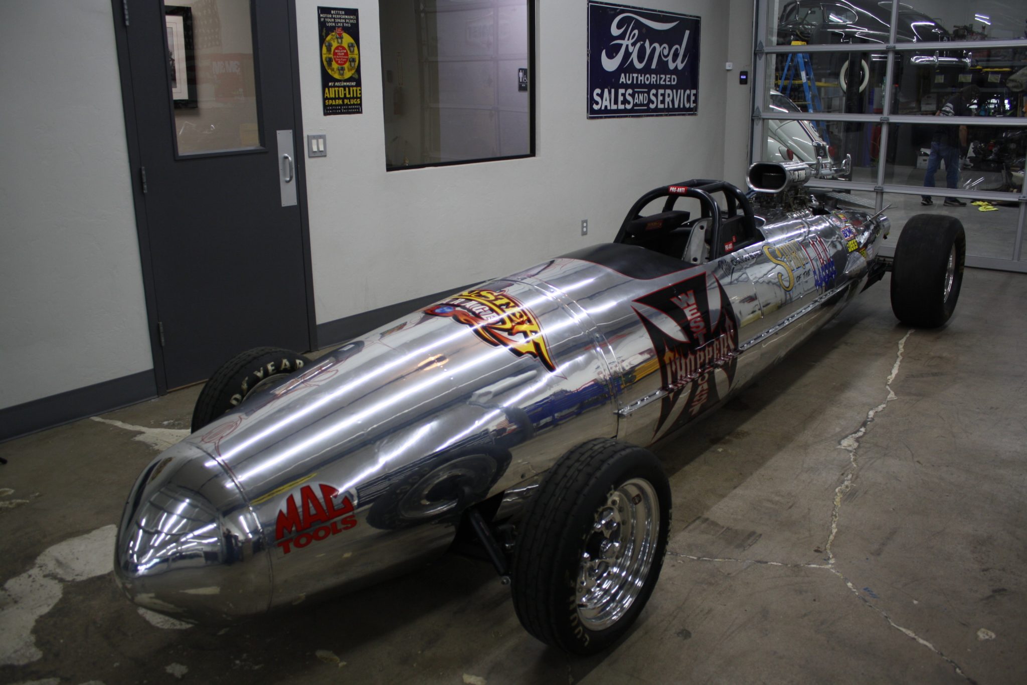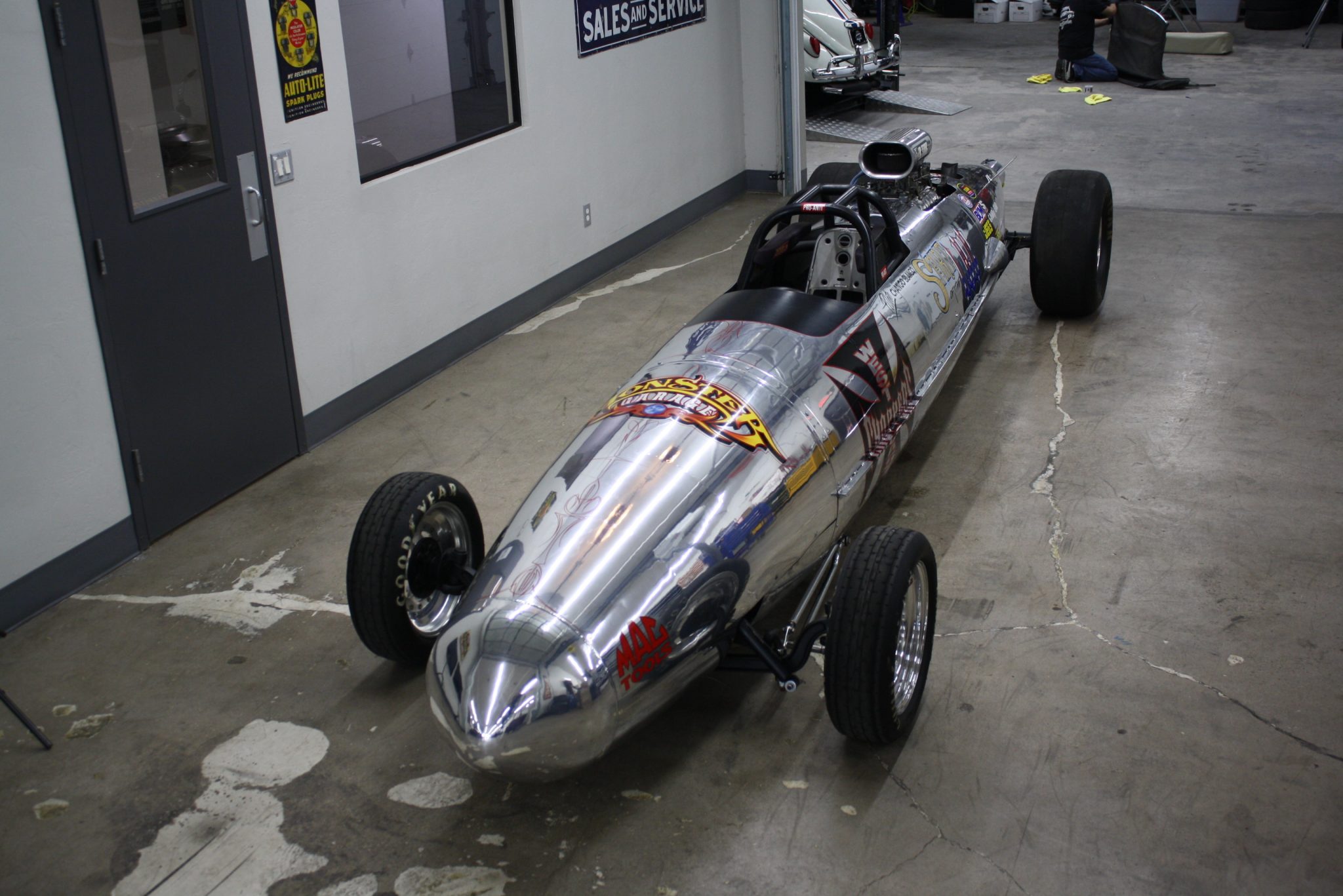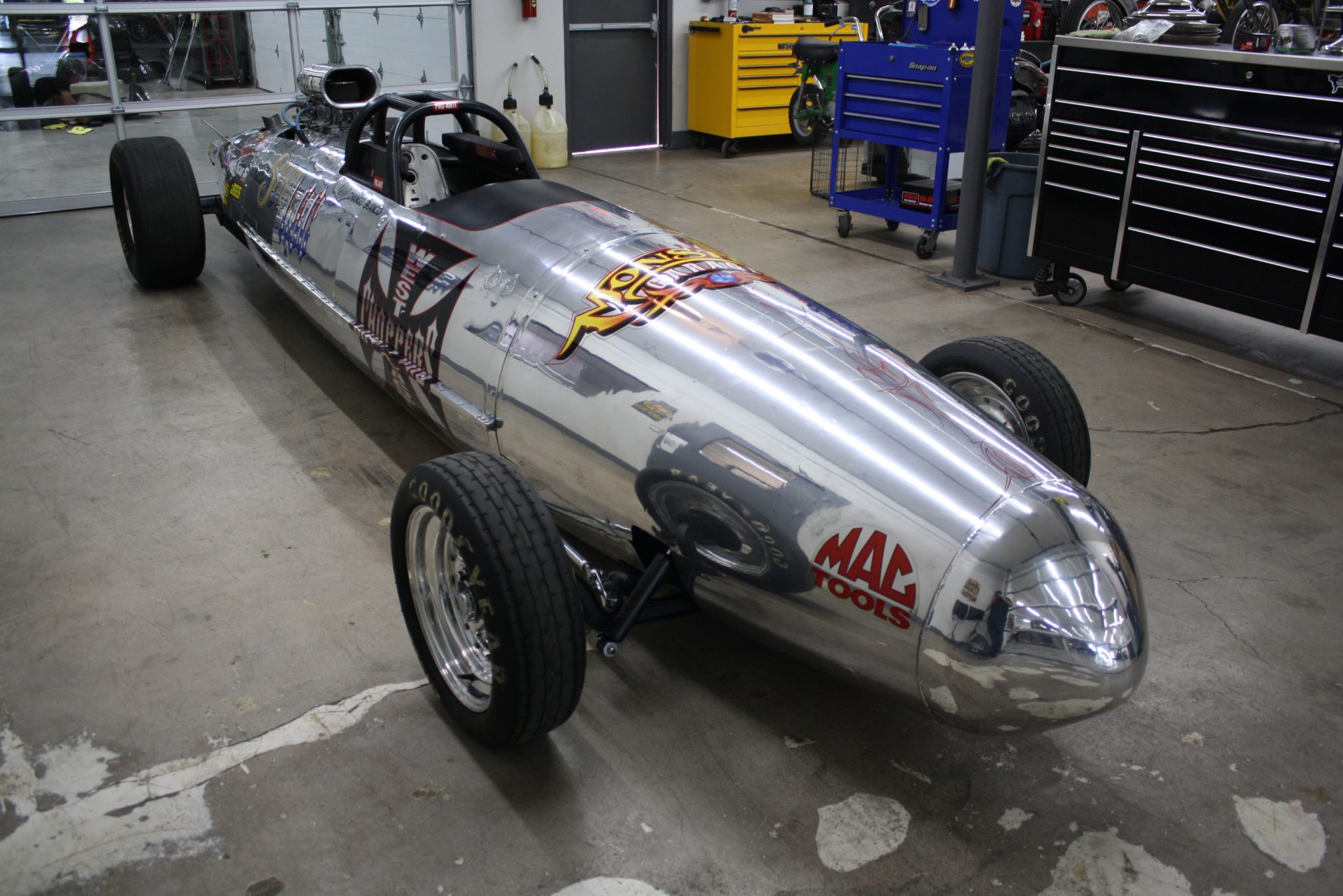 Polished three-piece Aluma Star wheels from Weld Racing wear 8.20-15 Eagle Front Runner drag tires up front and 23×5-15 Goodyear Eagle Dragway Special tires at the rear.