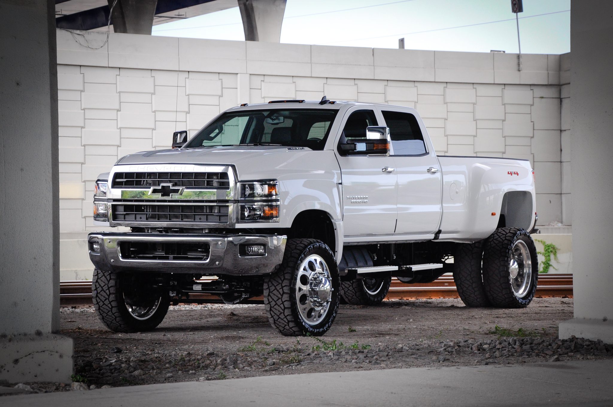 Polished 24” wheels are mounted with 37×10.5” Nitto Ridge Grappler tires. Air shocks are reportedly equipped up front, while the selling dealer notes that one of the factory rear leaf springs was removed out back to lower the ride height. Stopping power is provided by four-wheel disc brakes with an exhaust-brake system. The selling dealer notes that the Stabilitrak warning light illuminates when driving.