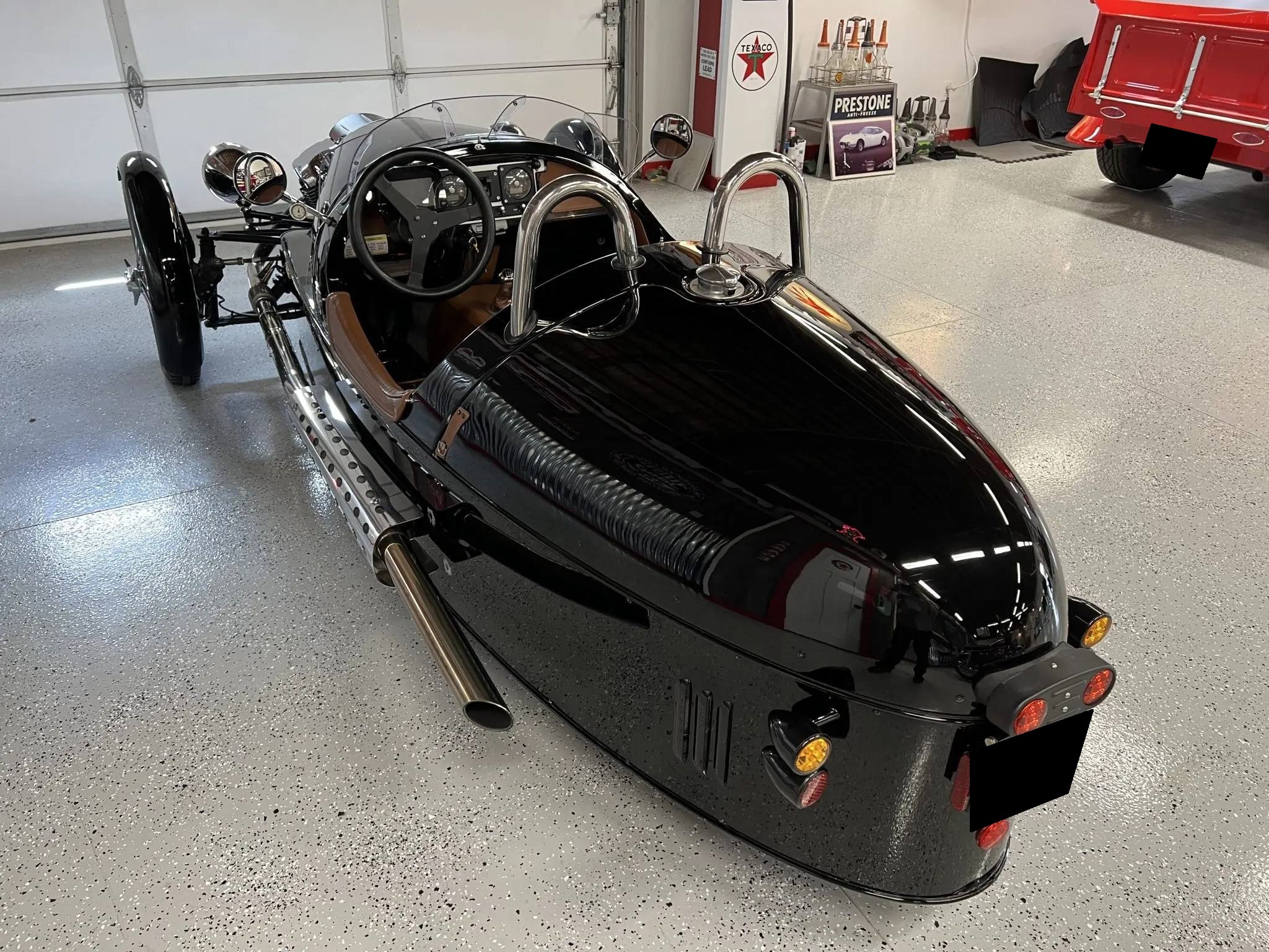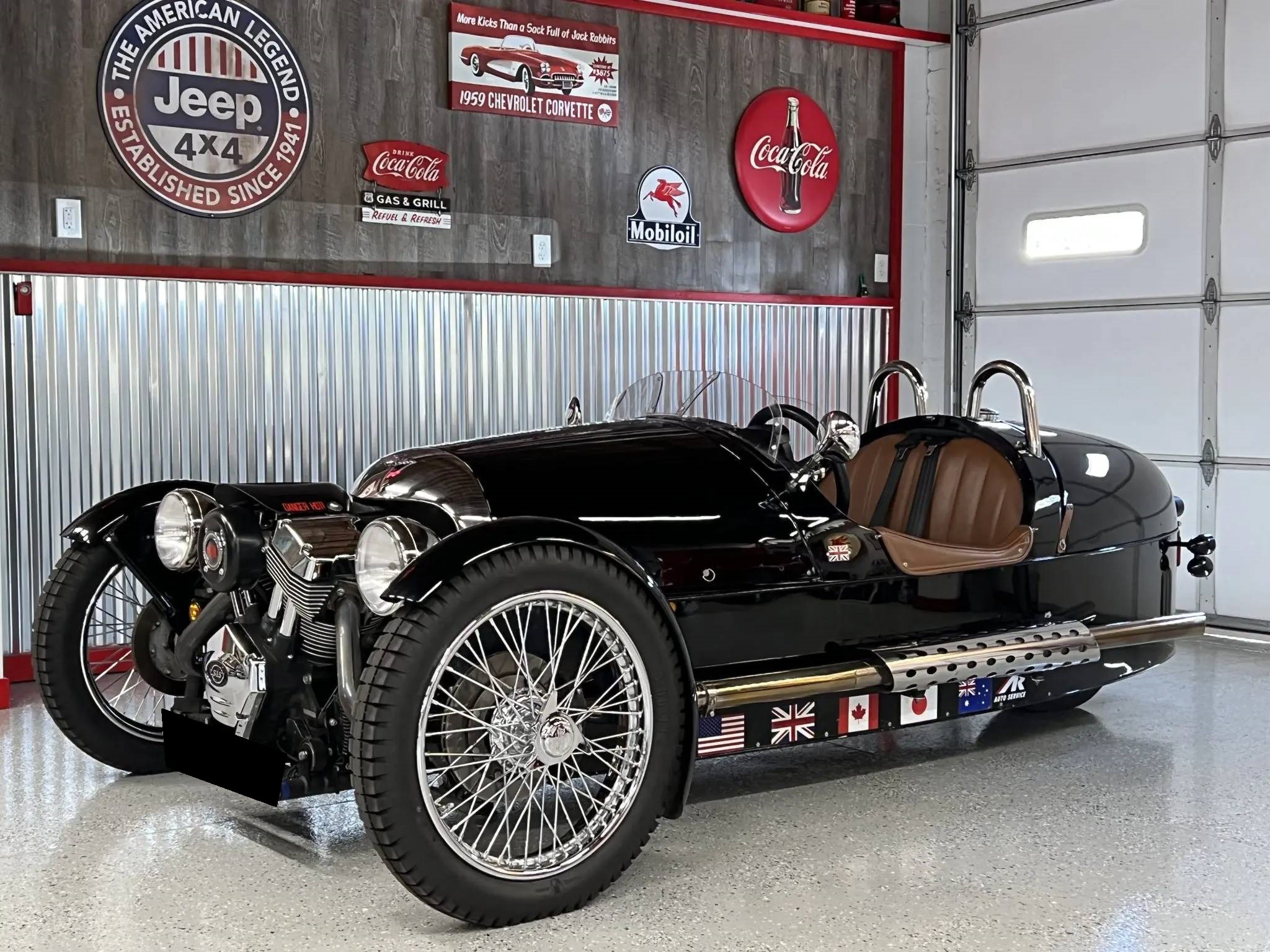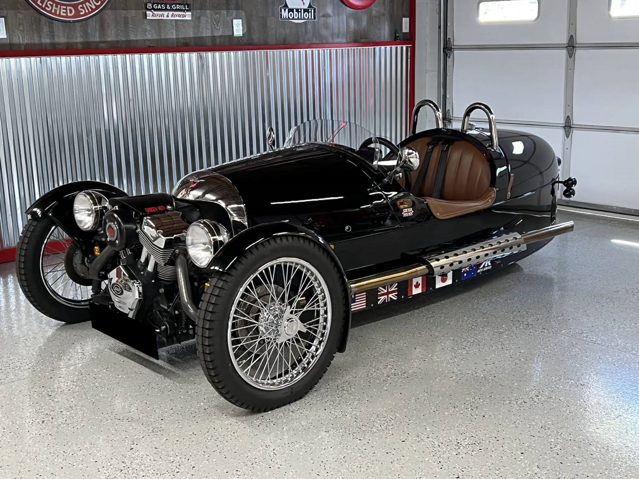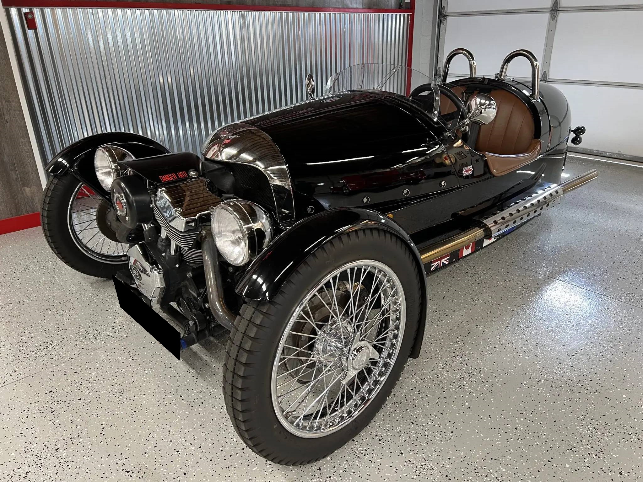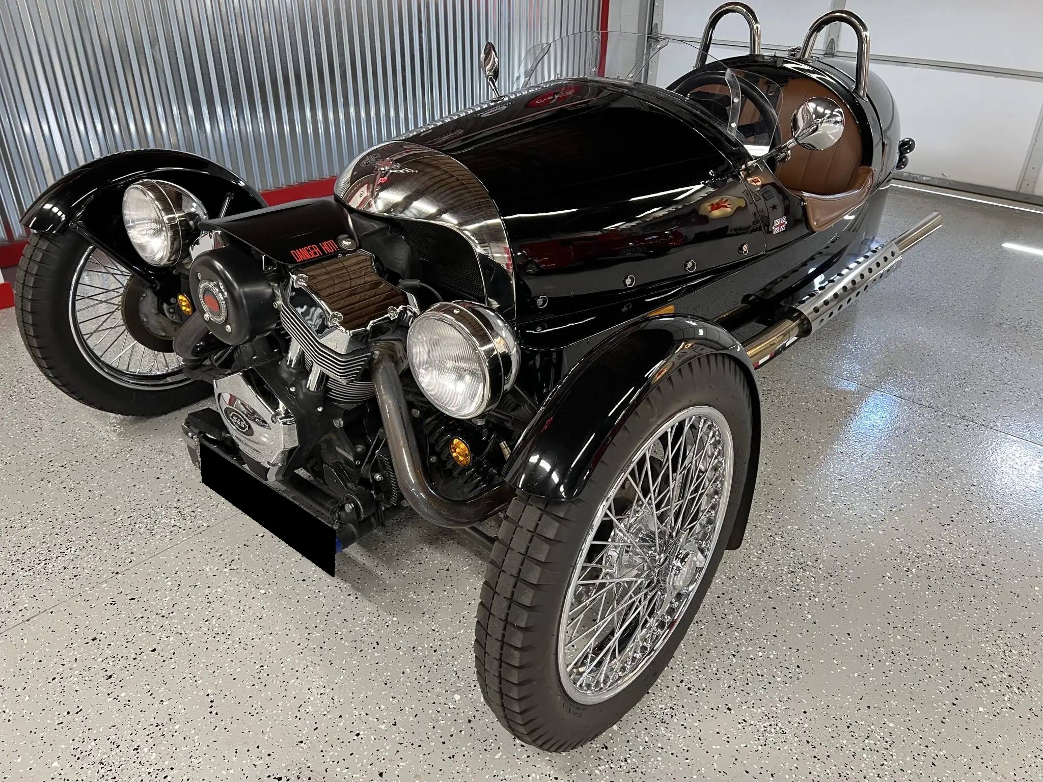Chrome center-locking wire wheels wear 4.00-19″ Blockley tires up front showing 2018 date codes, while a single 15″ wheel with a 175-series tire is mounted under the rear bodywork. Suspension consists of coil-overs mounted to the exposed double-wishbones up front as well as a motorcycle-style swingarm at the rear. Braking is handled by discs up front and a drum at the rear.